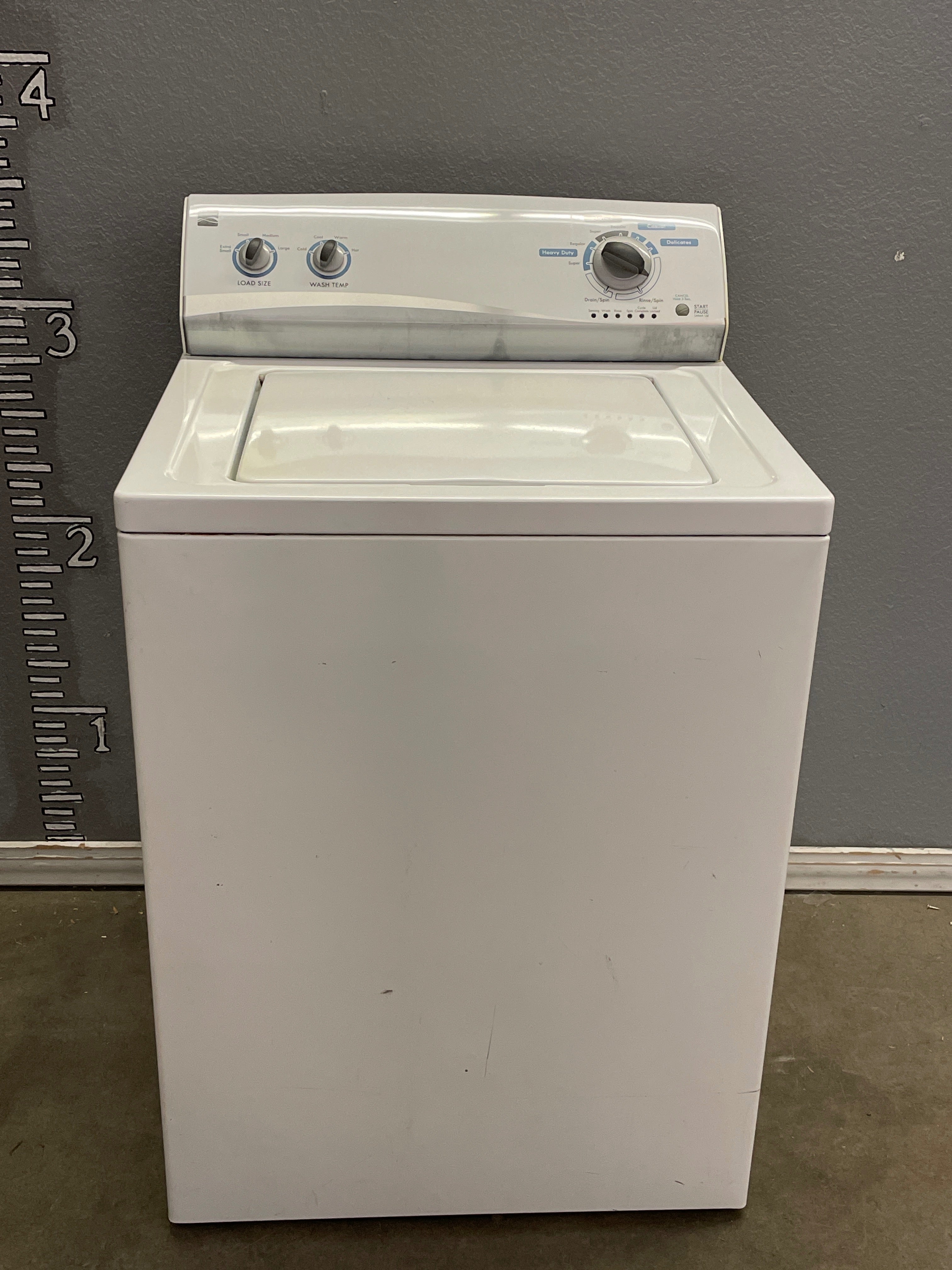Classic white top-load washing machine with a durable, sleek finish. Features intuitive control knobs for easy operation. Approximate Size: 3.5 x 2 x 2.5