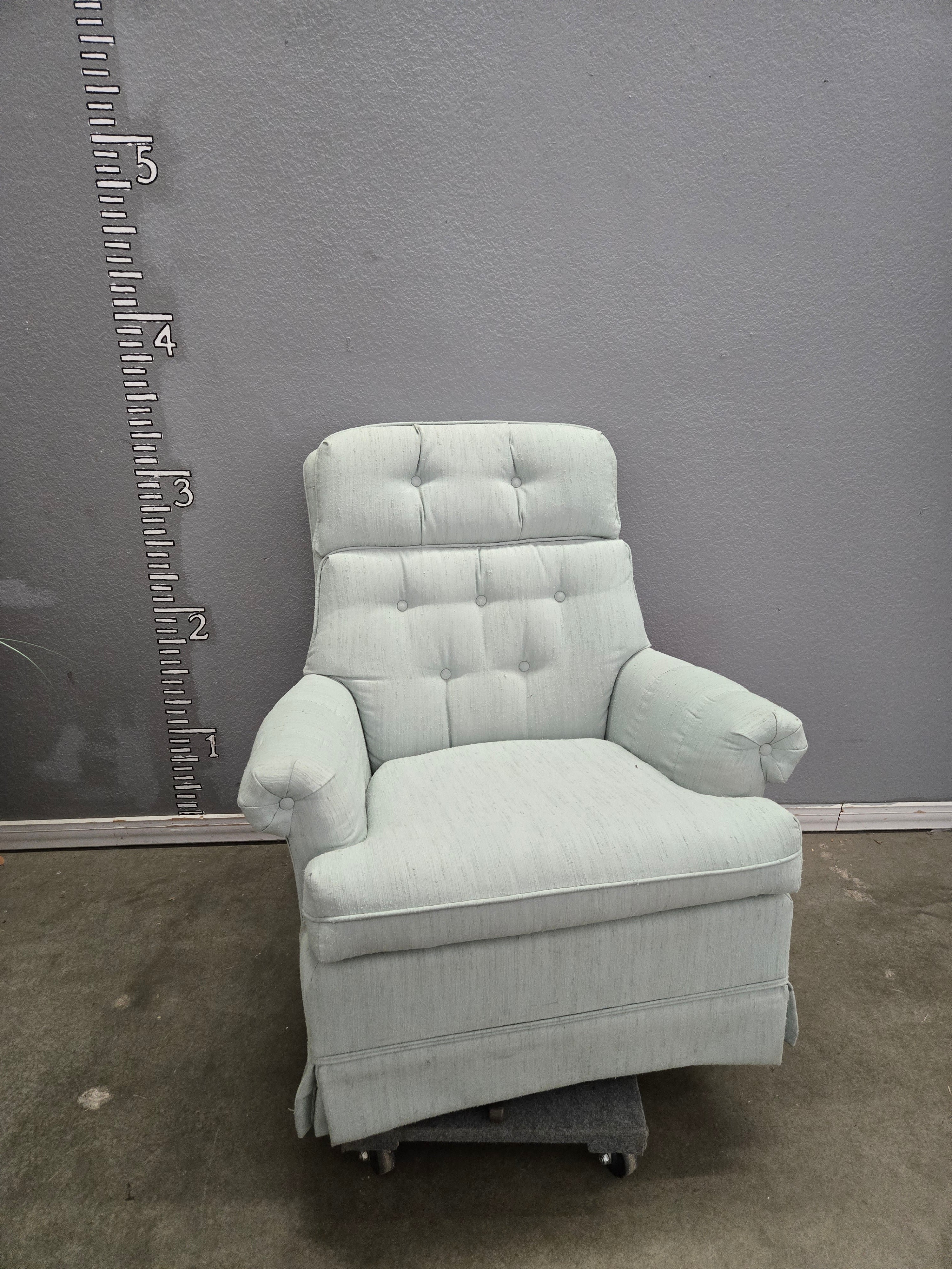 This charming vintage armchair features a light blue fabric with a tufted back, providing a classic and comfortable seating option. Its soft upholstery adds a touch of elegance to any room. Approximate Size: 3.5 x 2.5 x 3