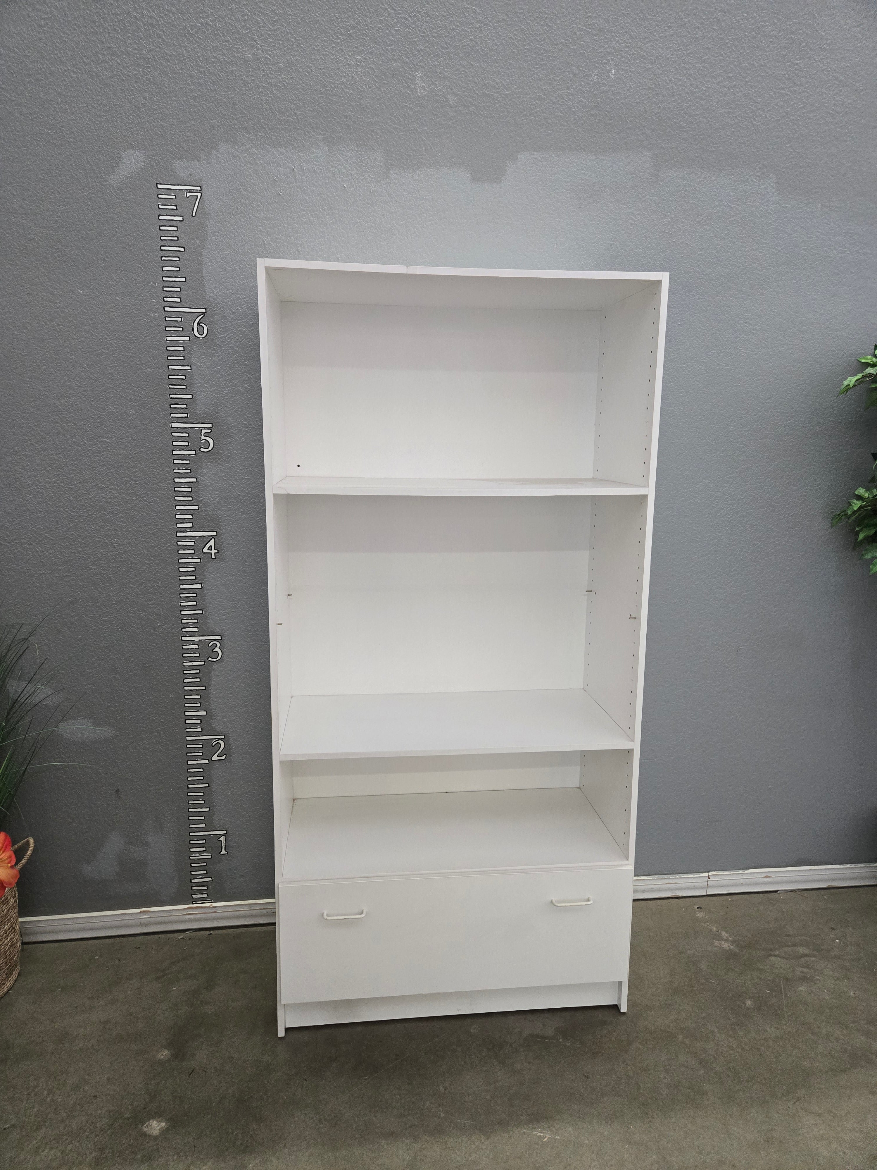 This sleek and minimalist white bookcase features a smooth matte finish and includes three spacious shelves with a convenient drawer at the bottom. Perfect for organizing books and décor. Approximate Size: 6 x 3 x 1