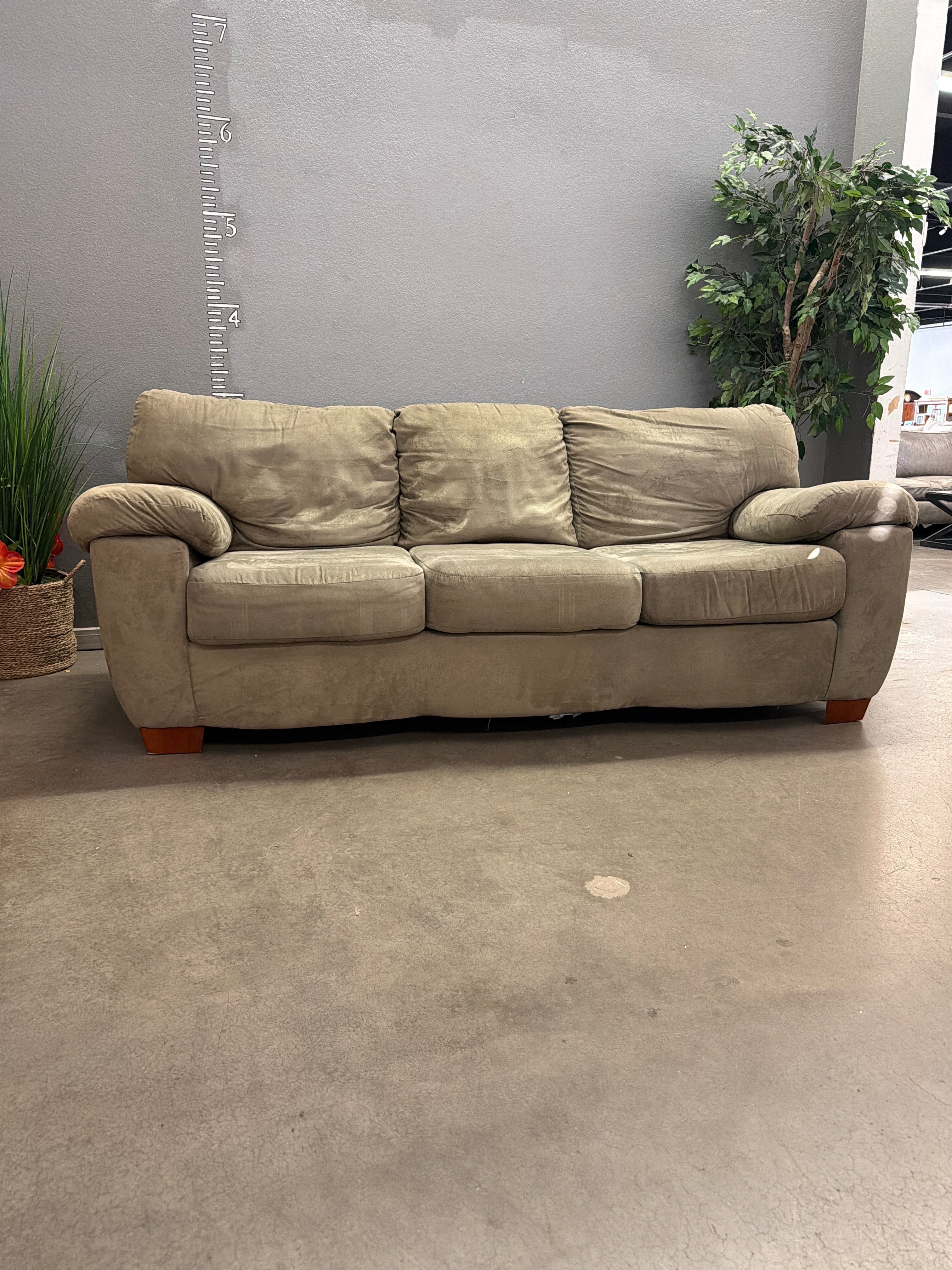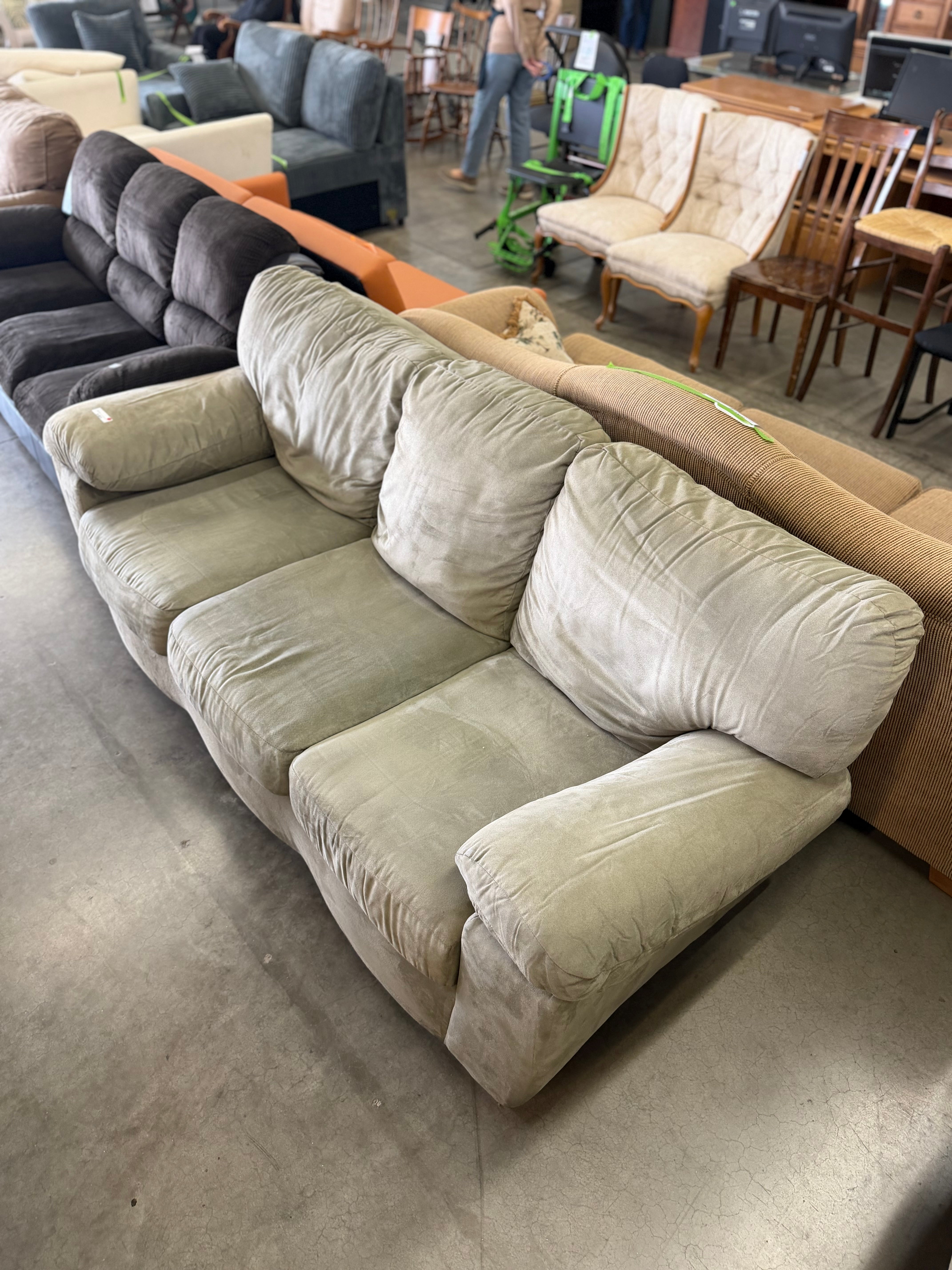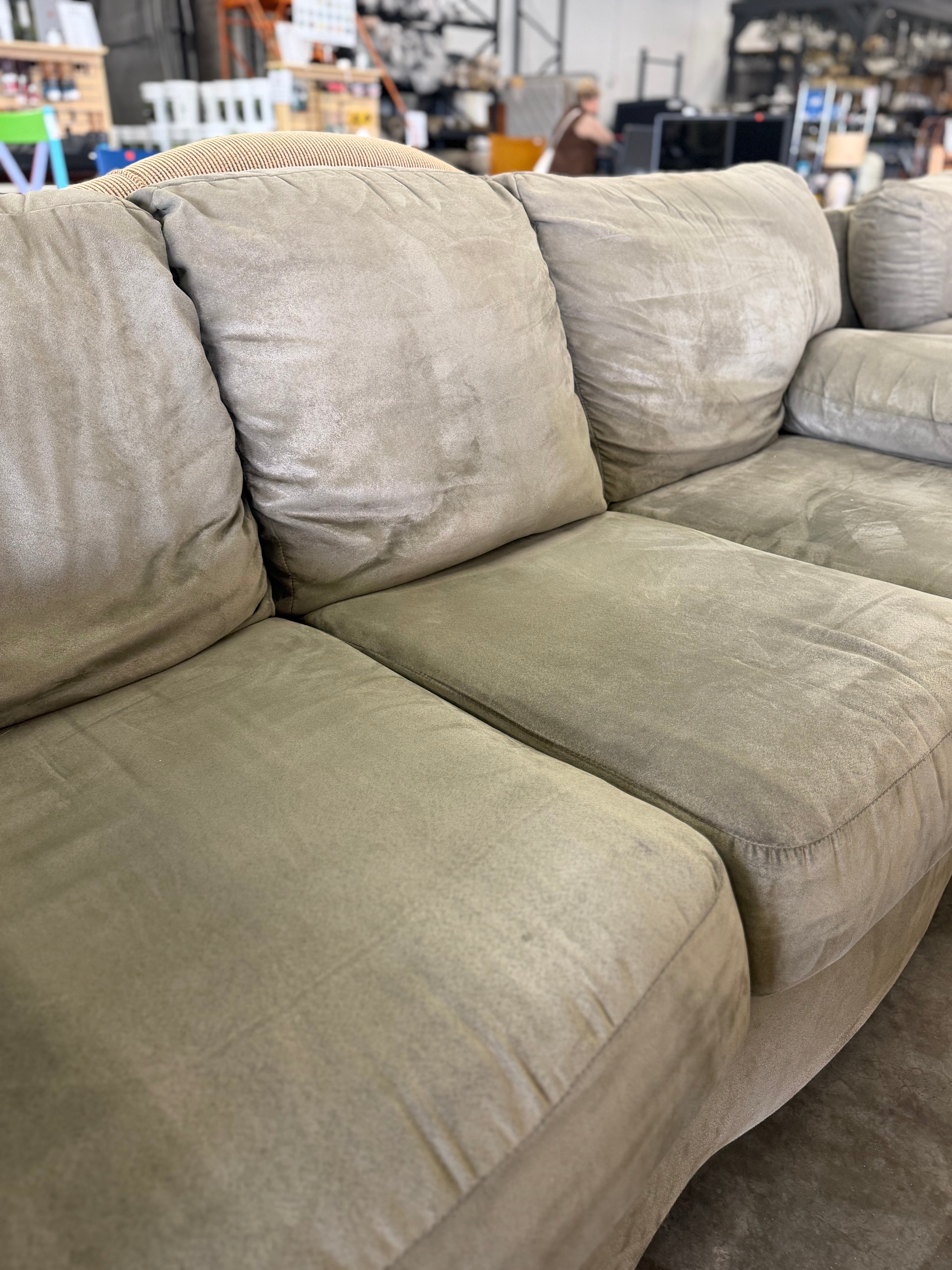 This plush sofa features a soft, olive green fabric with a matte finish, perfect for adding a cozy touch to any living room decor. Approximate Size: 3 x 6.5 x 3