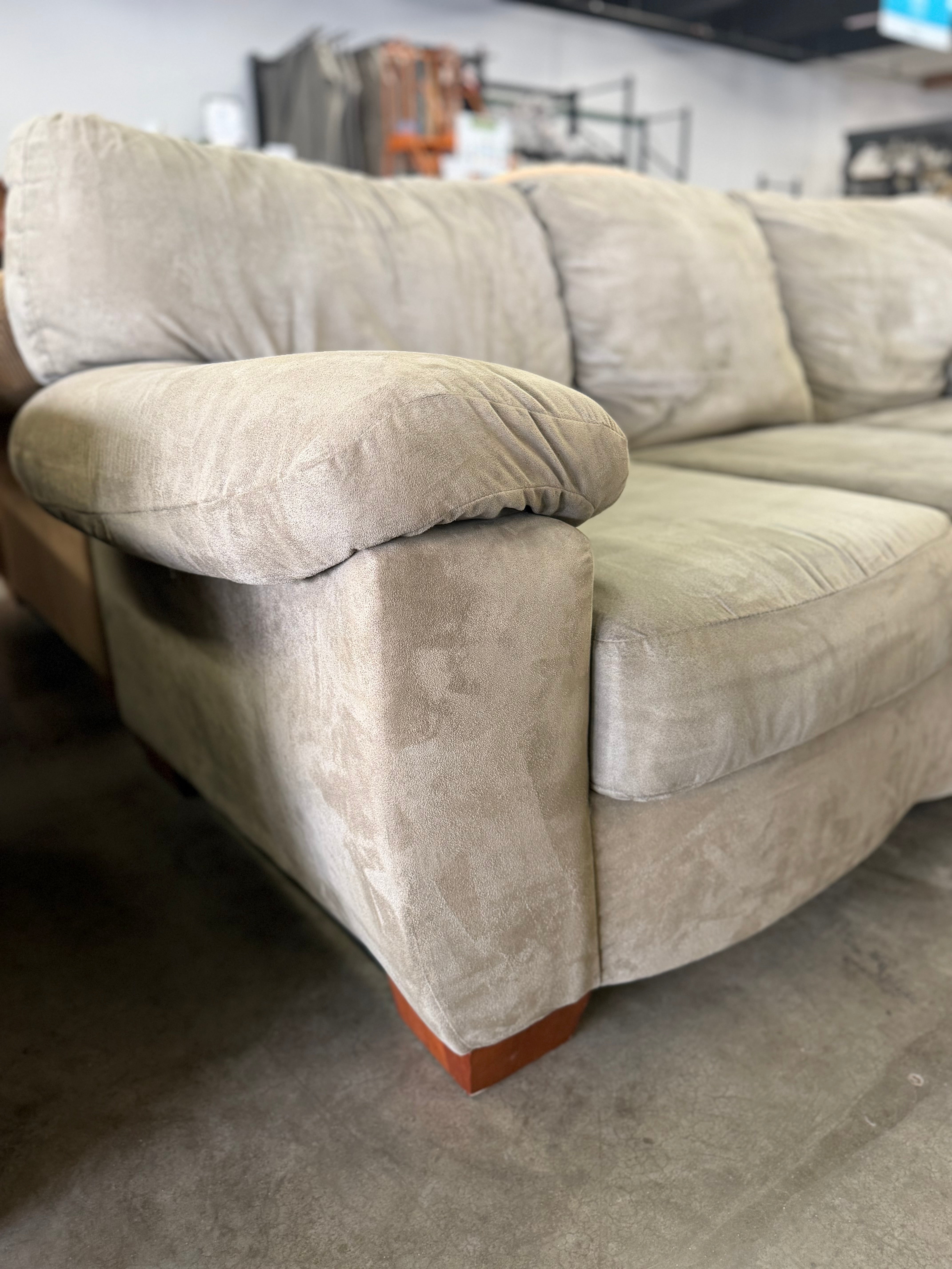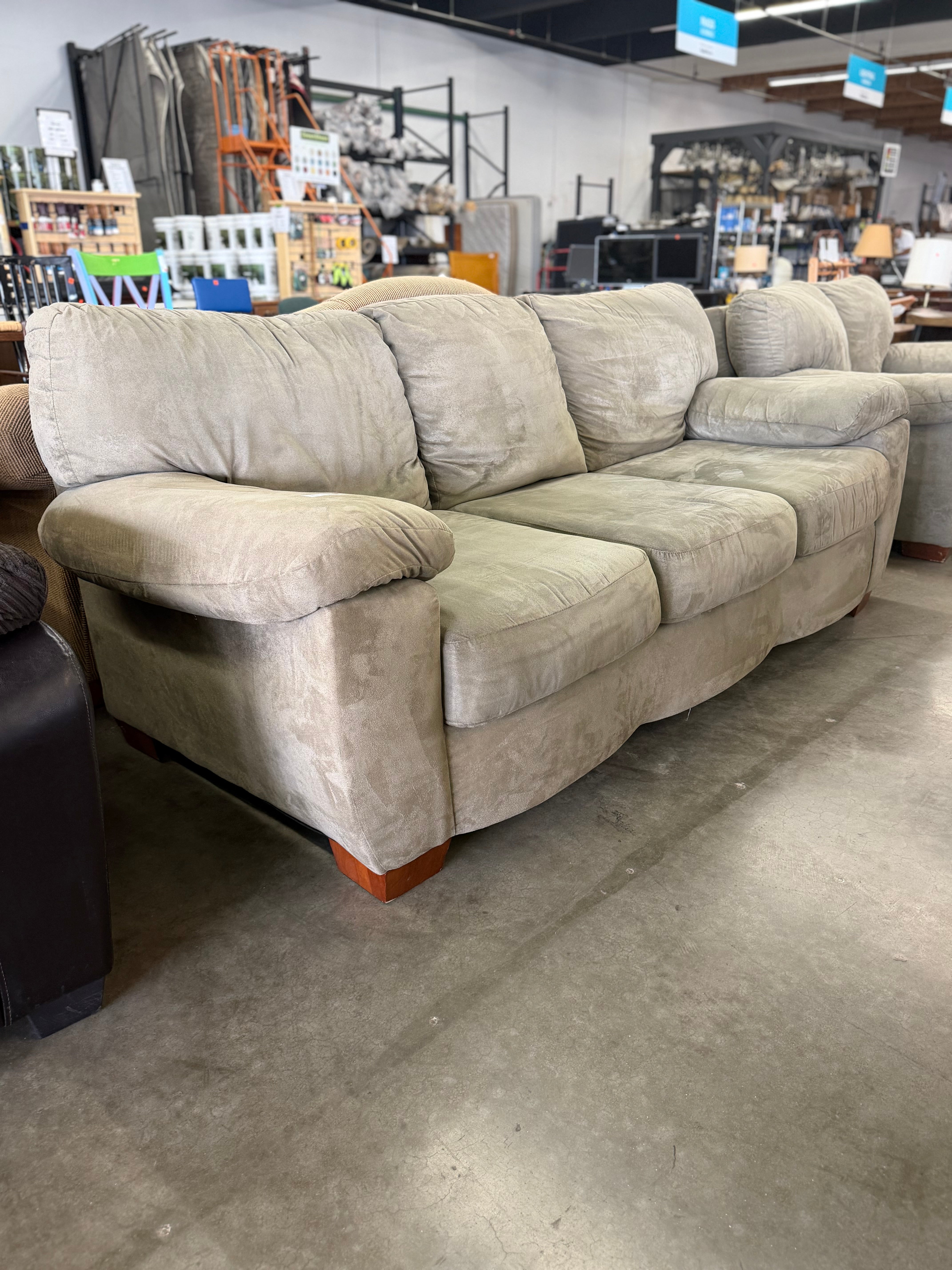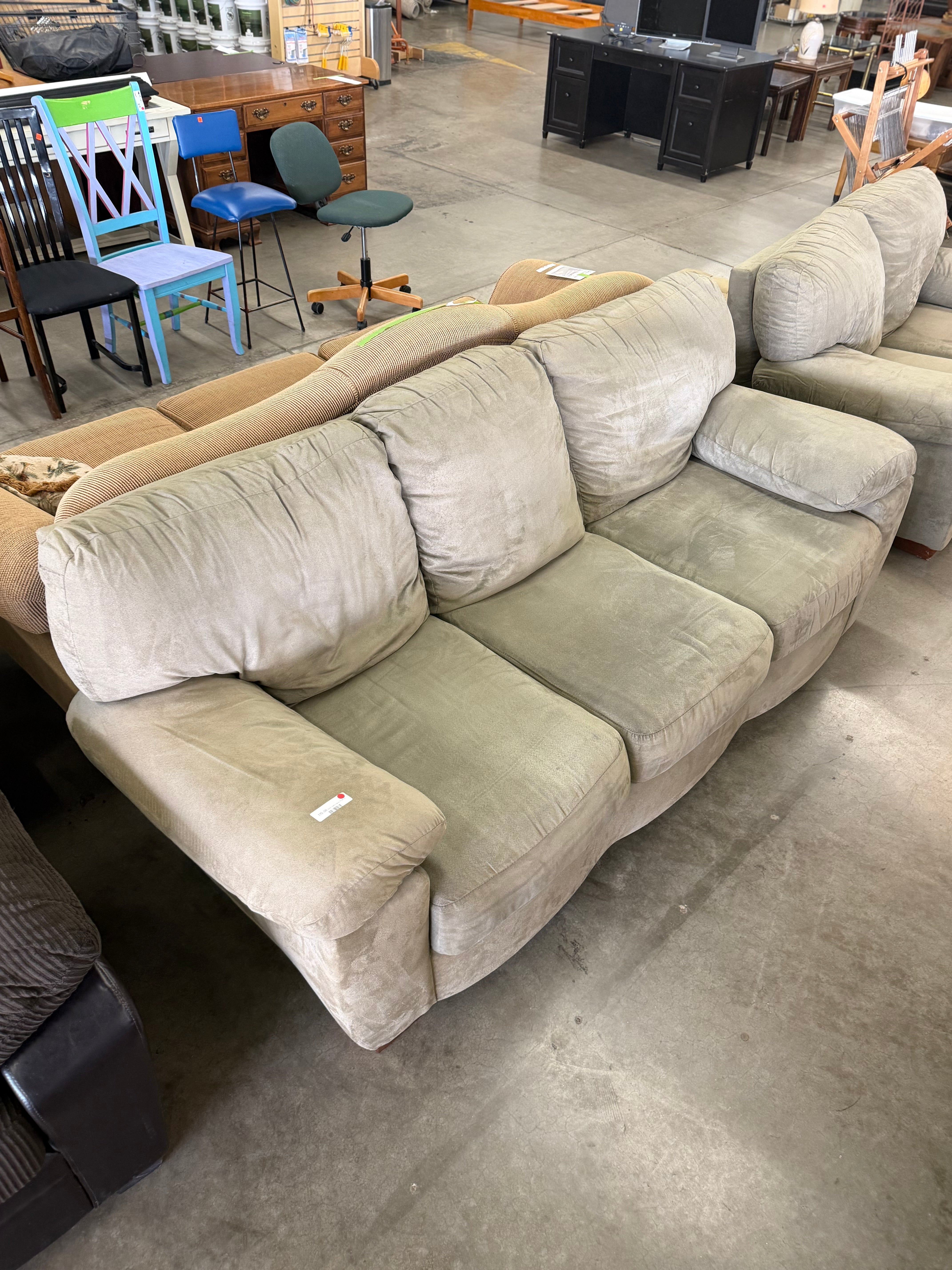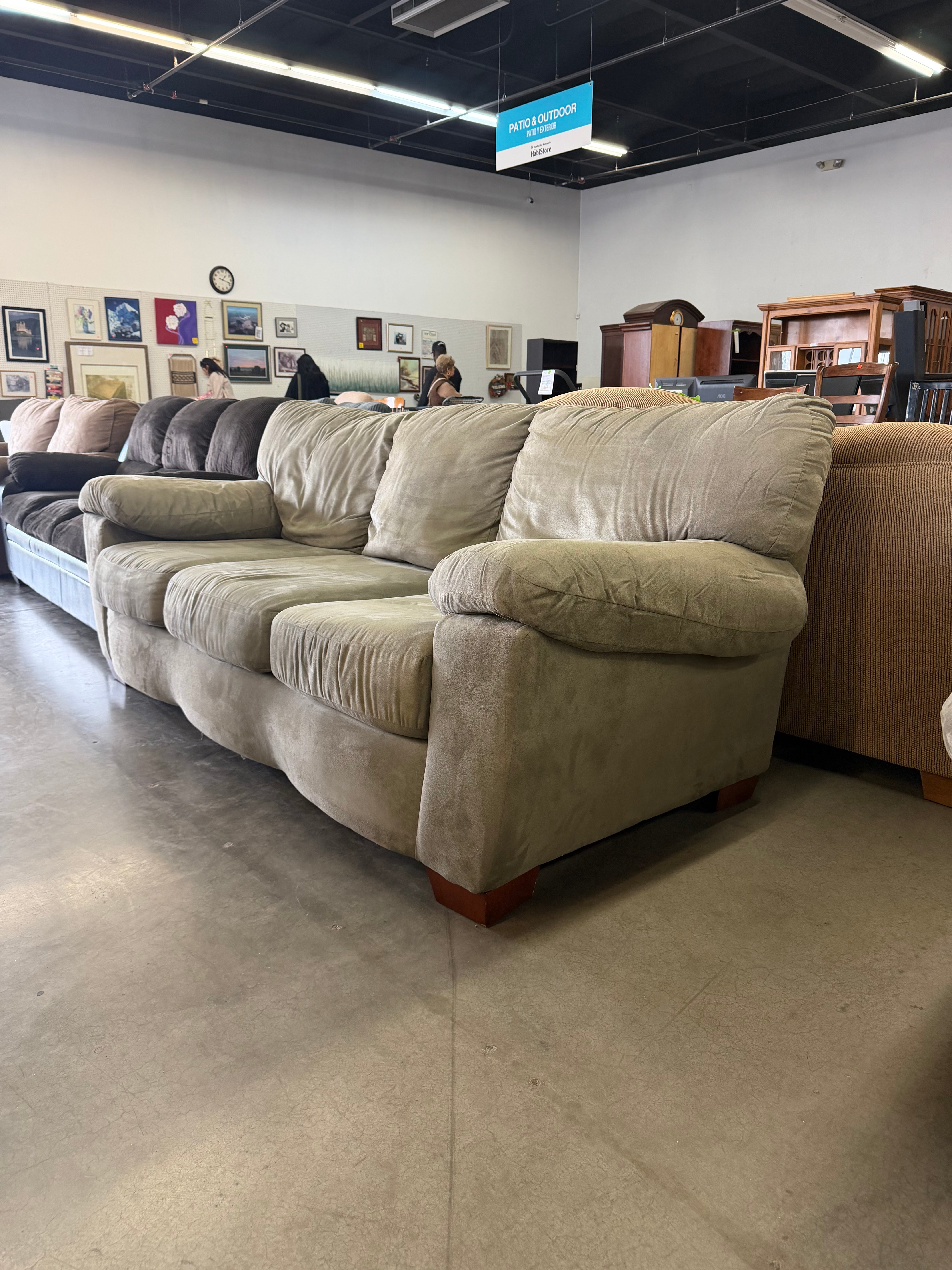 This plush sofa features a soft, olive green fabric with a matte finish, perfect for adding a cozy touch to any living room decor. Approximate Size: 3 x 6.5 x 3