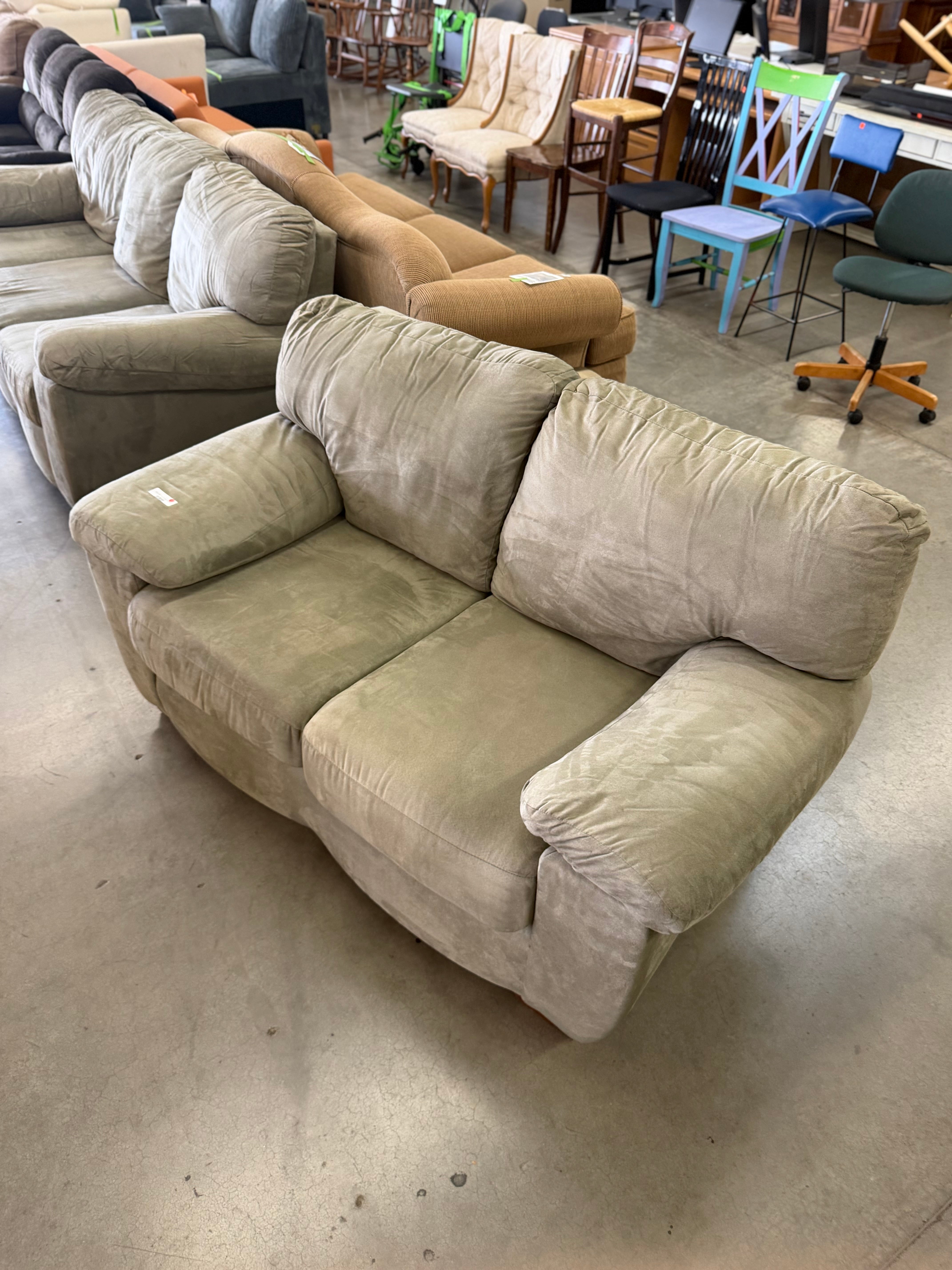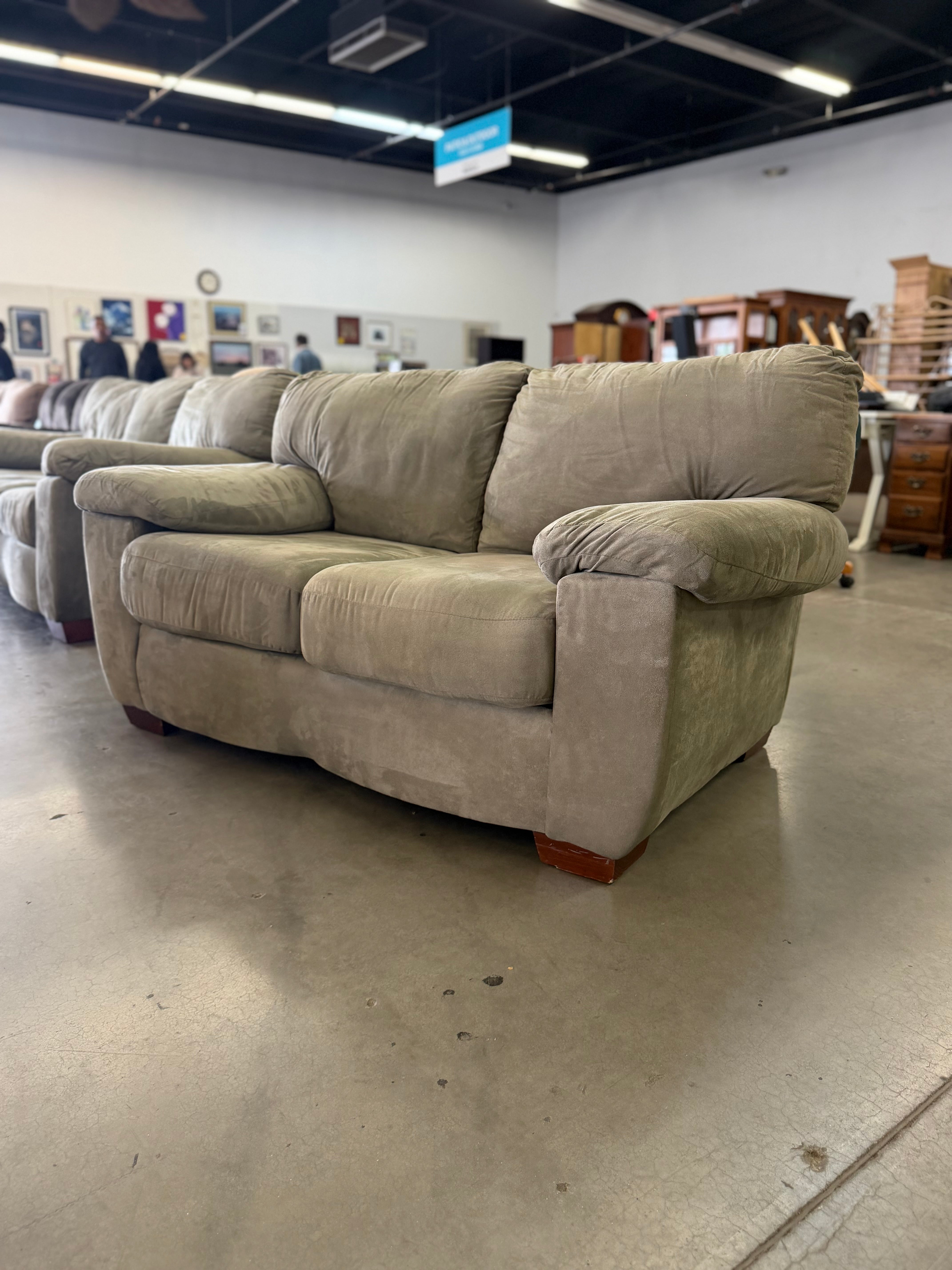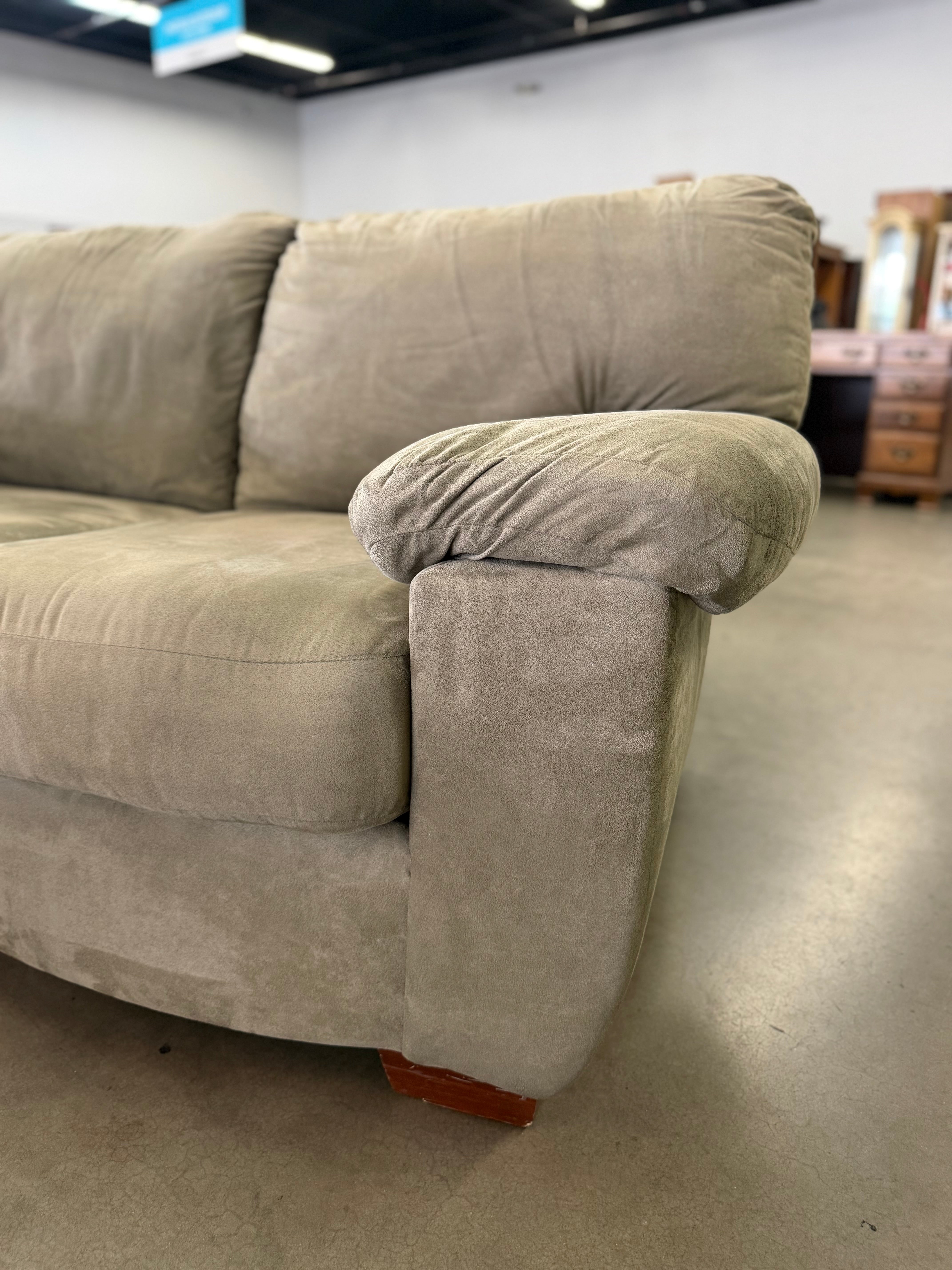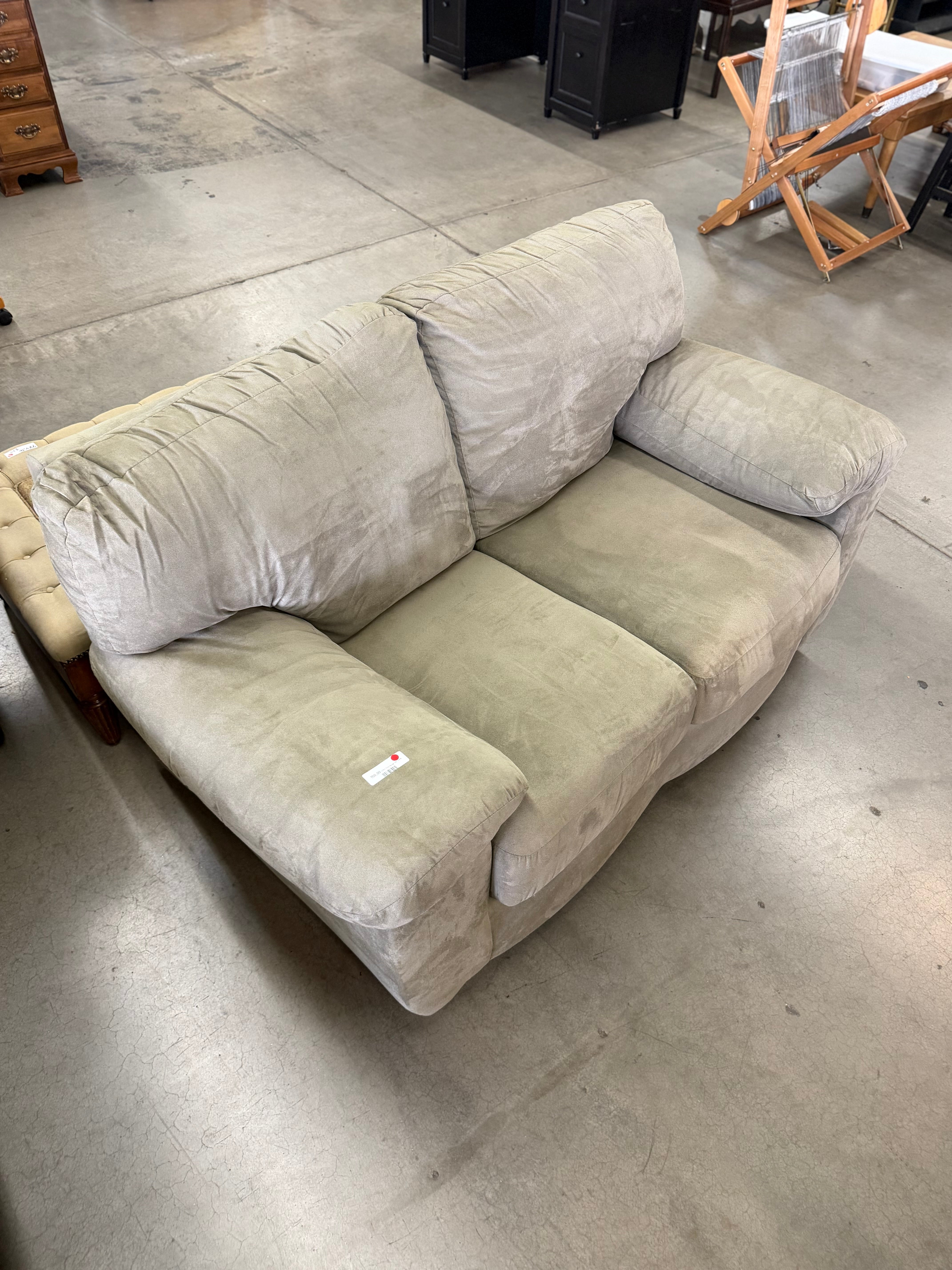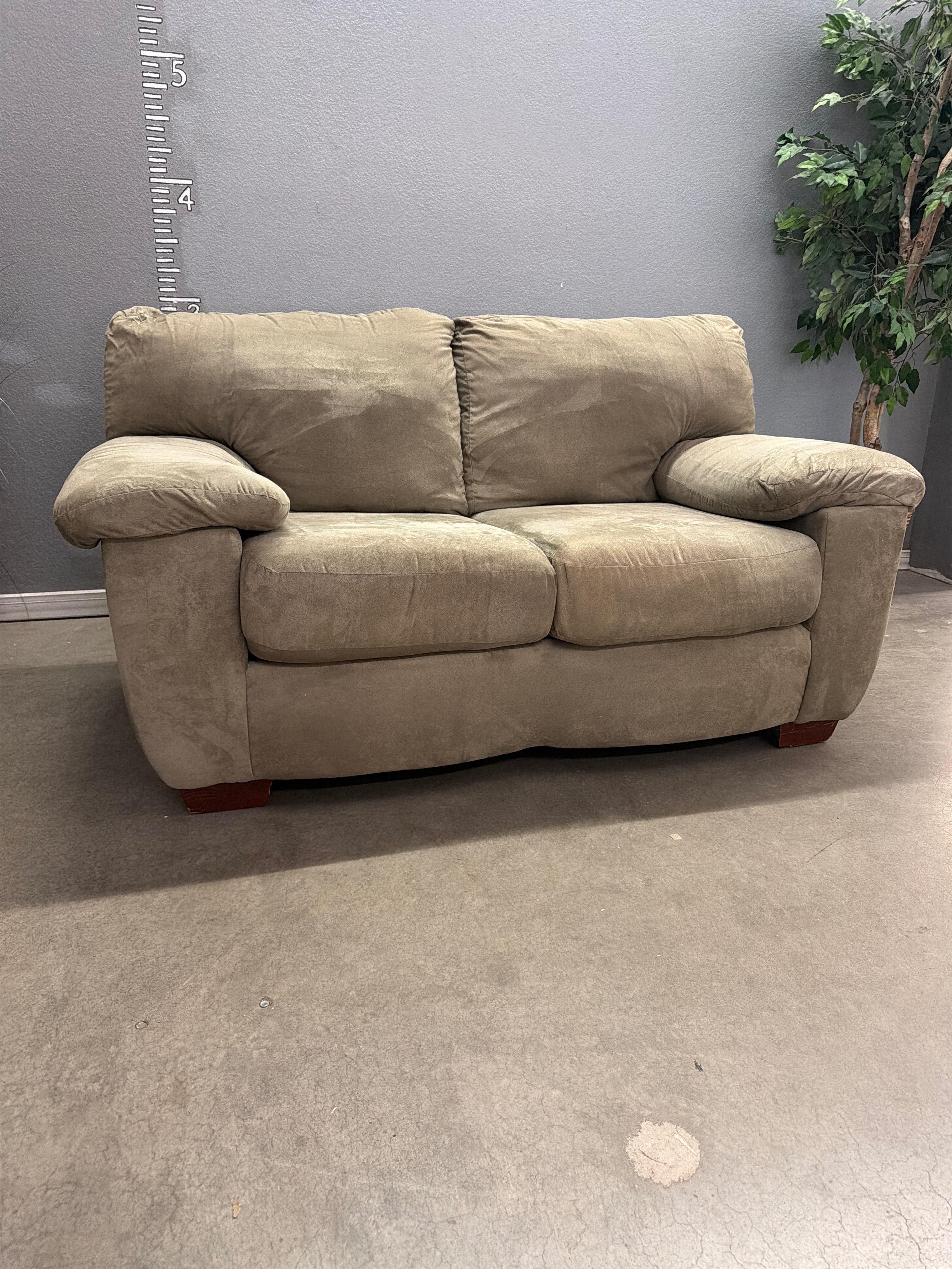 This plush two-seater loveseat features a soft beige fabric with a smooth, velvety finish. Its inviting design and comfortable cushions make it a perfect addition to any living room. Approximate Size: 2.5 x 5 x 3