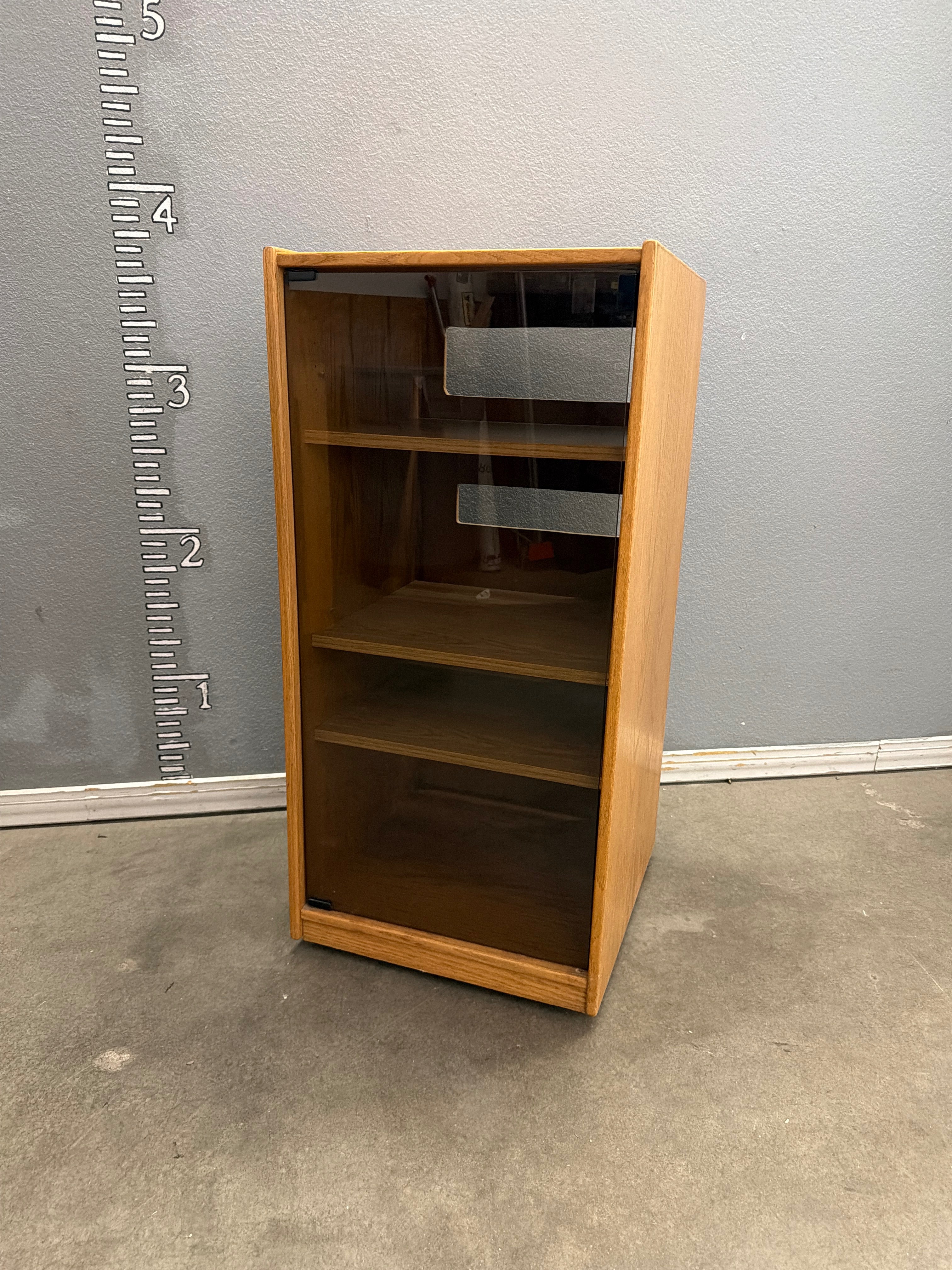 This vintage audio cabinet features a warm oak finish with a sleek glass door. It has multiple shelves for optimal storage of audio equipment. Approximate Size: 3.5 x 1.5 x 1.5