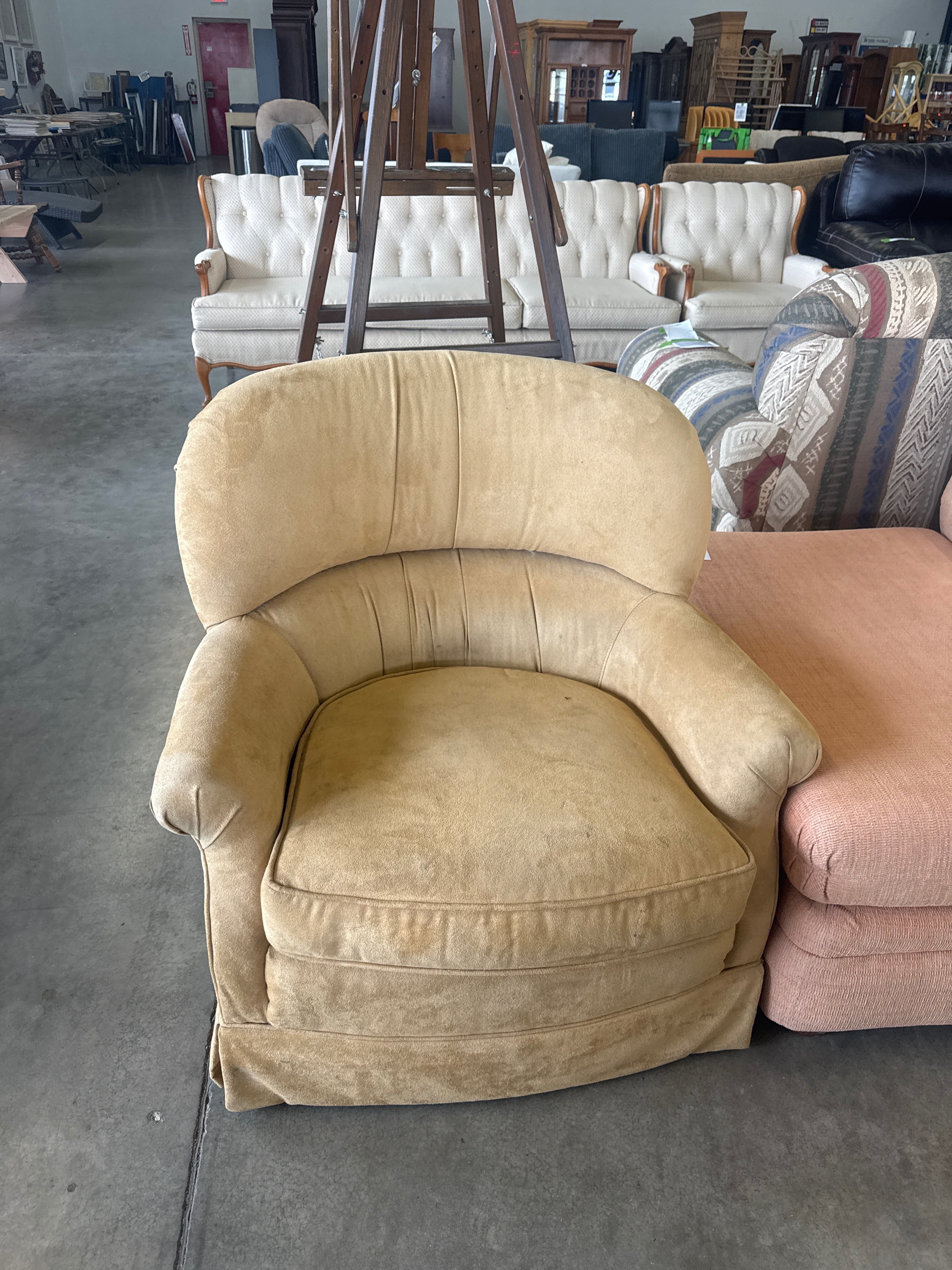 This vintage armchair features a soft beige fabric with a plush finish, perfect for adding a touch of comfort and style to any room. Approximate Size: 3 x 2.5 x 2.5