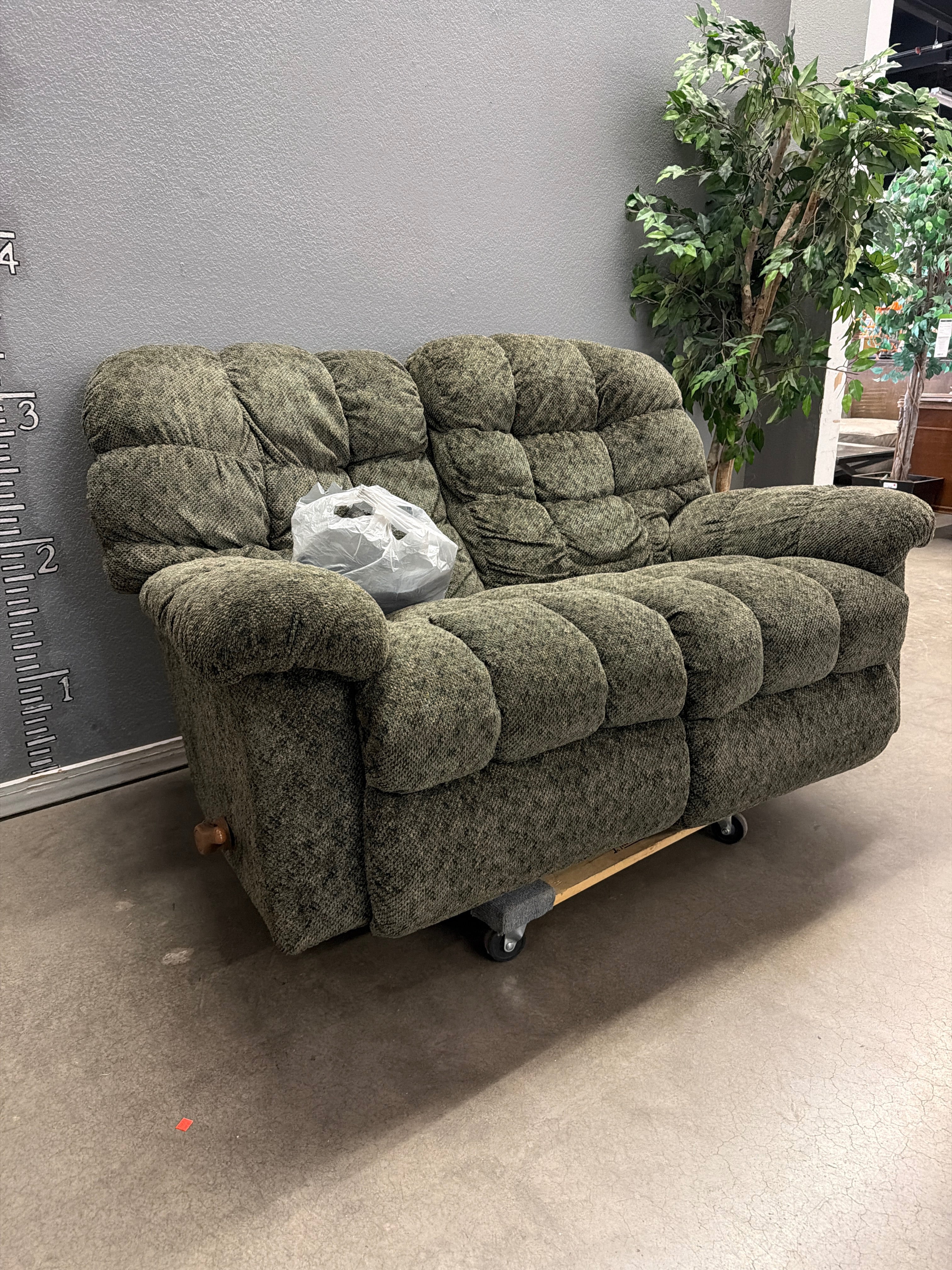 This comfortable loveseat recliner comes in a textured olive green fabric with a plush finish, perfect for enhancing your living room's coziness. Approximate Size: 3 x 5 x 3
