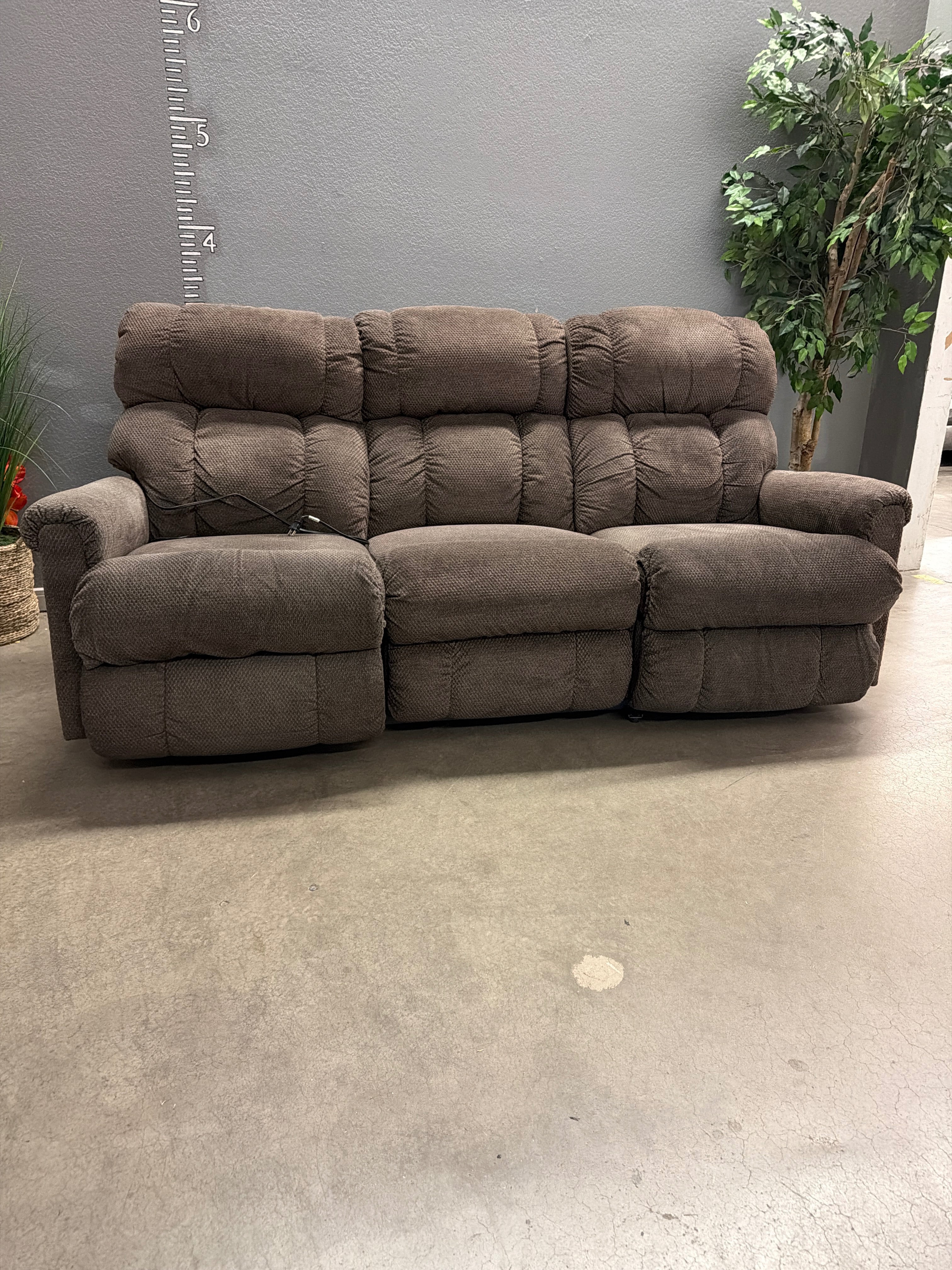 This plush reclining sofa features a rich brown fabric with a soft, textured finish. Perfect for relaxing, it offers premium comfort and support. Approximate Size: 3 x 6.5 x 3