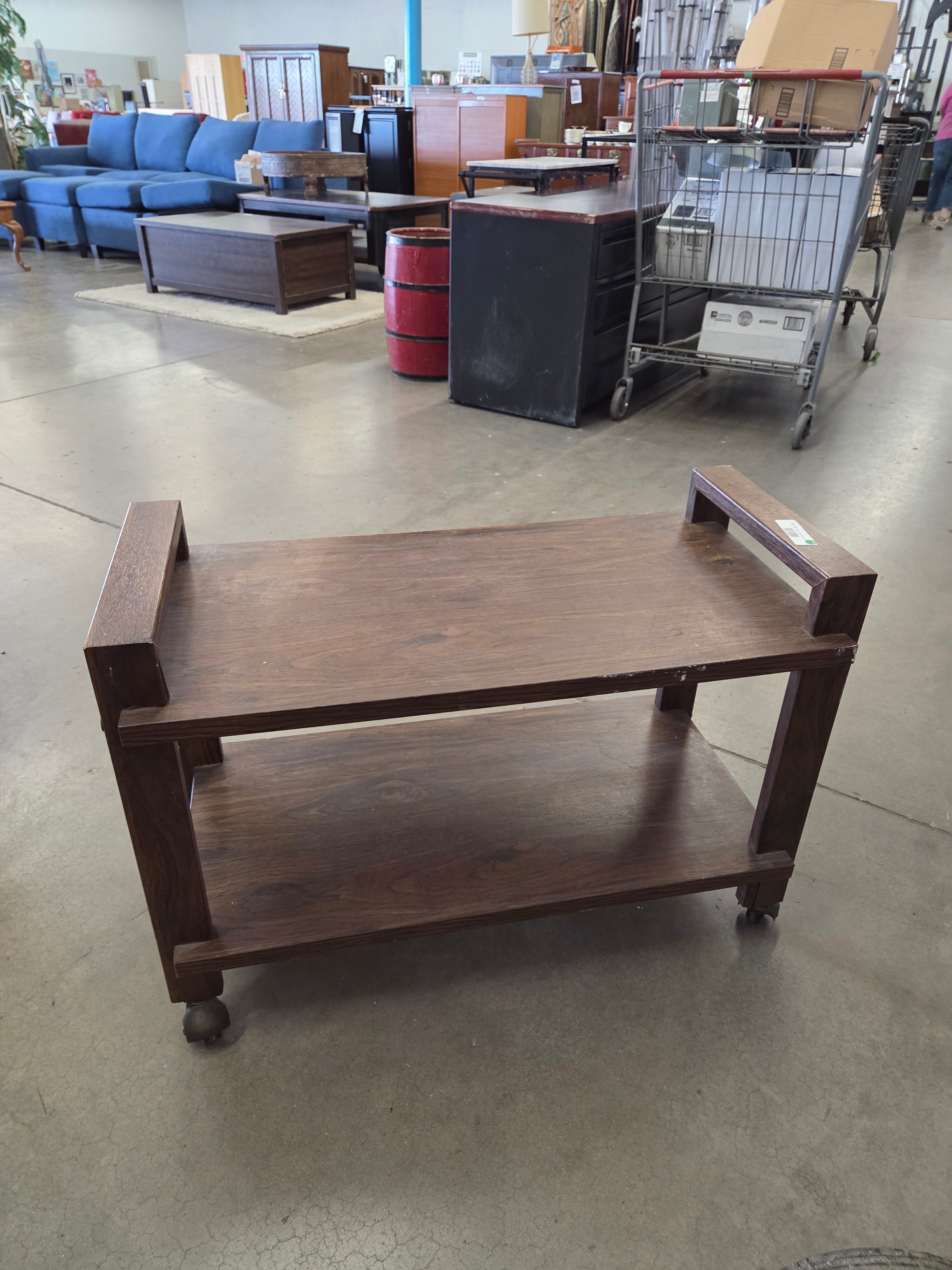 A versatile wooden cart with a rich brown finish, featuring two shelves for extra storage. Perfect for organizing your living space. Approximate Size: 3 x 2.5 x 1.5