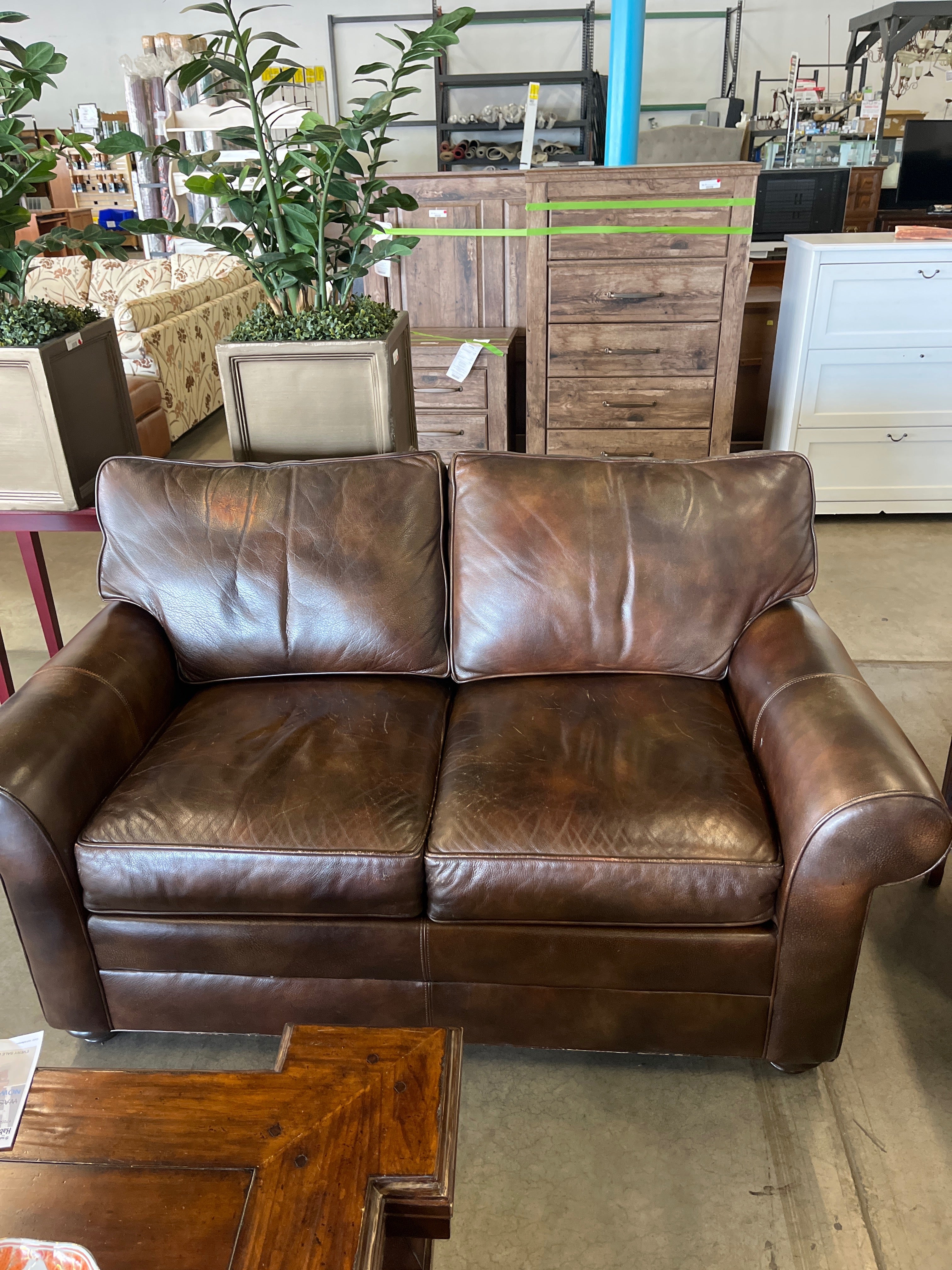 This elegant sofa features a rich brown leather upholstery with a smooth finish, perfect for adding a touch of classic style to your living room. Approximate Size: 2.5 x 5 x 3