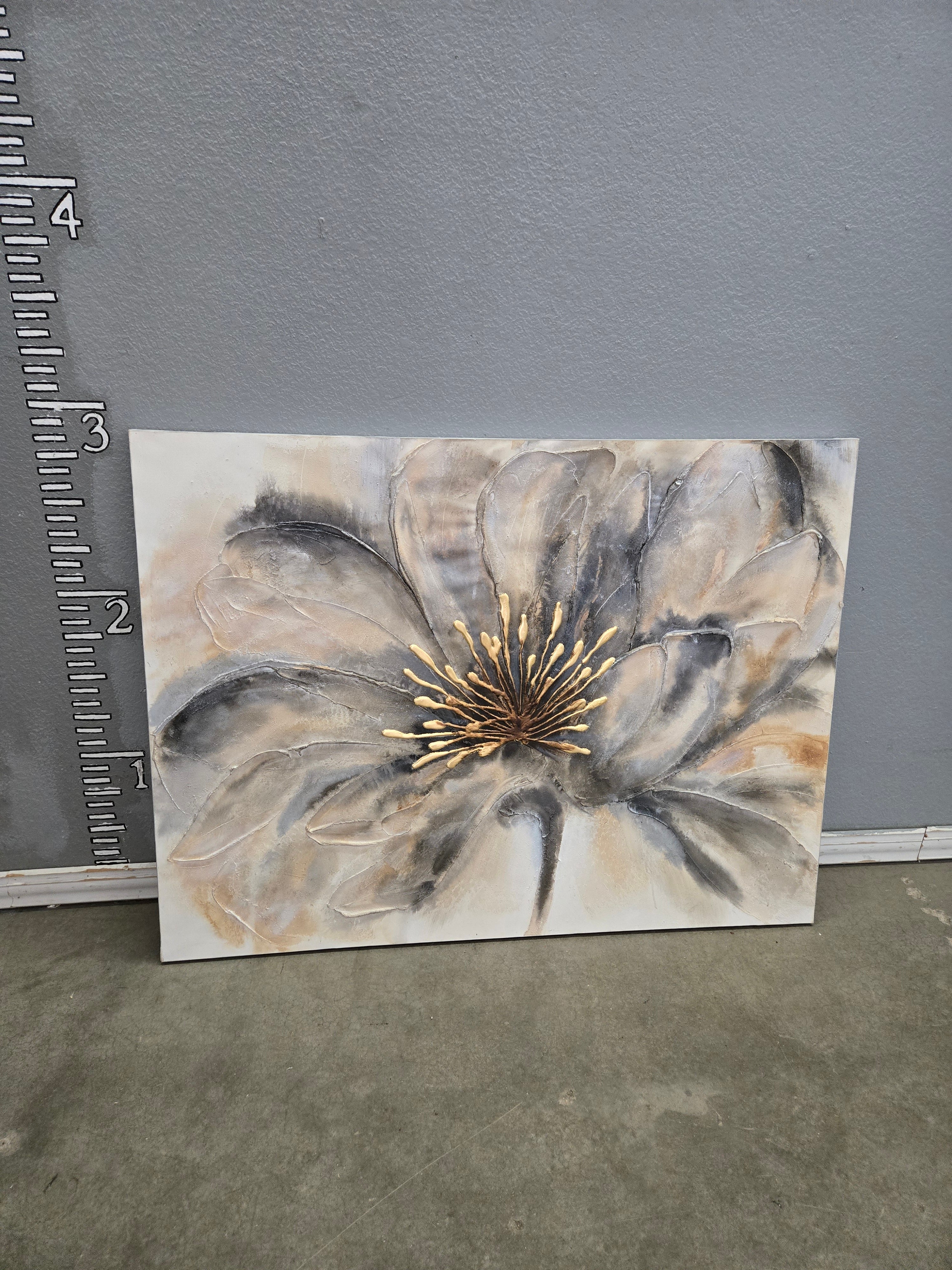 This stunning abstract floral canvas features a blend of muted grays, blues, and gold tones with a textured finish. The eye-catching design adds elegance and character to any space. Approximate Size: 2 x 3 x 0.1