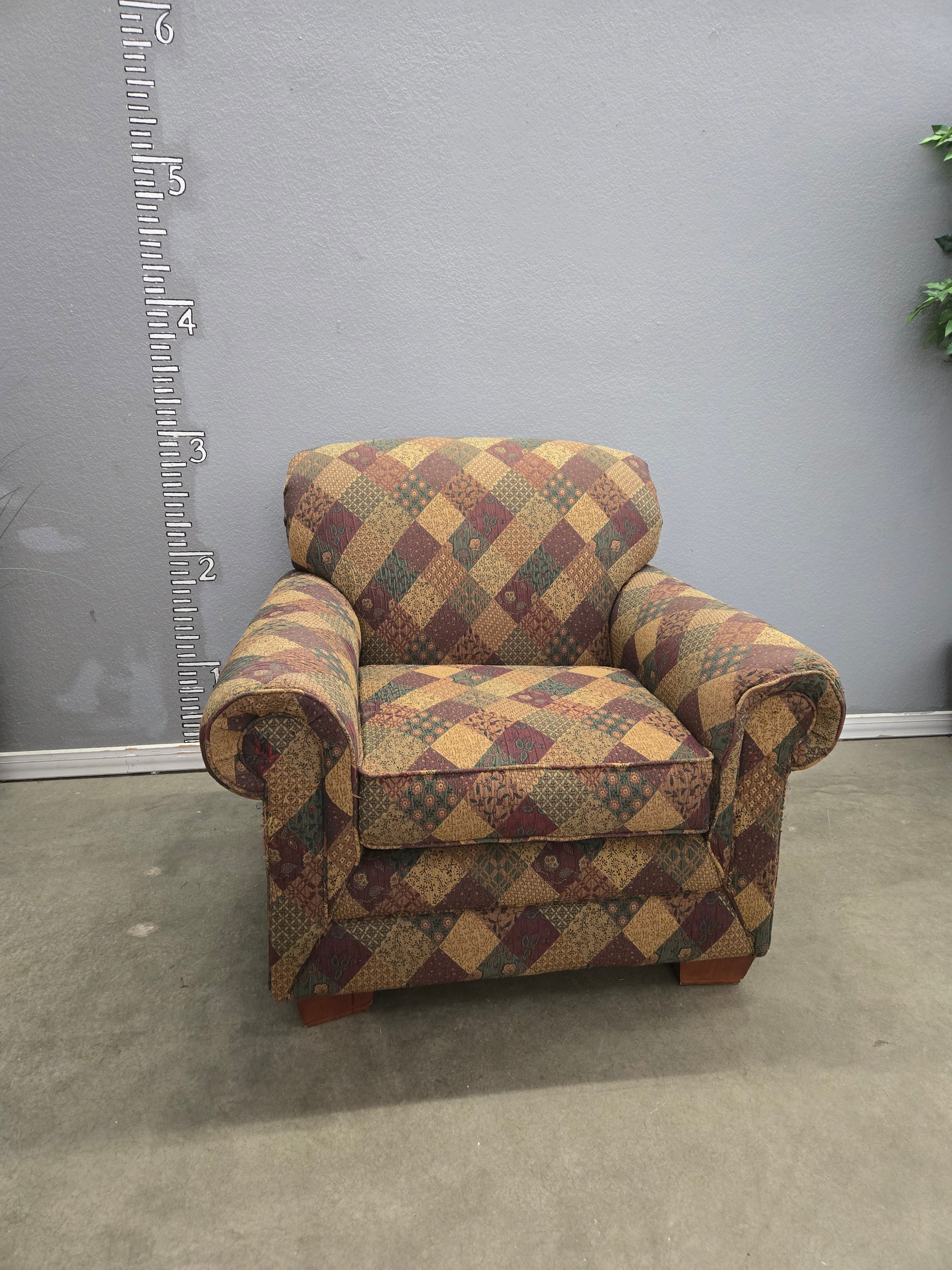 This charming armchair features a multicolored patchwork design with rich earth tones. The upholstery fabric is a durable woven material, offering both comfort and style with a smooth finish. Approximate Size: 3 x 3 x 3