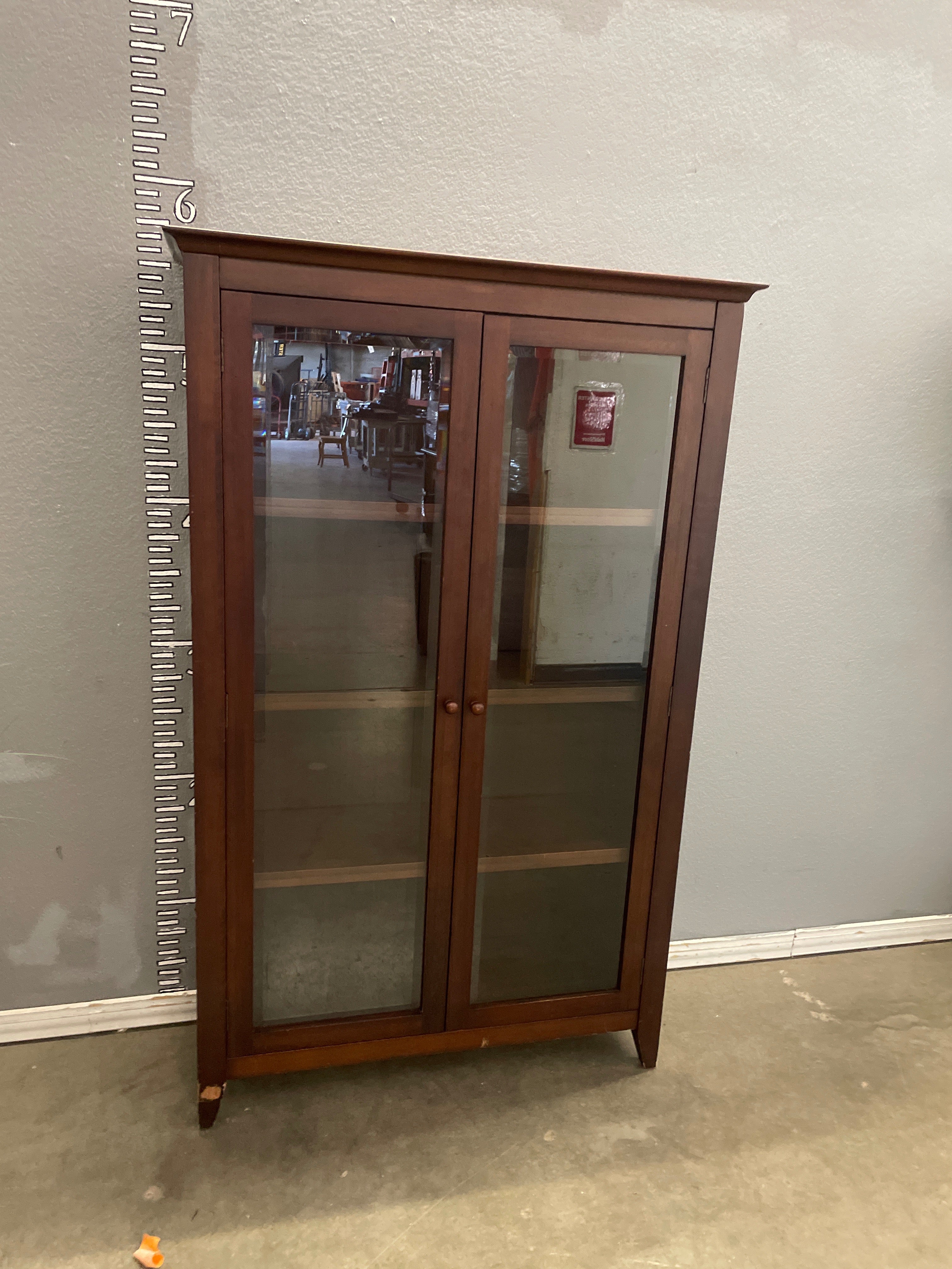A classic tall cabinet with glass doors and a rich brown wood finish. Perfect for displaying collectibles or storing books with style. Approximate Size: 6 x 3 x 1.5