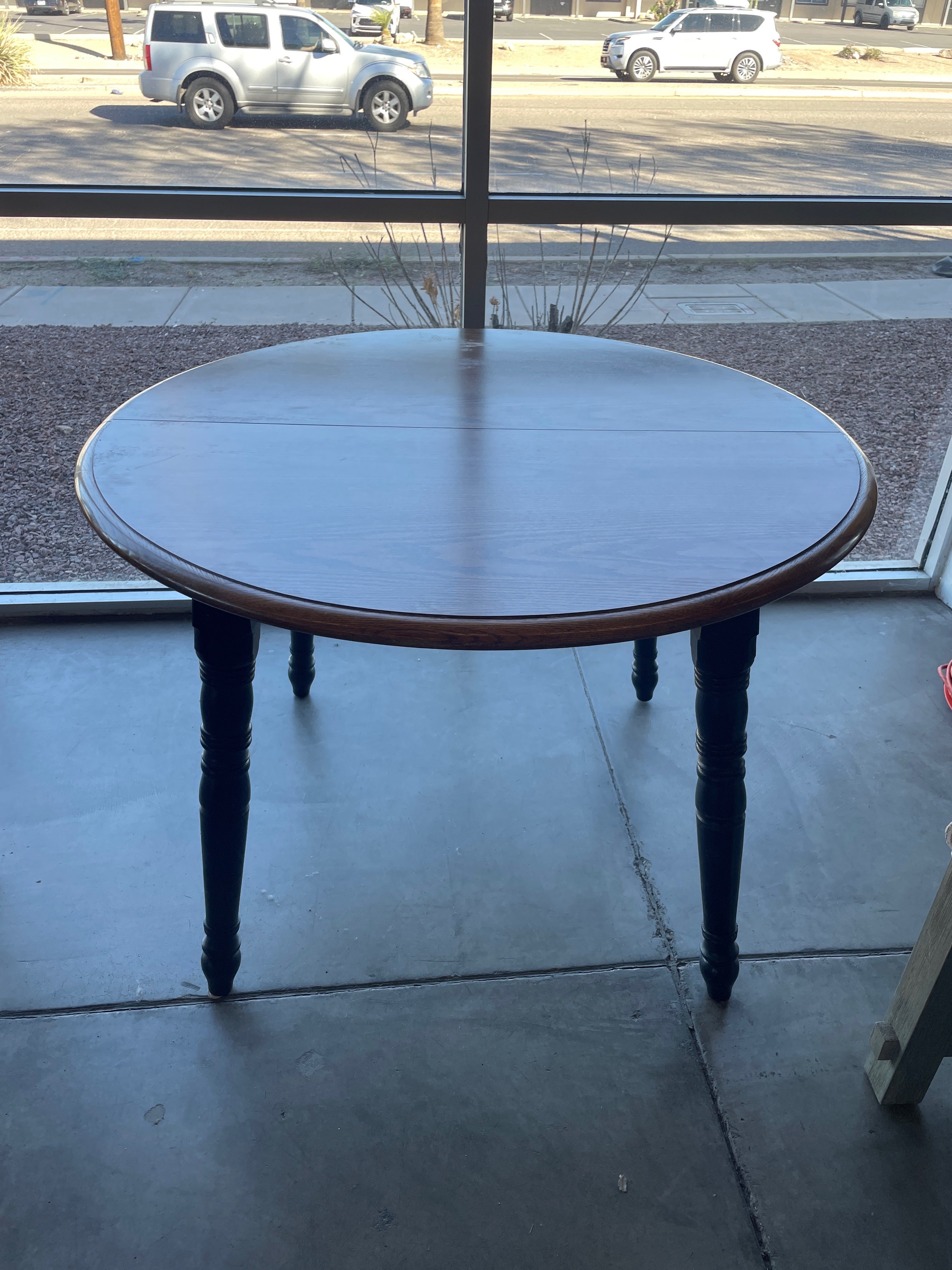 A charming round dining table featuring a smooth wooden top with a rich brown finish and elegant black legs. The table's classic design adds a touch of timeless elegance to any dining space. Approximate Size: 2.5 x 3.5 x 3.5
