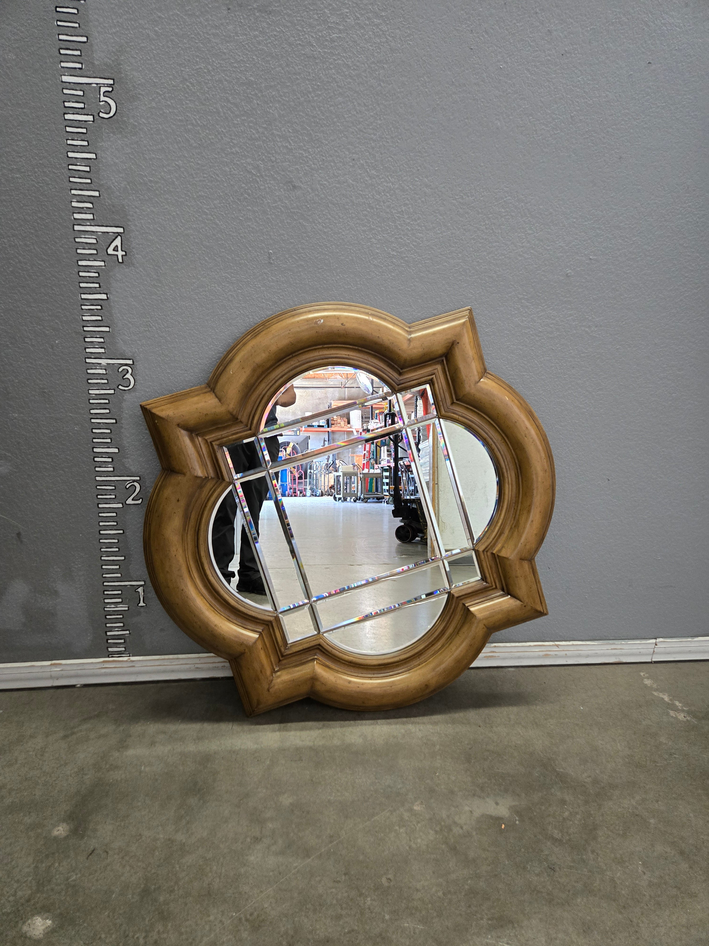 This elegant quatrefoil mirror features a striking wooden frame with a warm brown finish. The mirror adds a touch of sophistication and style to any space, effortlessly complementing various decor themes. Approximate Size: 4 x 3 x 0.5