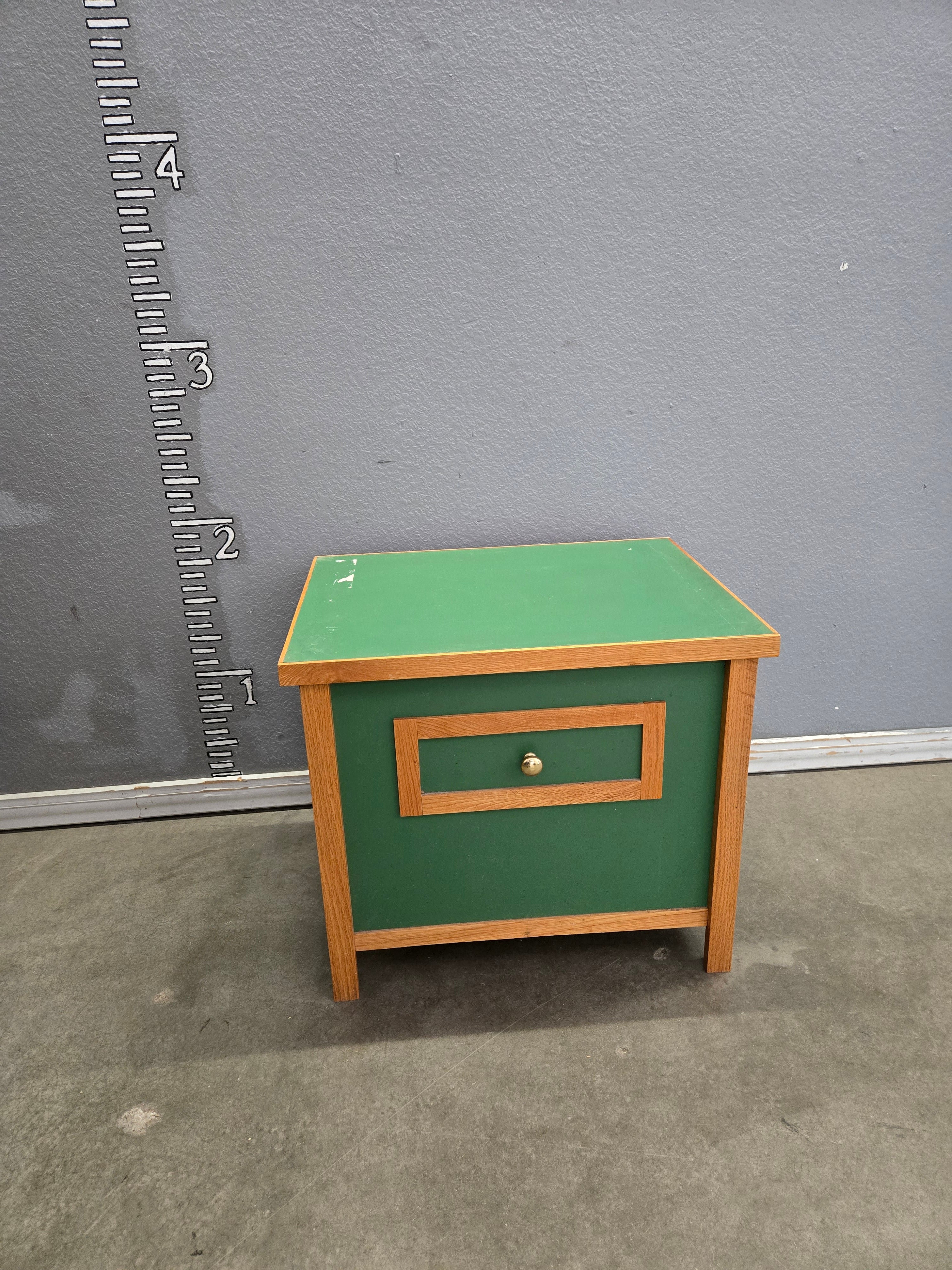 This charming vintage side table features a green painted finish complemented by natural wood trim. The practical drawer comes with a classic brass knob, making it perfect for storing small items. Approximate Size: 1.5 x 1.5 x 1.5