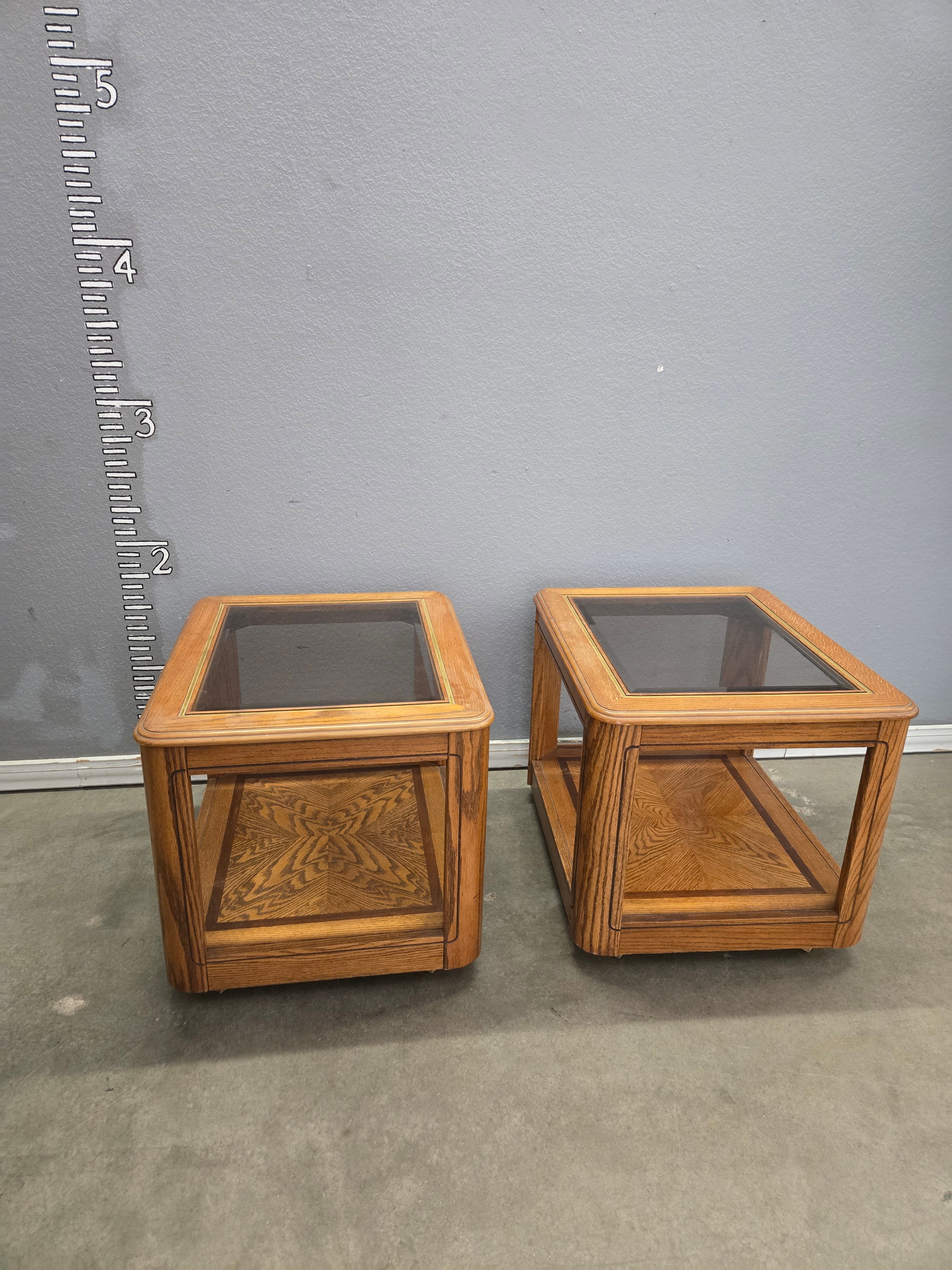 These elegant side tables feature a beautiful oak finish with a clear glass top. The oak provides a warm, natural look with a smooth finish, perfect for complementing a variety of home decor styles. Approximate Size: 2 x 2 x 2