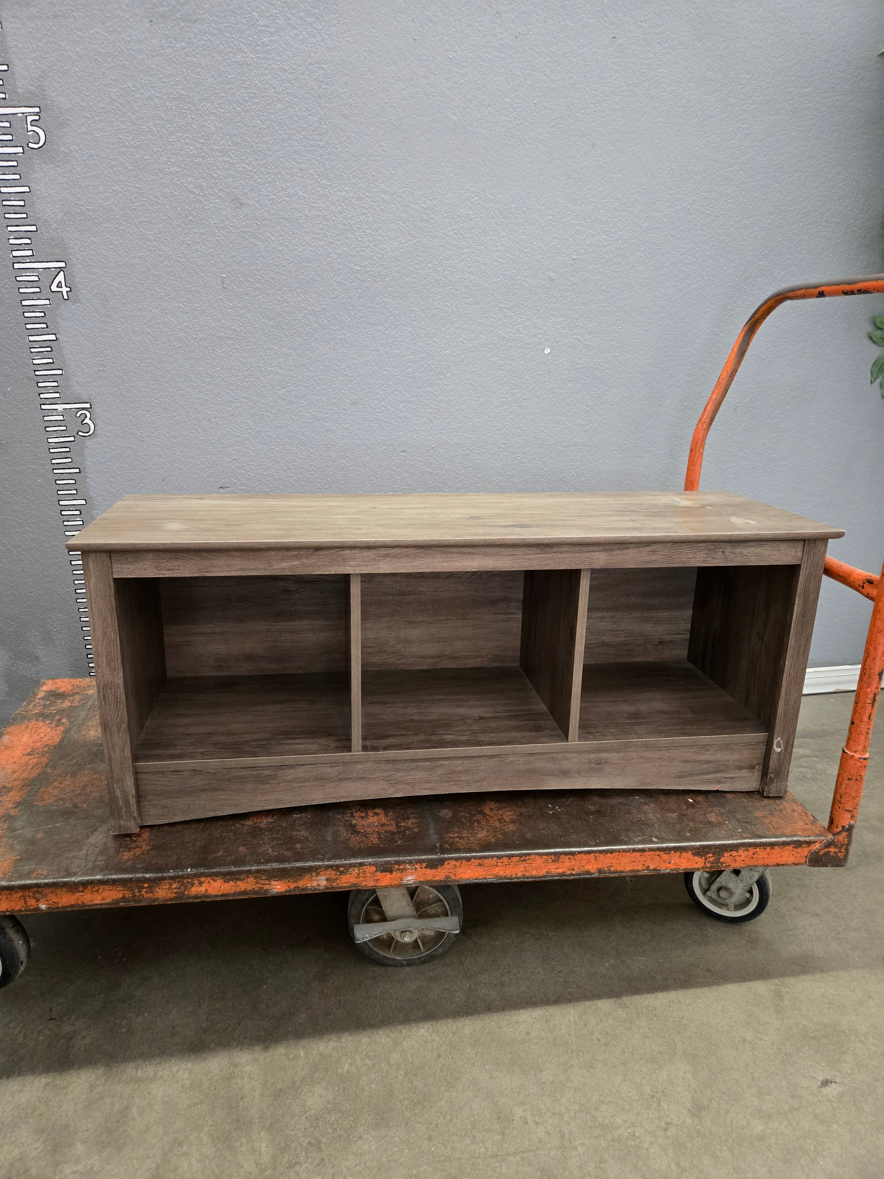 This charming storage bench is crafted from wood with a rustic brown finish, offering both functionality and style. It features three open cubbies perfect for organizing books, shoes, or decorative items. Approximate Size: 1.5 x 3 x 1