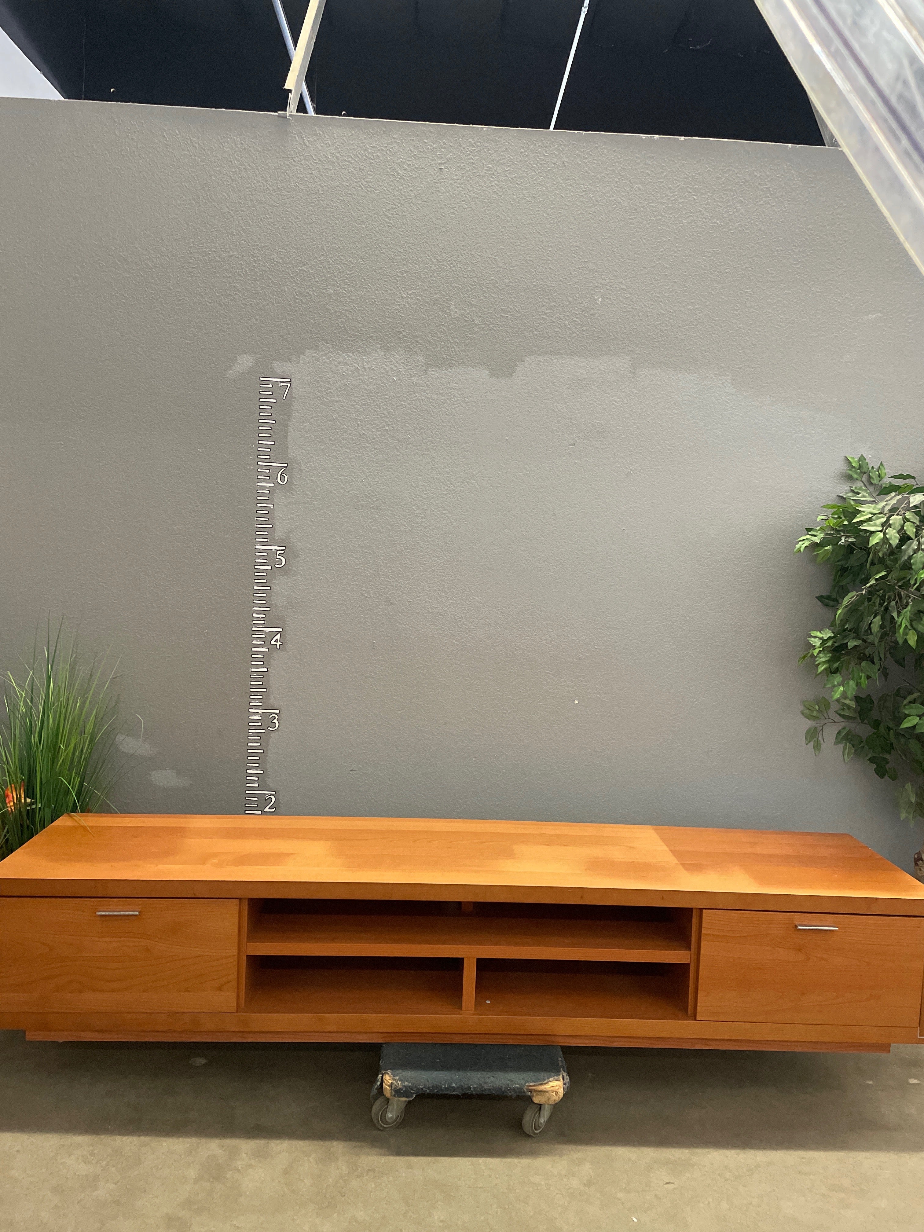 This TV stand features a warm, honey-colored wood finish with a smooth veneer. It includes two large side compartments and open middle shelves for ample storage. Approximate Size: 1.5 x 6 x 1.5