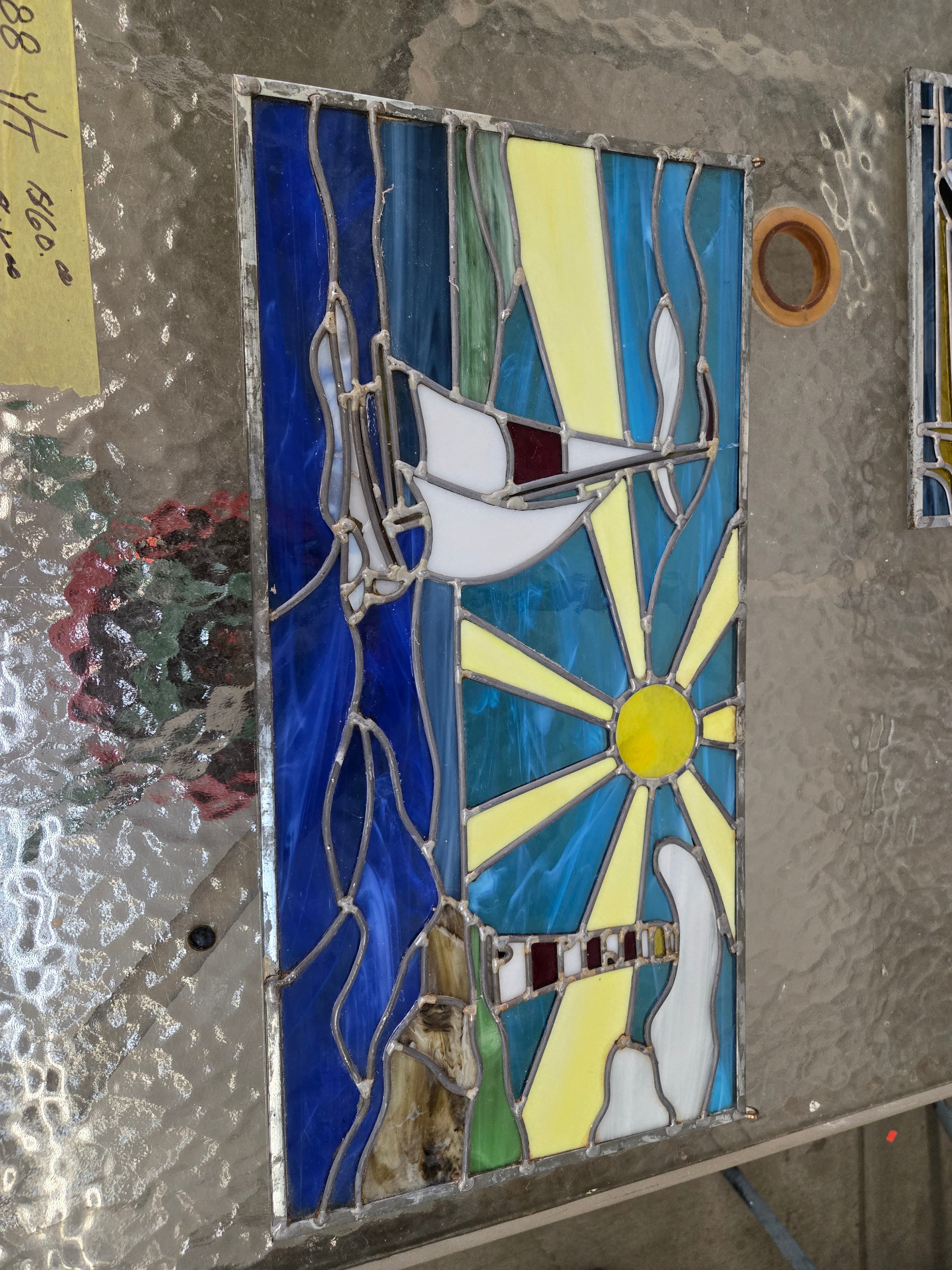 This vibrant stained glass panel features a nautical design with a sailboat and lighthouse against a sunlit background. The panel showcases rich blues, bright yellows, and earthy greens, crafted in a smooth glass finish. Approximate Size: 2 x 1 x 0.1