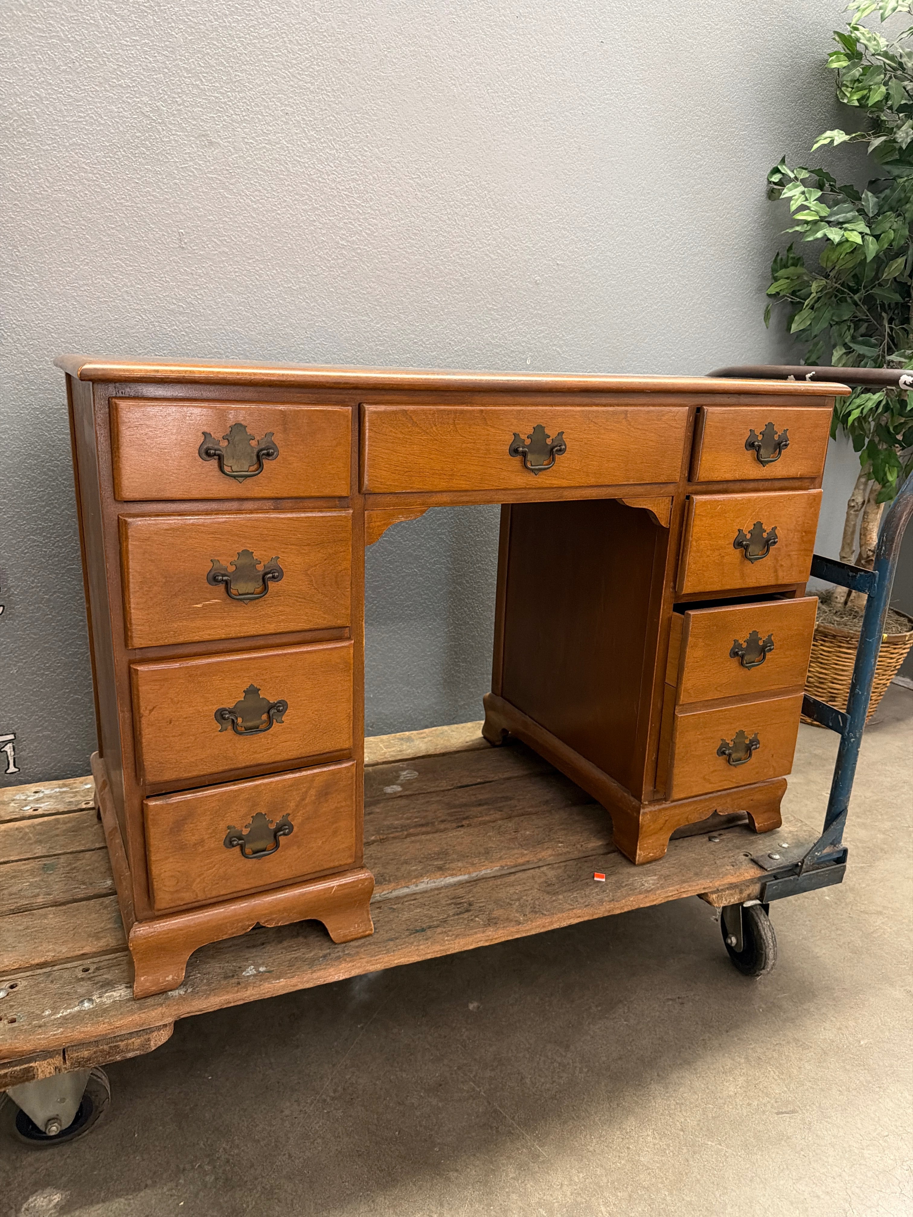 This classic vintage desk is crafted from rich brown wood and features a smooth finish. It is designed with multiple drawers for ample storage, making it perfect for any office setting. Approximate Size: 2.5 x 4 x 2