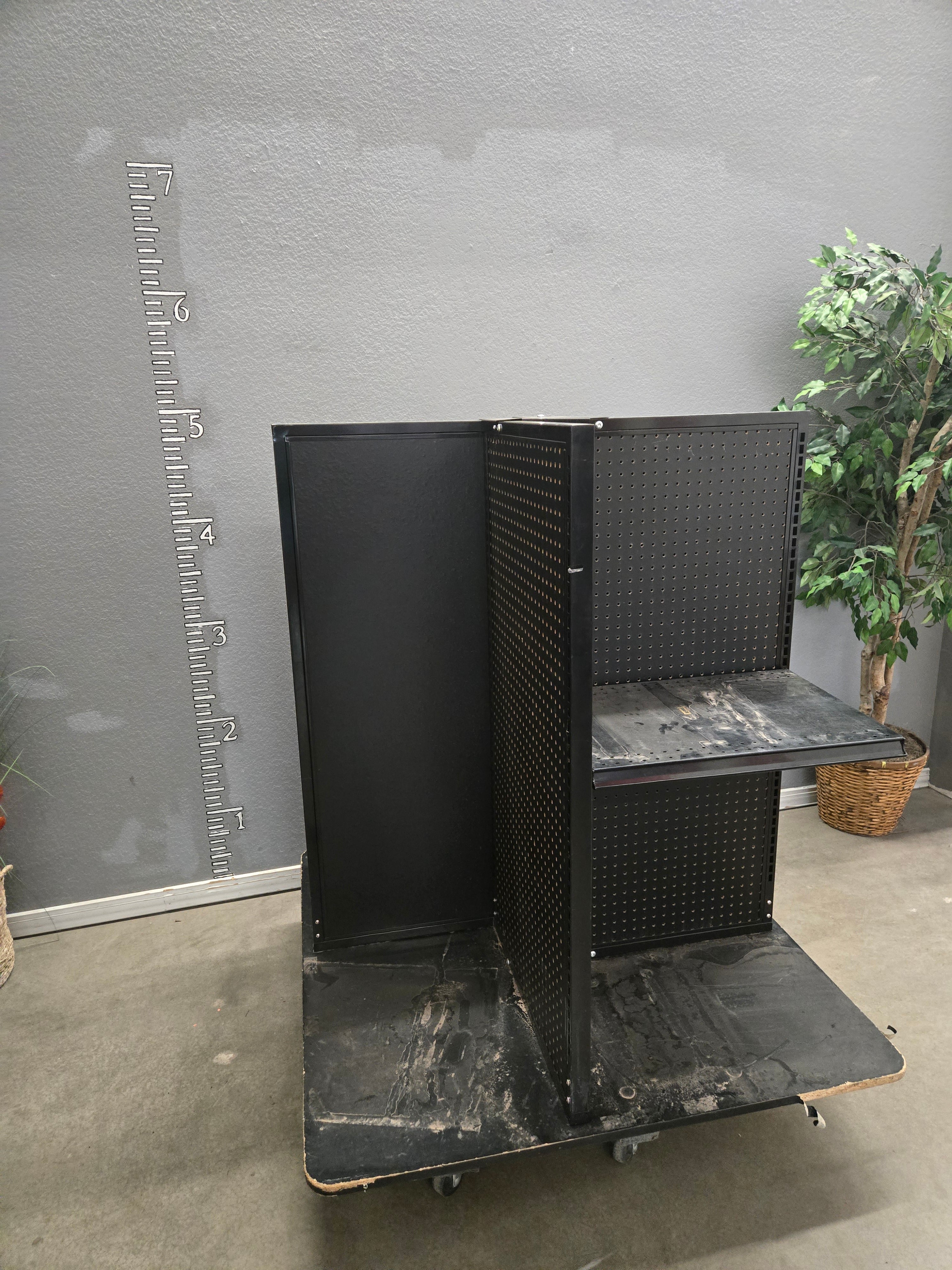 This versatile rotating display stand in a matte black finish features a pegboard design, perfect for showcasing items in a retail or home setting. Approximate Size: 6 x 2 x 2