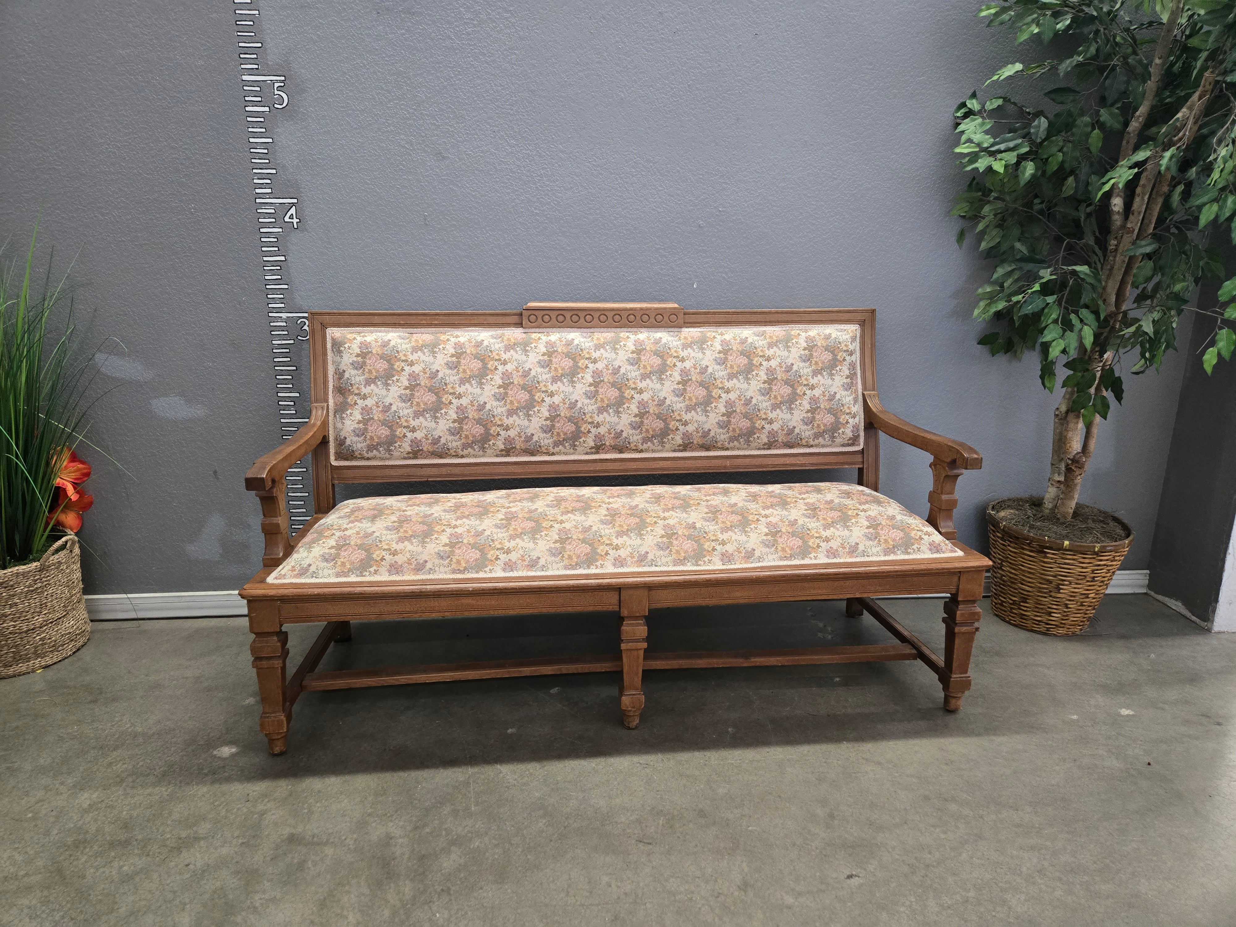 This beautiful vintage bench features a floral upholstered fabric in a pastel color scheme, set against a sturdy wooden frame with a polished finish. Perfect for adding a touch of elegance to any living room. Approximate Size: 3 x 5 x 2
