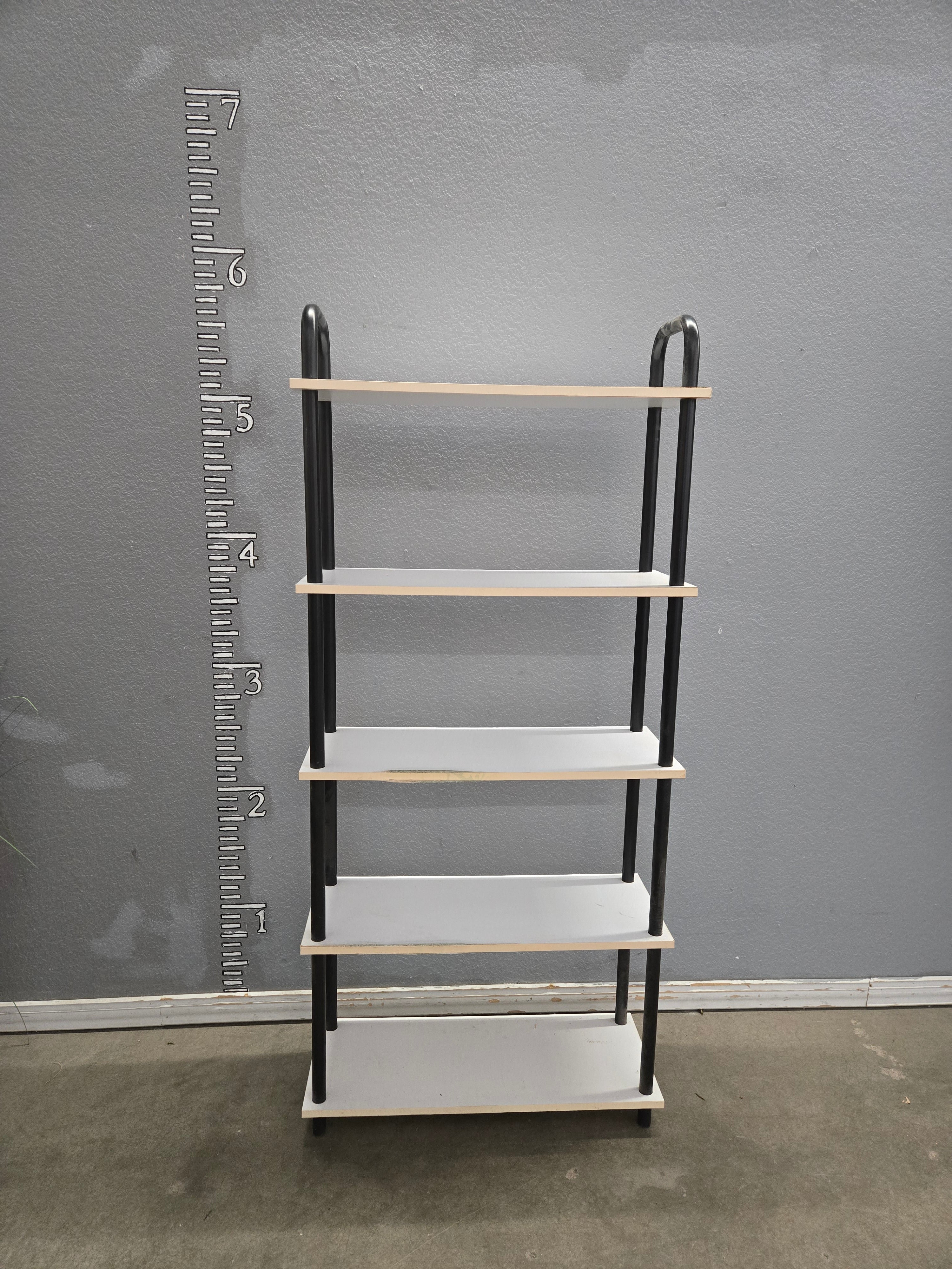 This sleek shelf unit features a minimalist design with black metal framing and white wooden shelves. The combination of durable metal and smooth white finish adds a modern touch to any room, perfect for organizing and displaying items. Approximate Size: 6 x 2 x 1