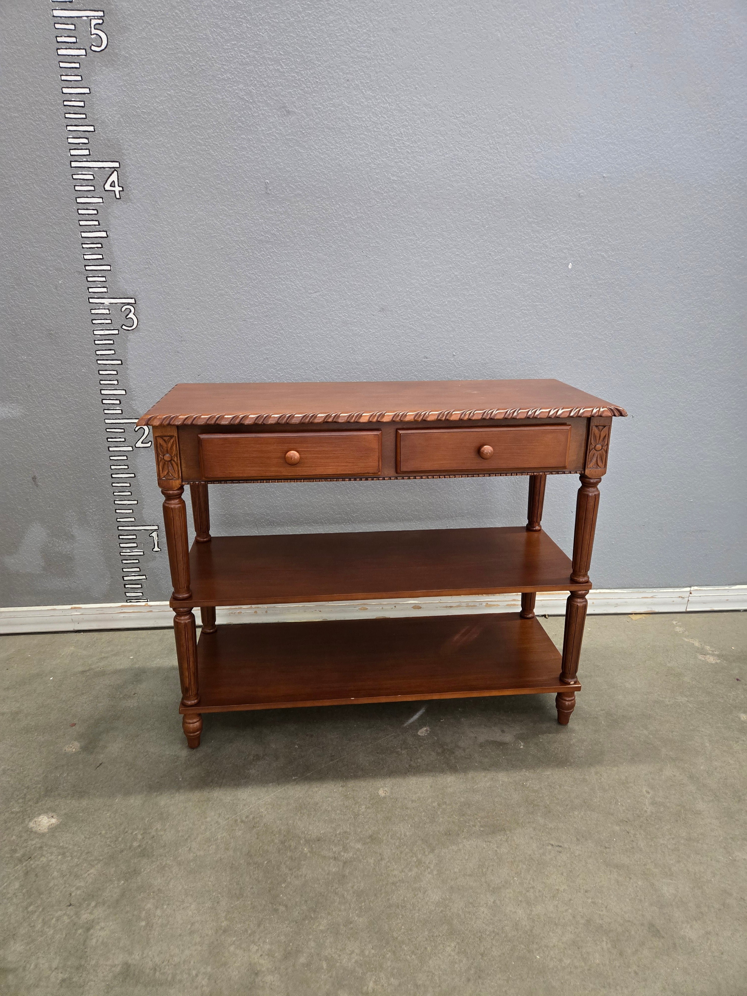 A classic vintage console table featuring a rich brown wood finish. This piece includes two small drawers with round wooden knobs and two lower shelves for ample storage. The carved accents and turned legs add elegance and sophistication, making it a perfect addition to any living space. Approximate Size: 3.5 x 4 x 1.5