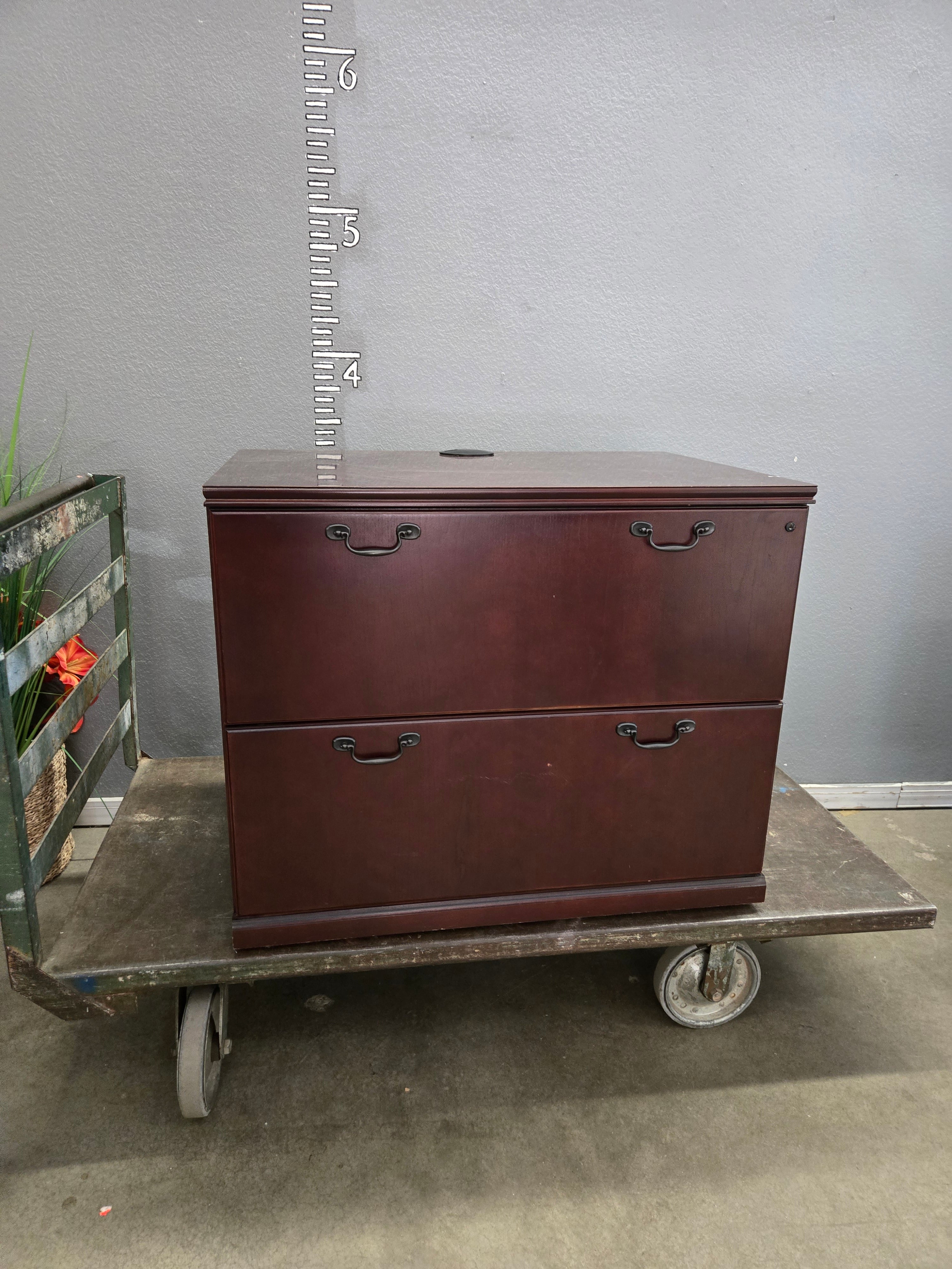 This elegant filing cabinet features a rich mahogany color with a smooth, polished finish. It includes two spacious drawers, perfect for organizing documents in style. Approximate Size: 3 x 2.5 x 1.5