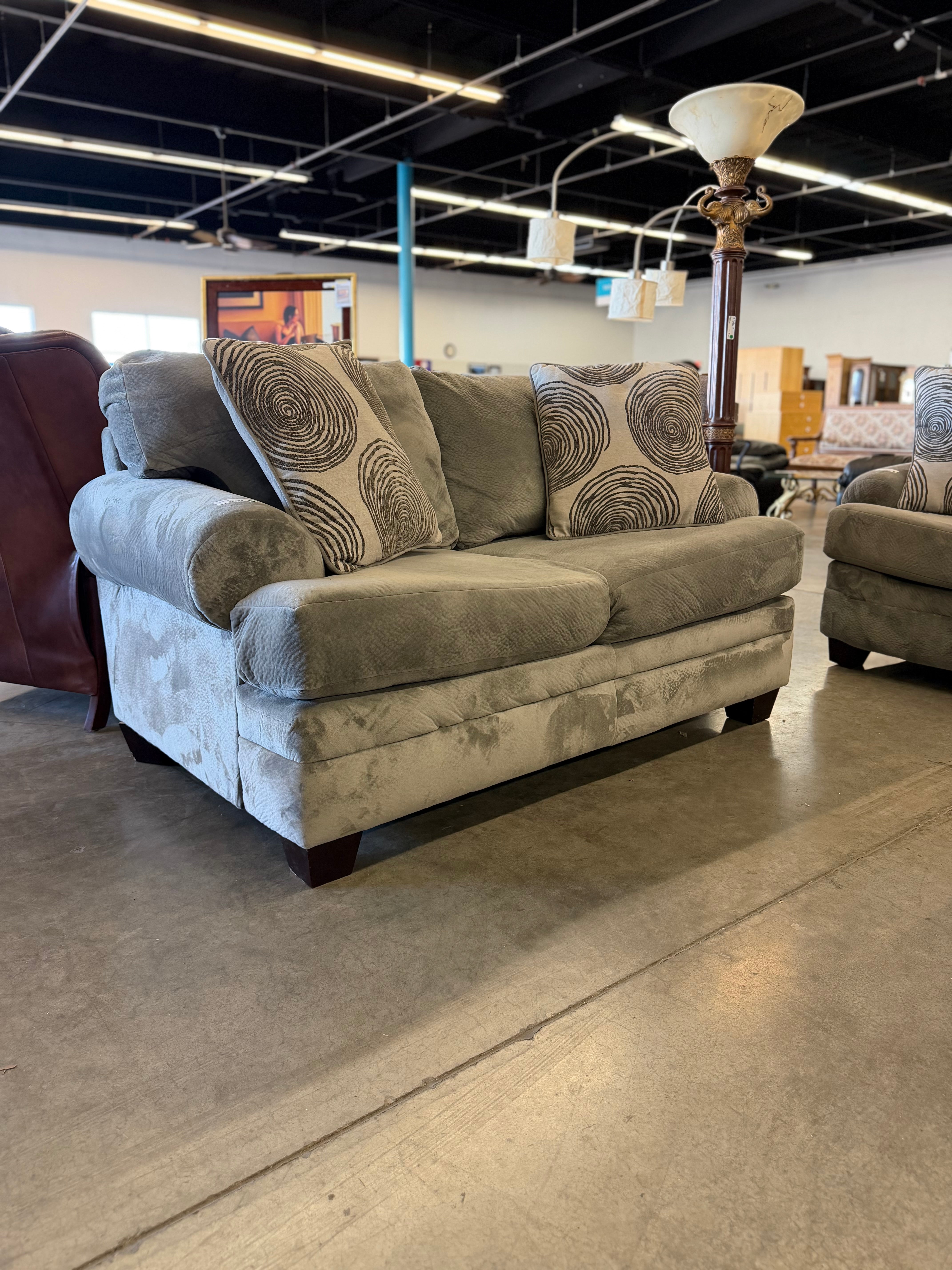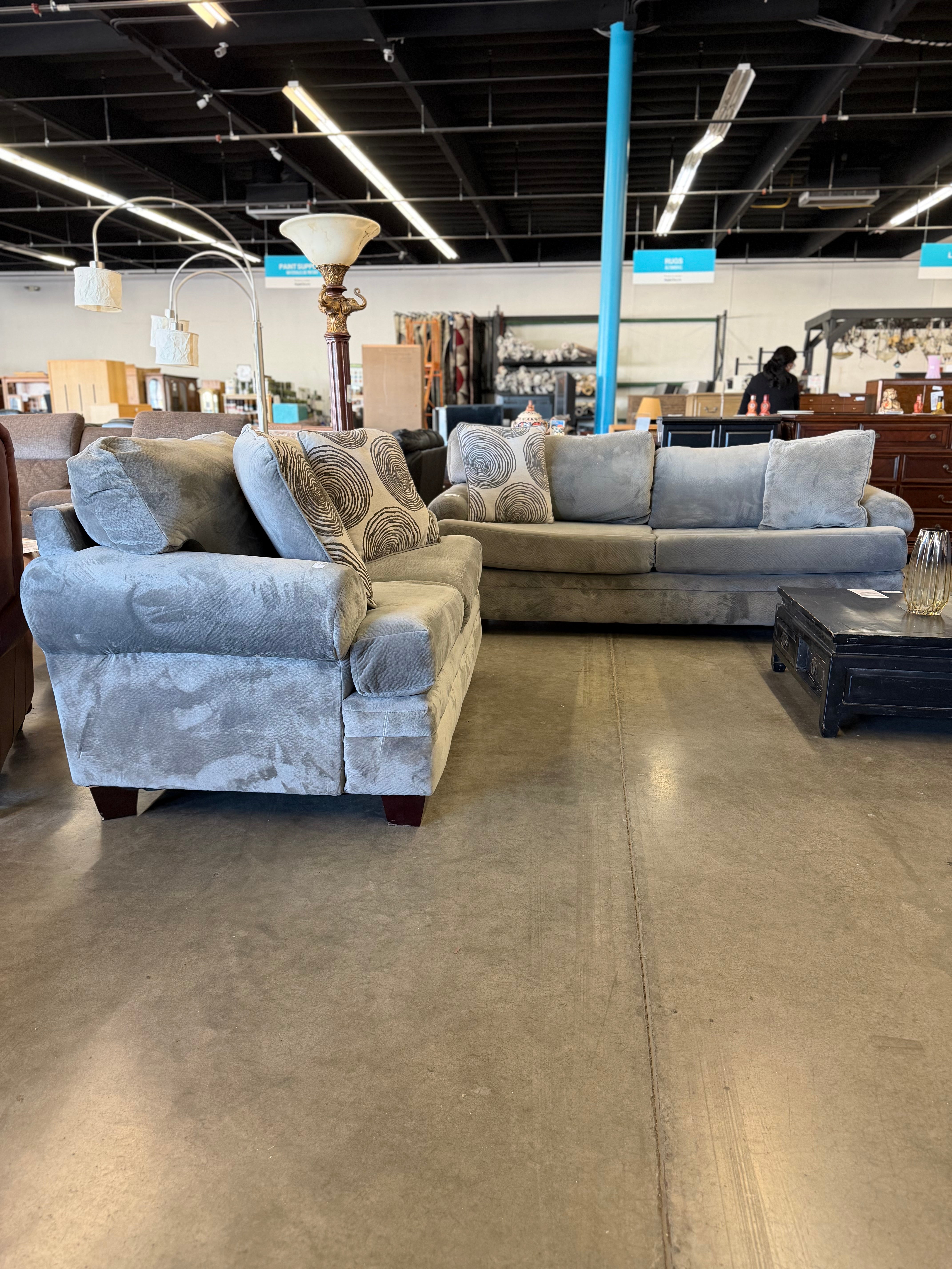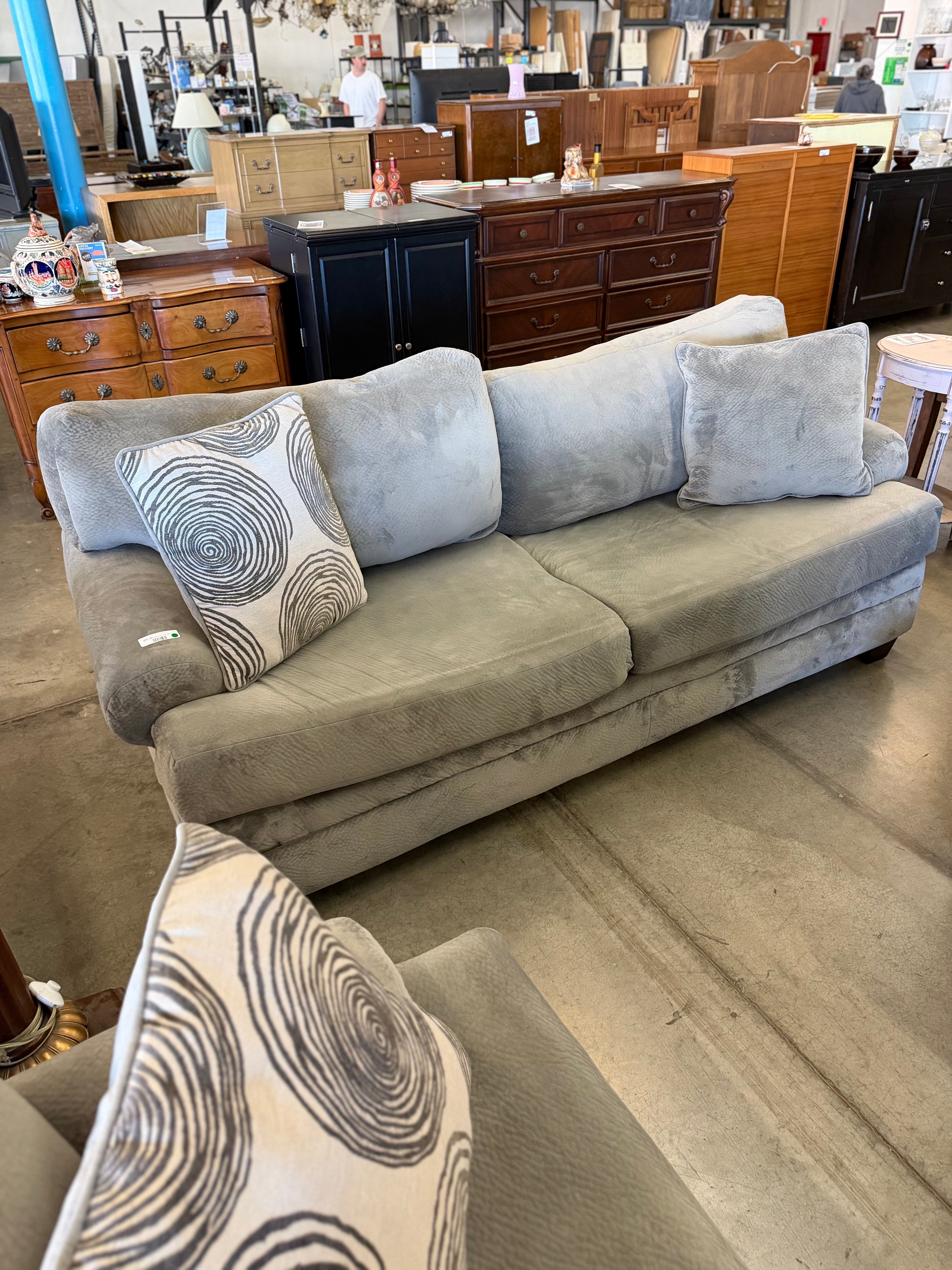 This comfortable sofa set features a plush gray fabric with a soft finish, perfect for adding a touch of elegance to your living room. The set includes two sofas with coordinating patterned throw pillows. Approximate Size: 3 x 6 x 3