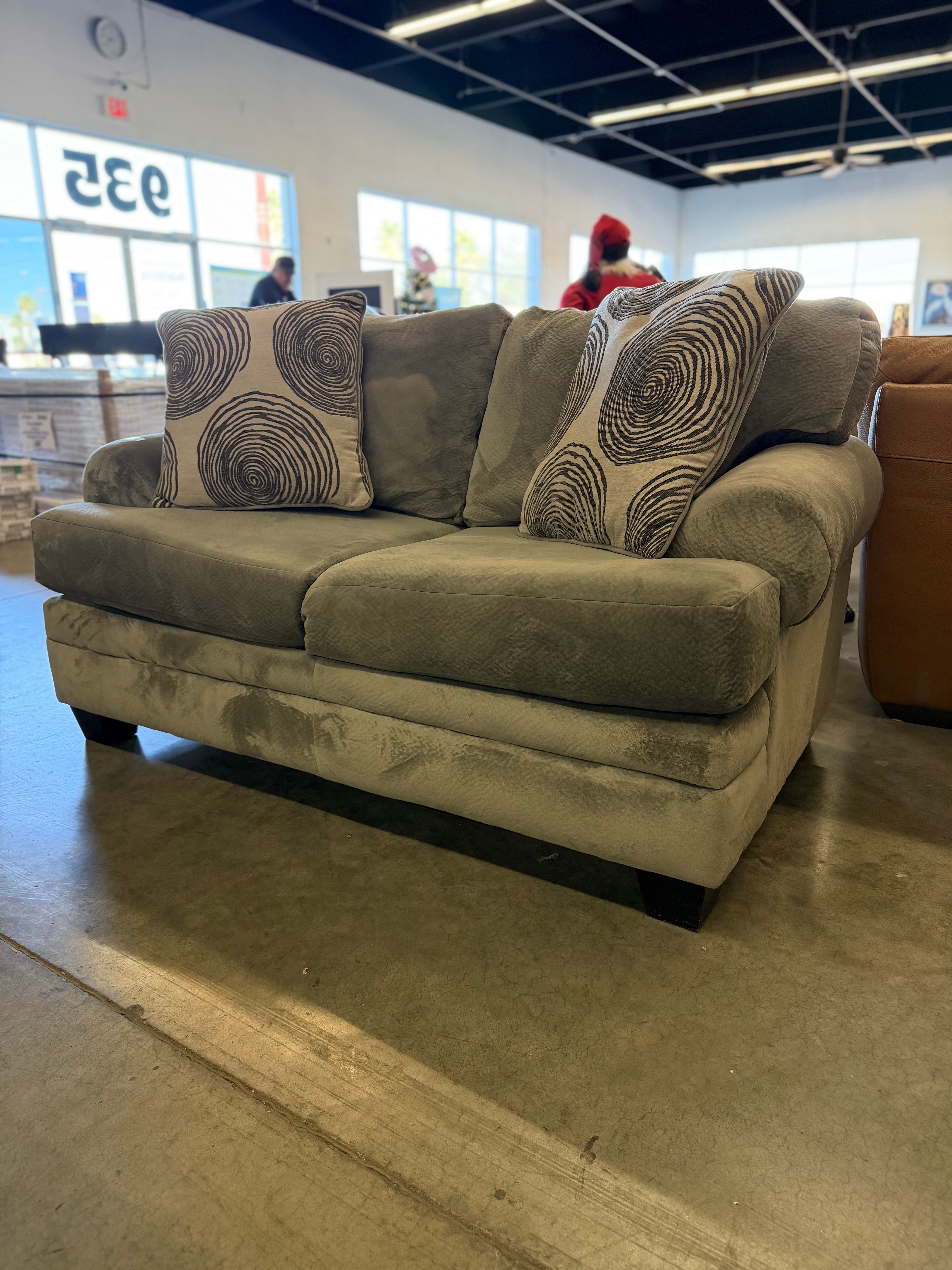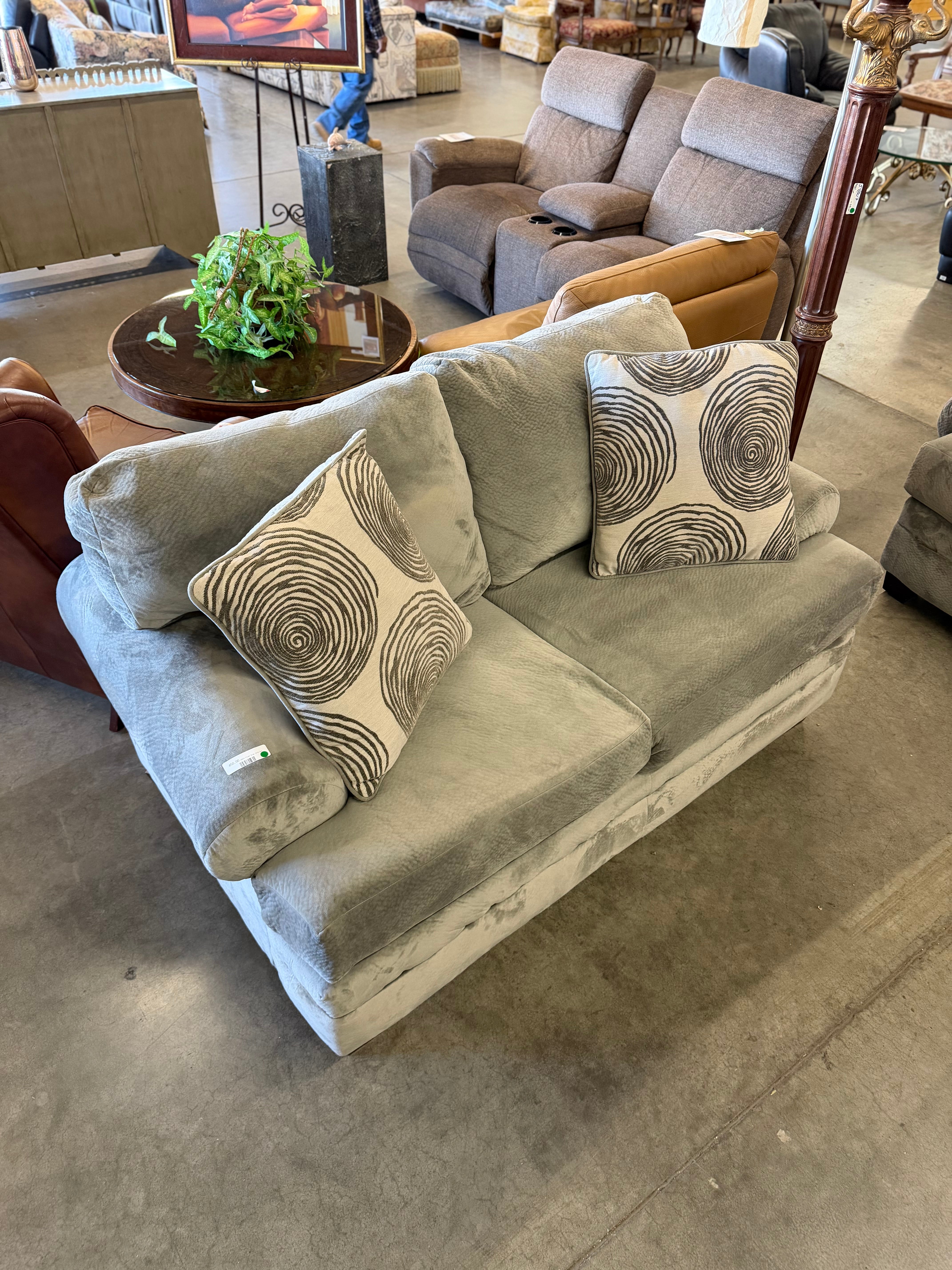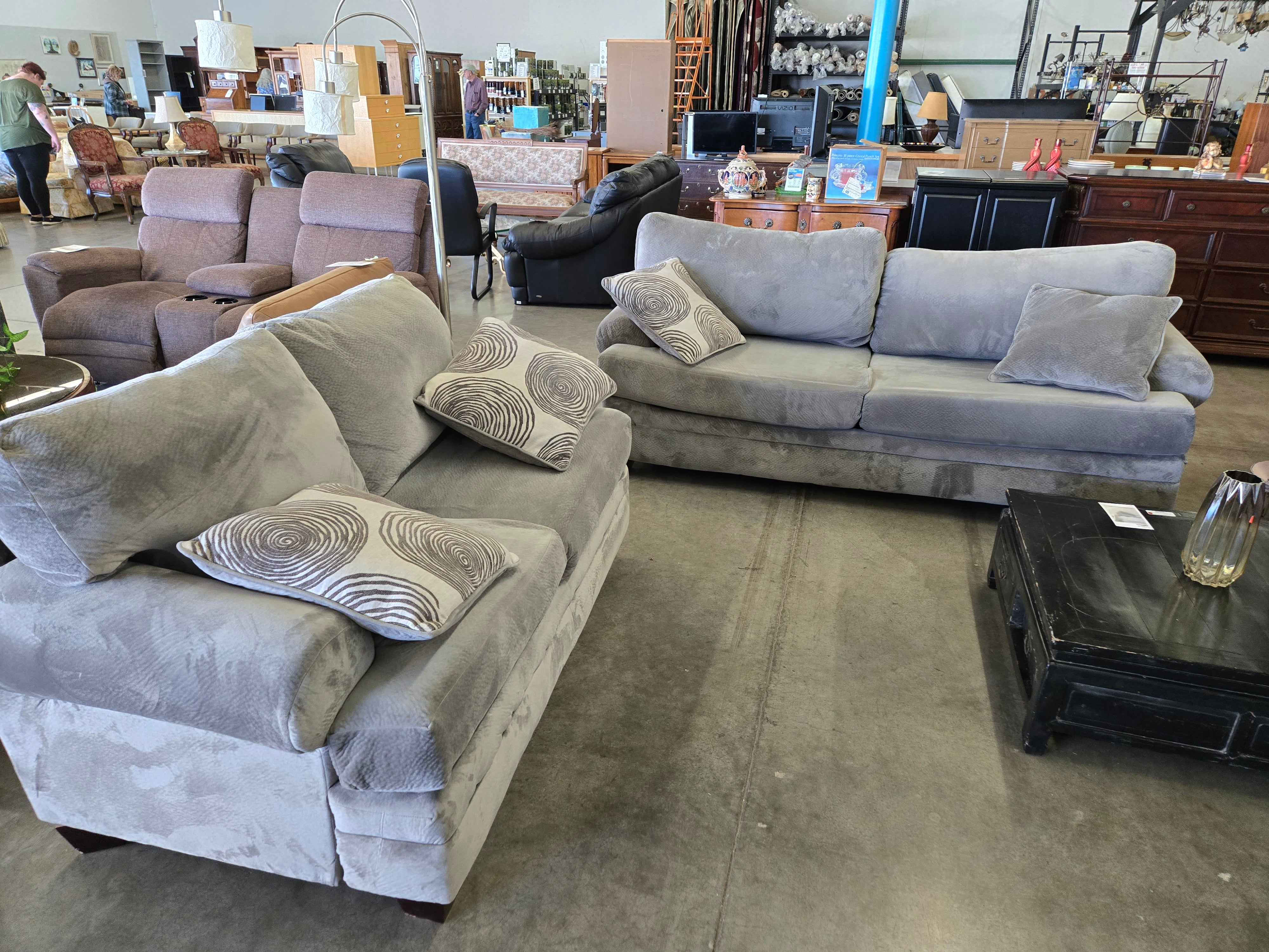 This comfortable sofa set features a plush gray fabric with a soft finish, perfect for adding a touch of elegance to your living room. The set includes two sofas with coordinating patterned throw pillows. Approximate Size: 3 x 6 x 3