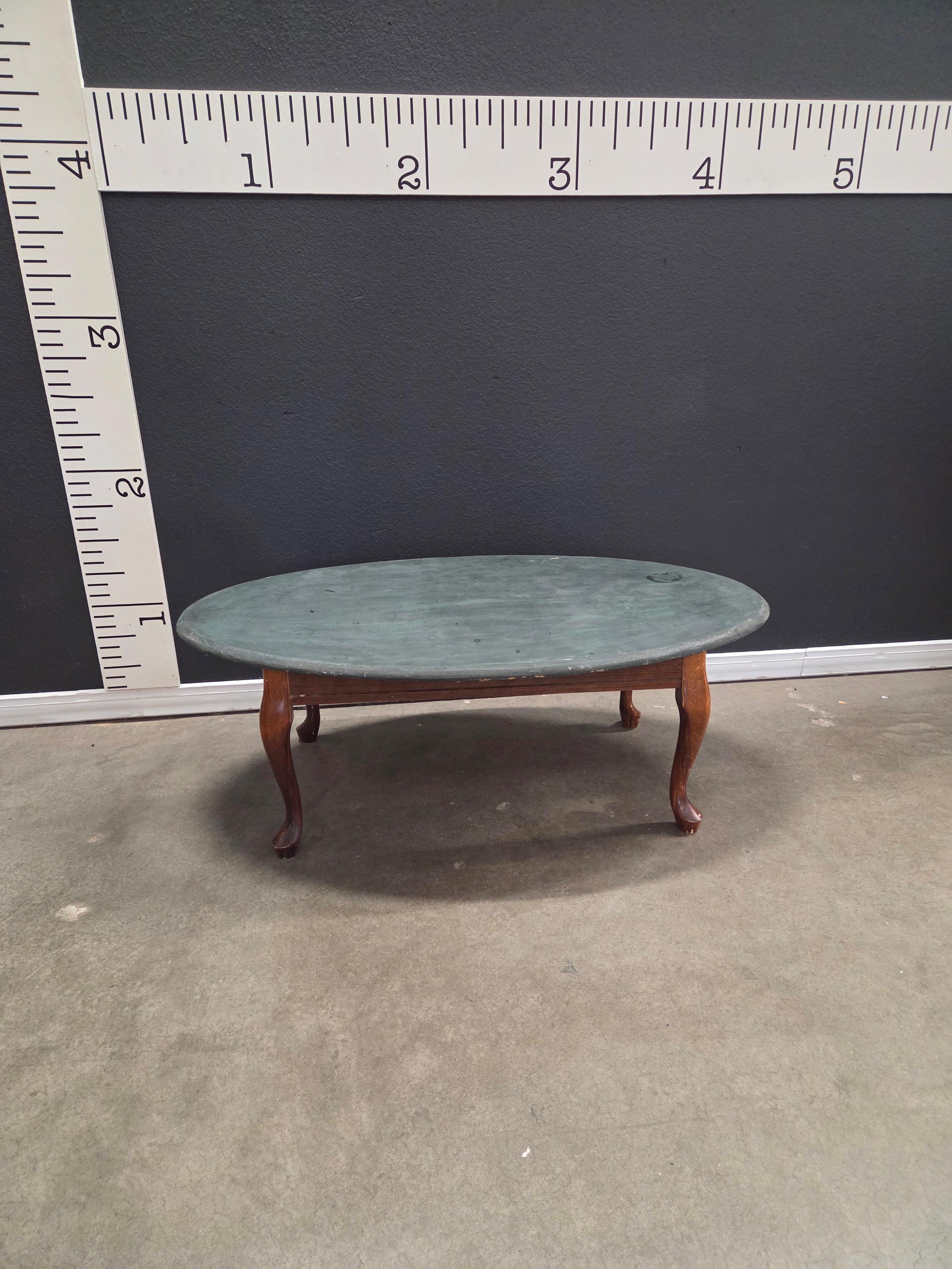 This elegant oval coffee table features a textured gray-green finished tabletop with rich, natural wooden legs, providing a blend of classic and rustic charm. Approximate Size: 1.5 x 4 x 2