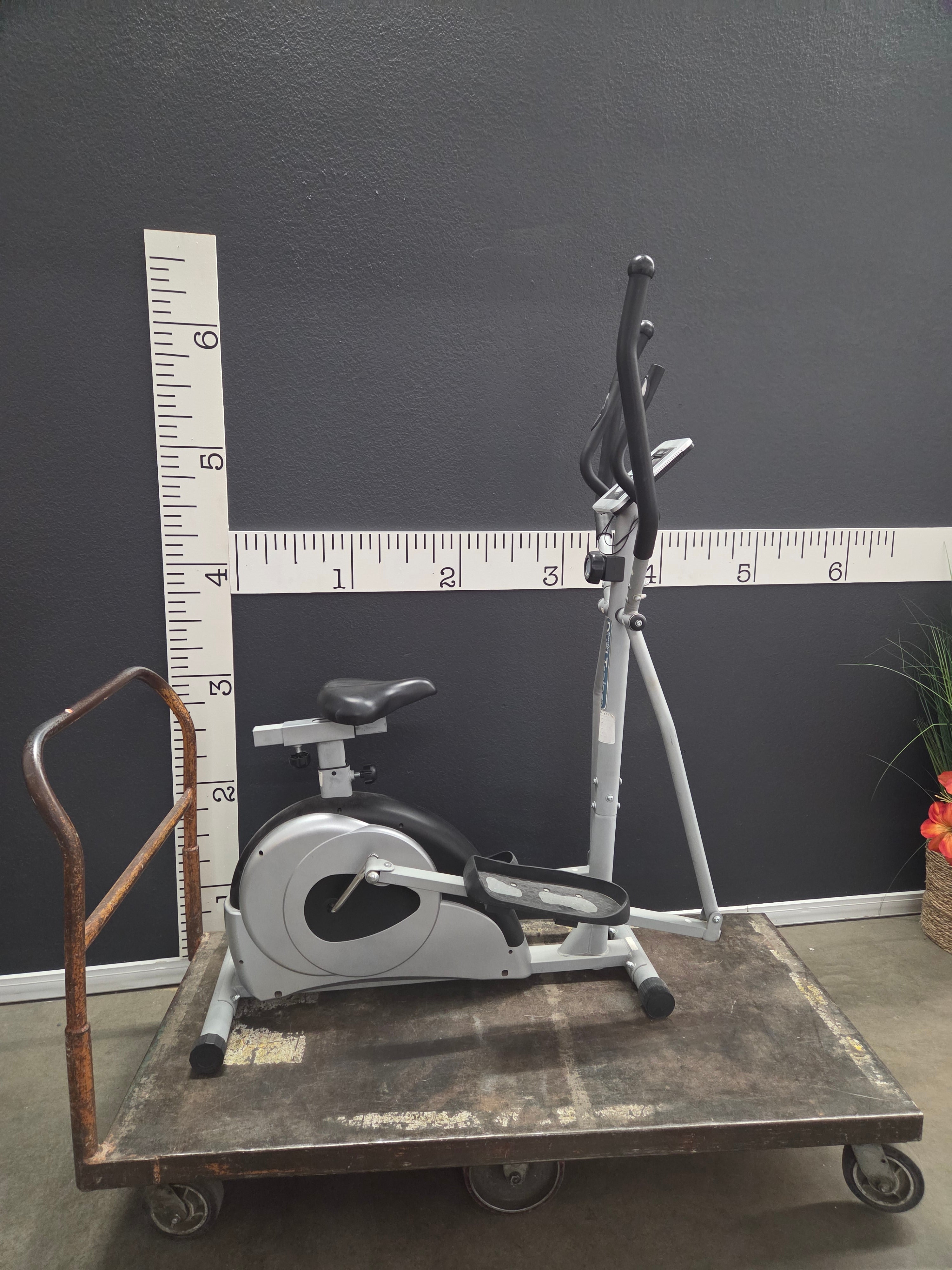 This elliptical exercise machine features a sleek silver and black finish. Its sturdy metal frame provides stability during workouts, while the ergonomic design ensures comfort. Ideal for a full-body, low-impact cardio workout in the comfort of your home. Approximate Size: 5 x 4 x 2