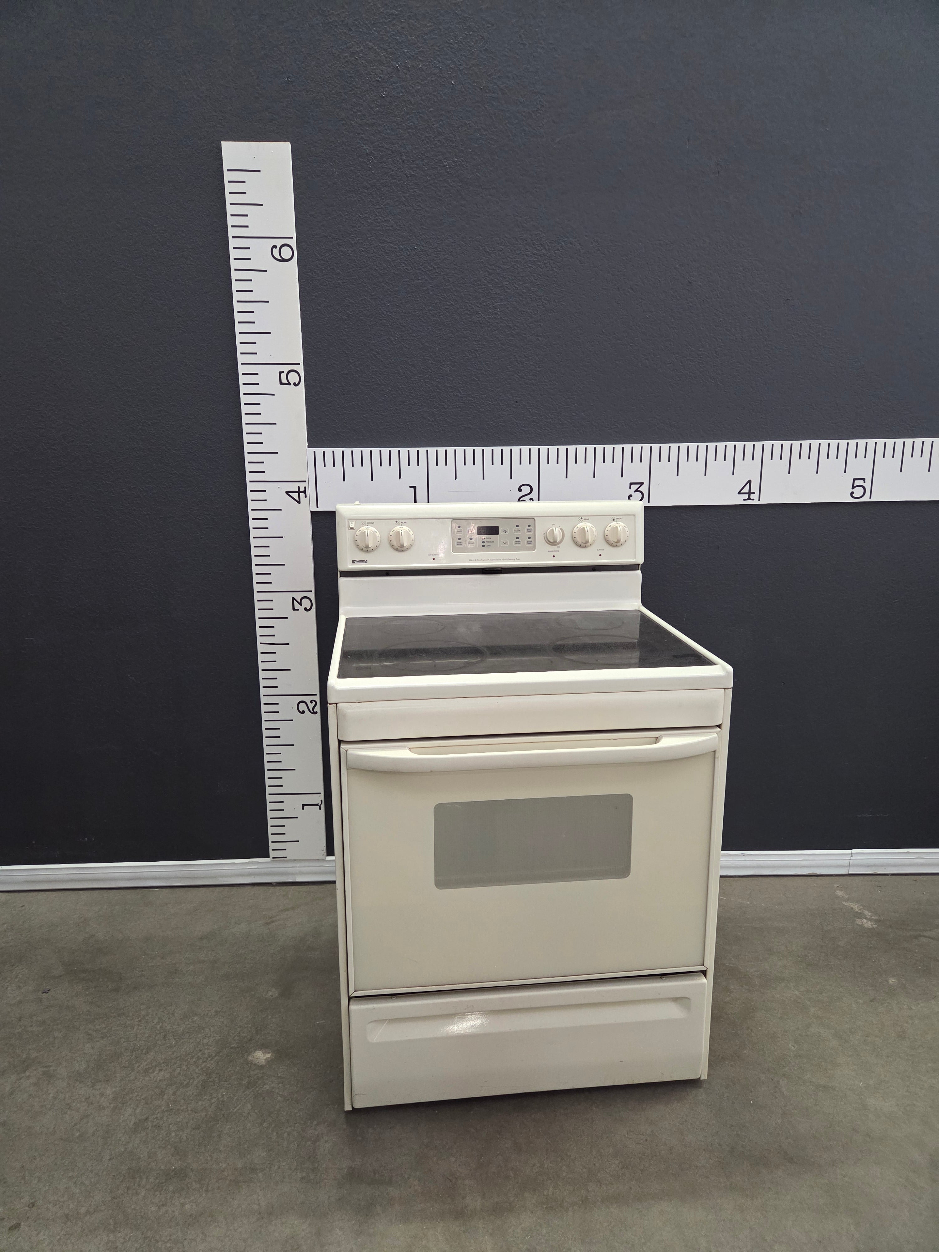 A classic white electric range with a smooth finish, featuring a glass cooktop and built-in oven. Ideal for any modern kitchen setting. Approximate Size: 4.5 x 2 x 2