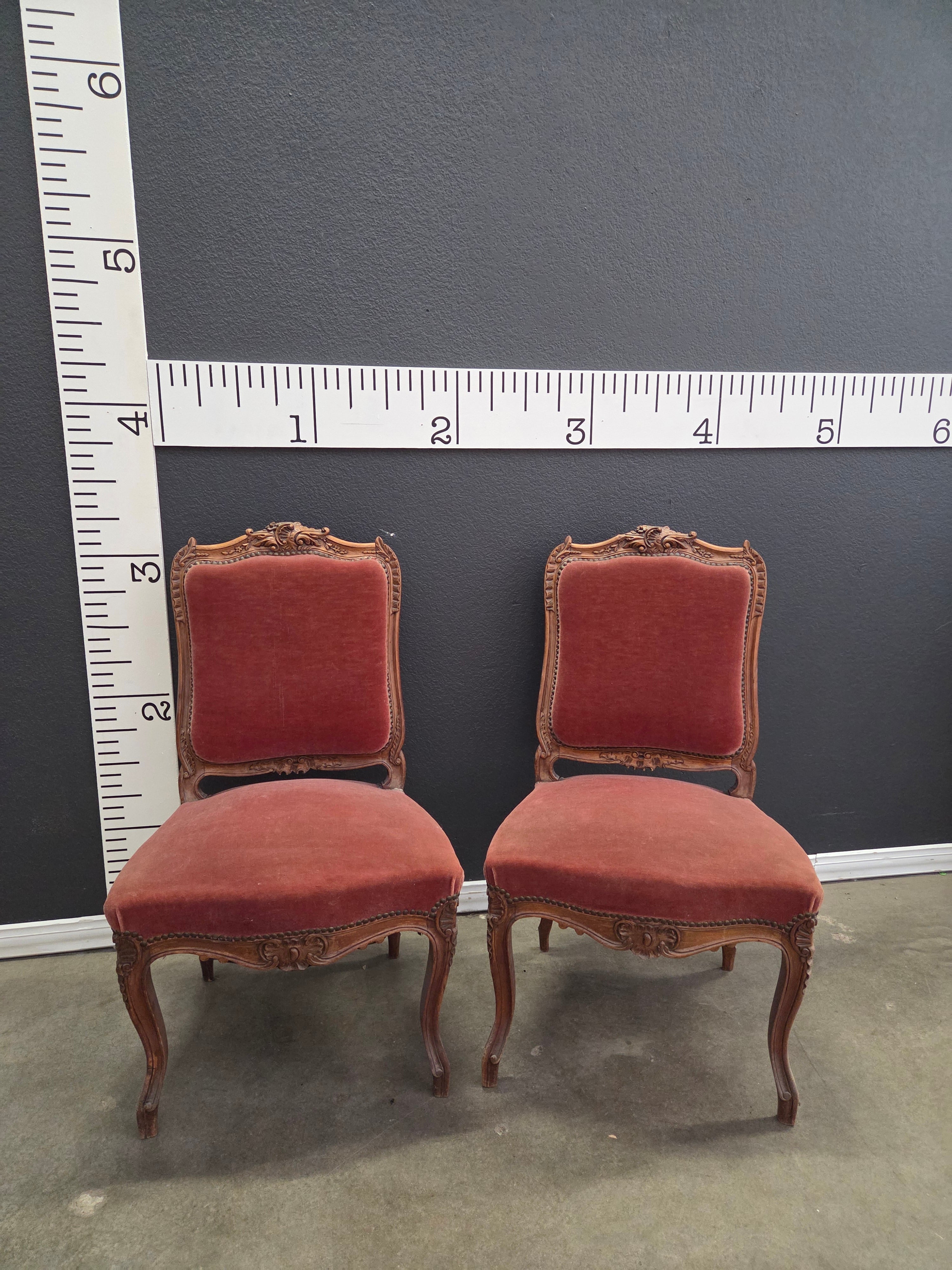These elegant vintage chairs feature a rich, red velvet upholstery with an intricate wooden frame. The carved wood finish accentuates the luxurious design, making them perfect for adding a touch of sophistication to any room. Approximate Size: 3 x 1.5 x 1.5