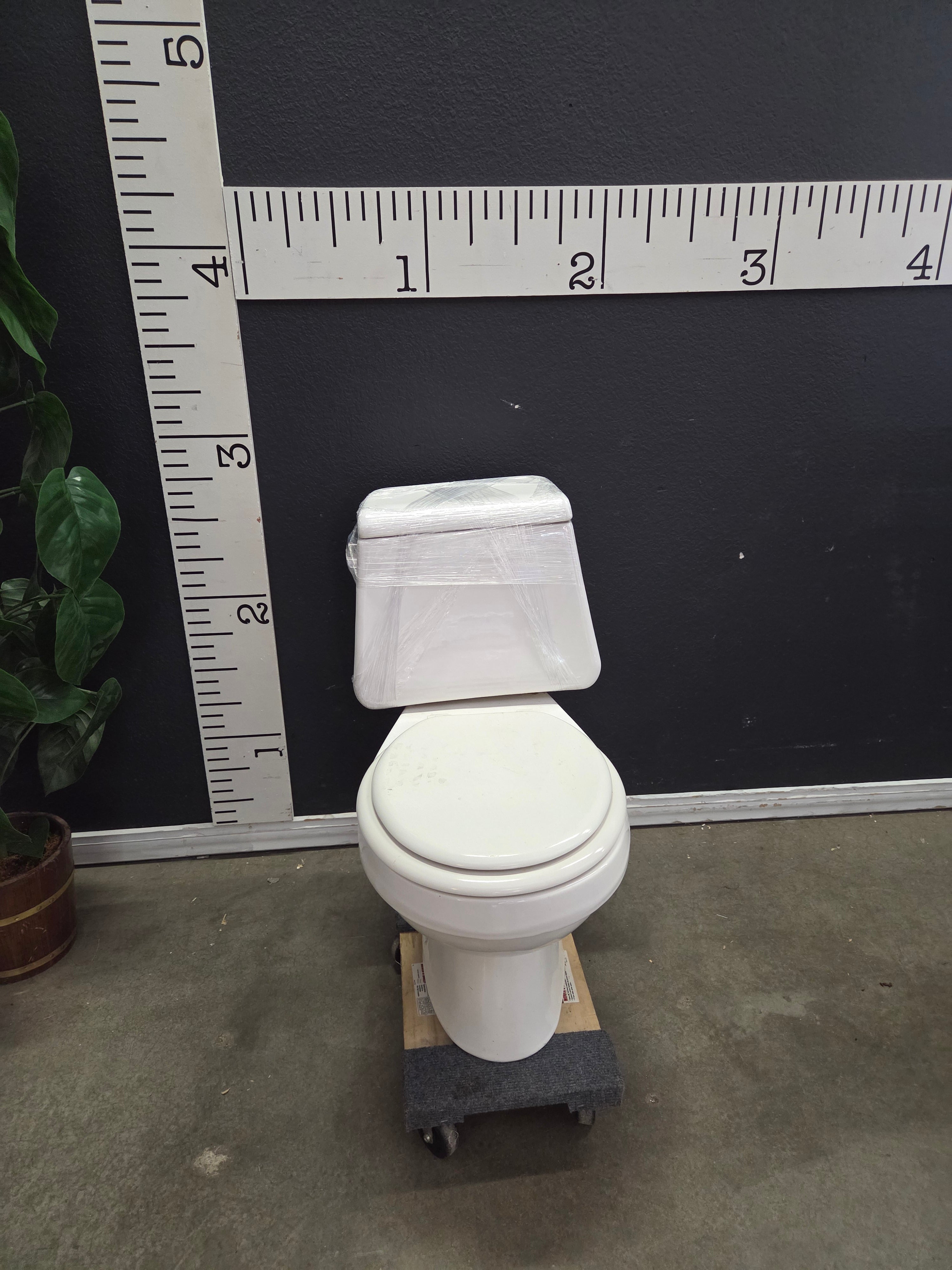 A sleek and modern white toilet with a smooth, glossy ceramic finish. Ideal for contemporary bathroom settings. Approximate Size: 2.5 x 1.5 x 2