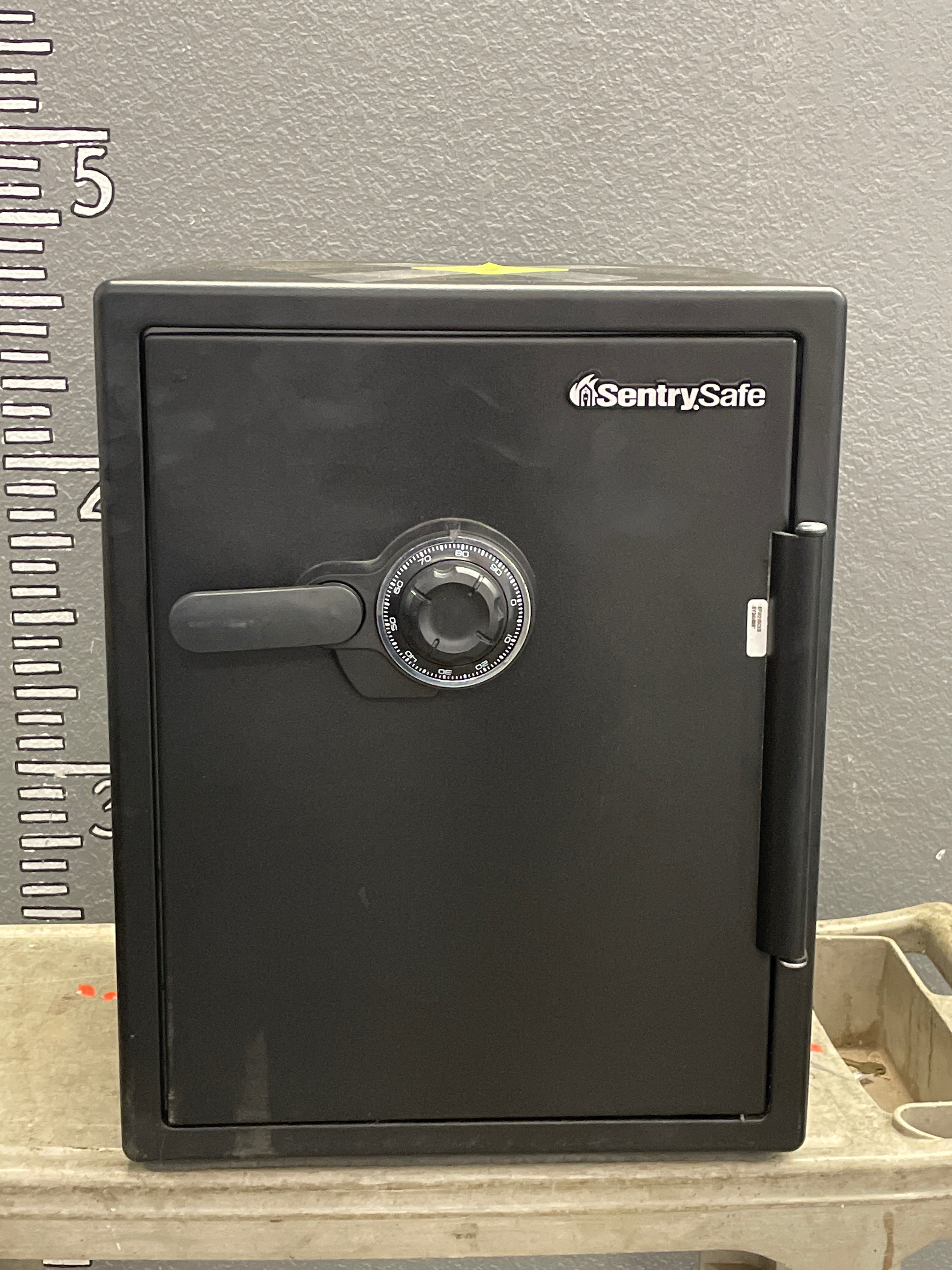 Black steel security safe with a matte finish, featuring a combination lock for enhanced protection. Approximate Size: 1.5 x 1.3 x 1.2