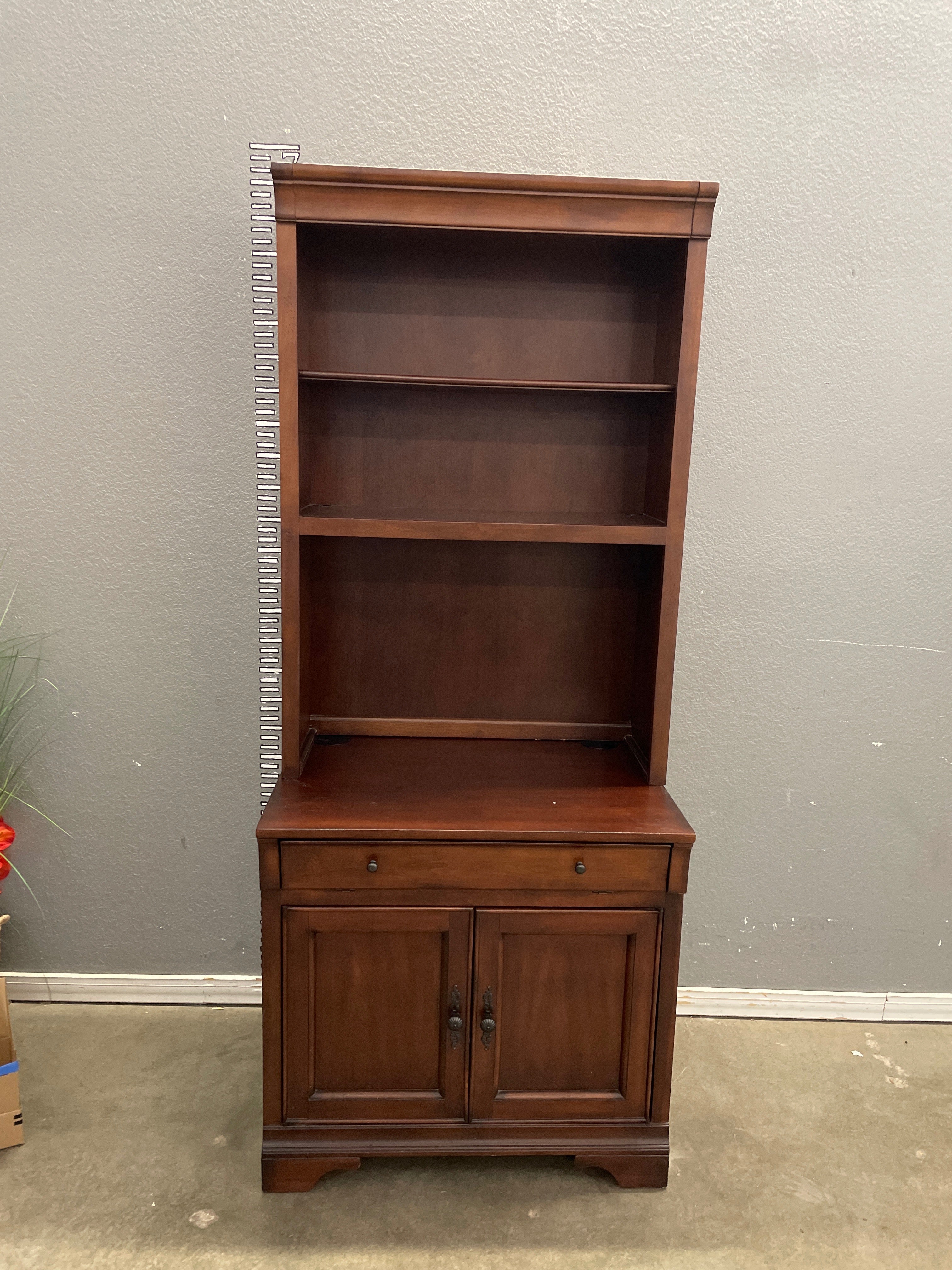 This elegant wood bookcase features a rich dark brown finish and a polished surface, offering both style and functionality. Perfect for showcasing your favorite books and décor items while providing extra storage with dual lower cabinet doors. Approximate Size: 6 x 3 x 1.5