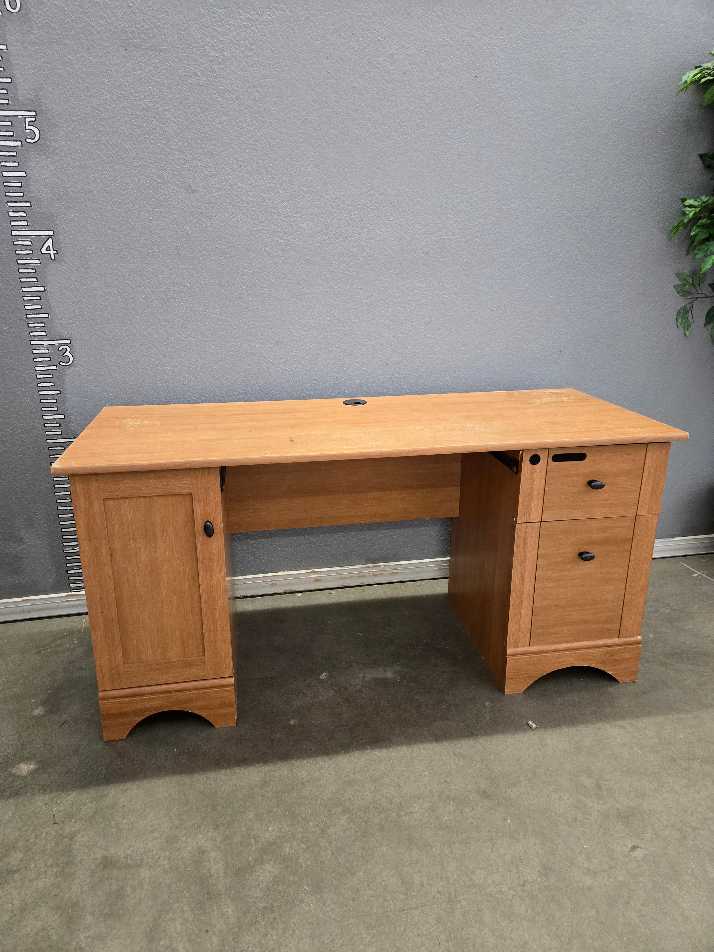 A medium brown wooden office desk with a smooth finish, featuring one cabinet and three drawers for ample storage. Approximate Size: 2.5 x 5 x 2