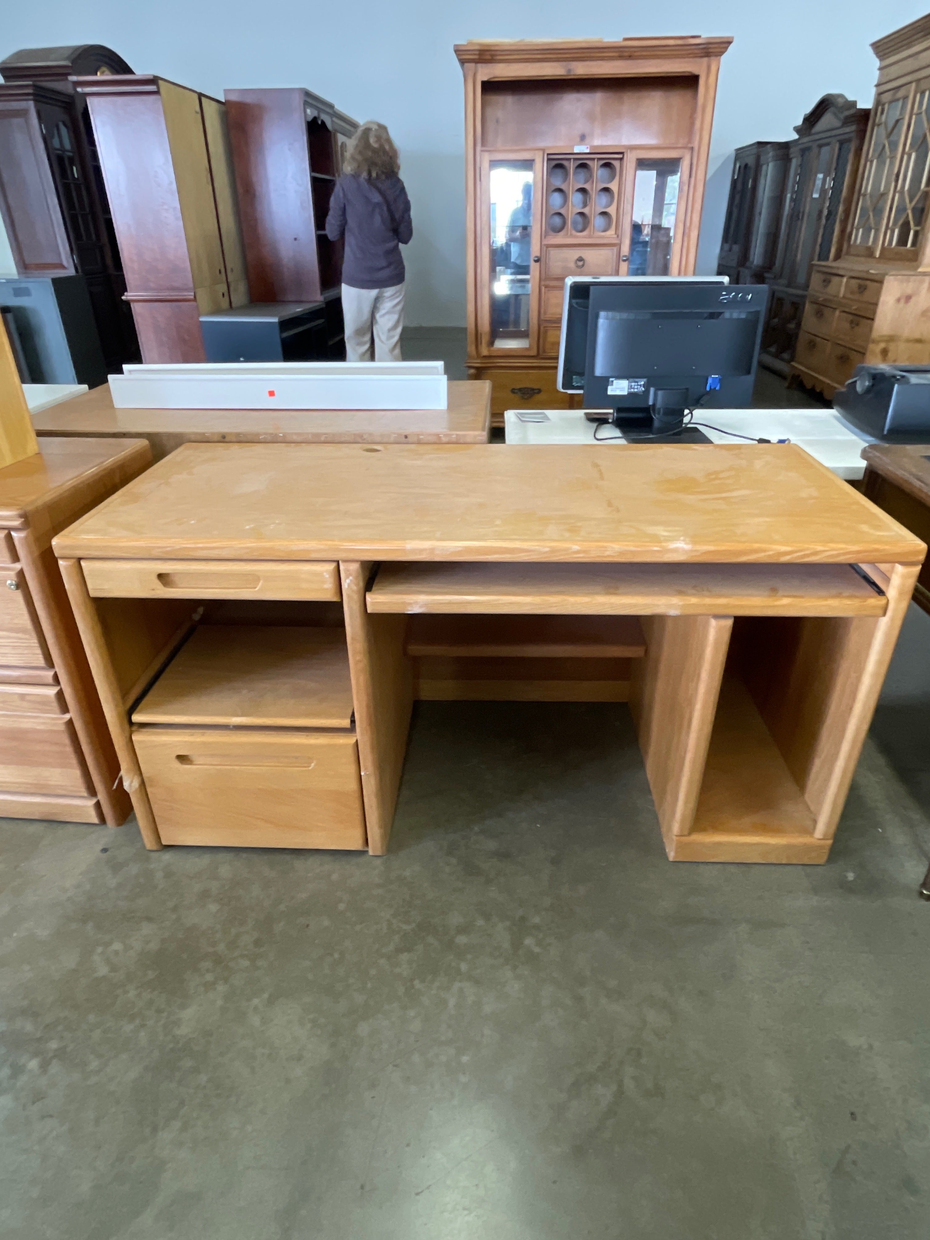 This classic wooden office desk features a natural wood finish, offering ample storage space with drawers and open shelves. Its sturdy construction provides reliability for everyday use. Approximate Size: 2.5 x 5 x 2.5