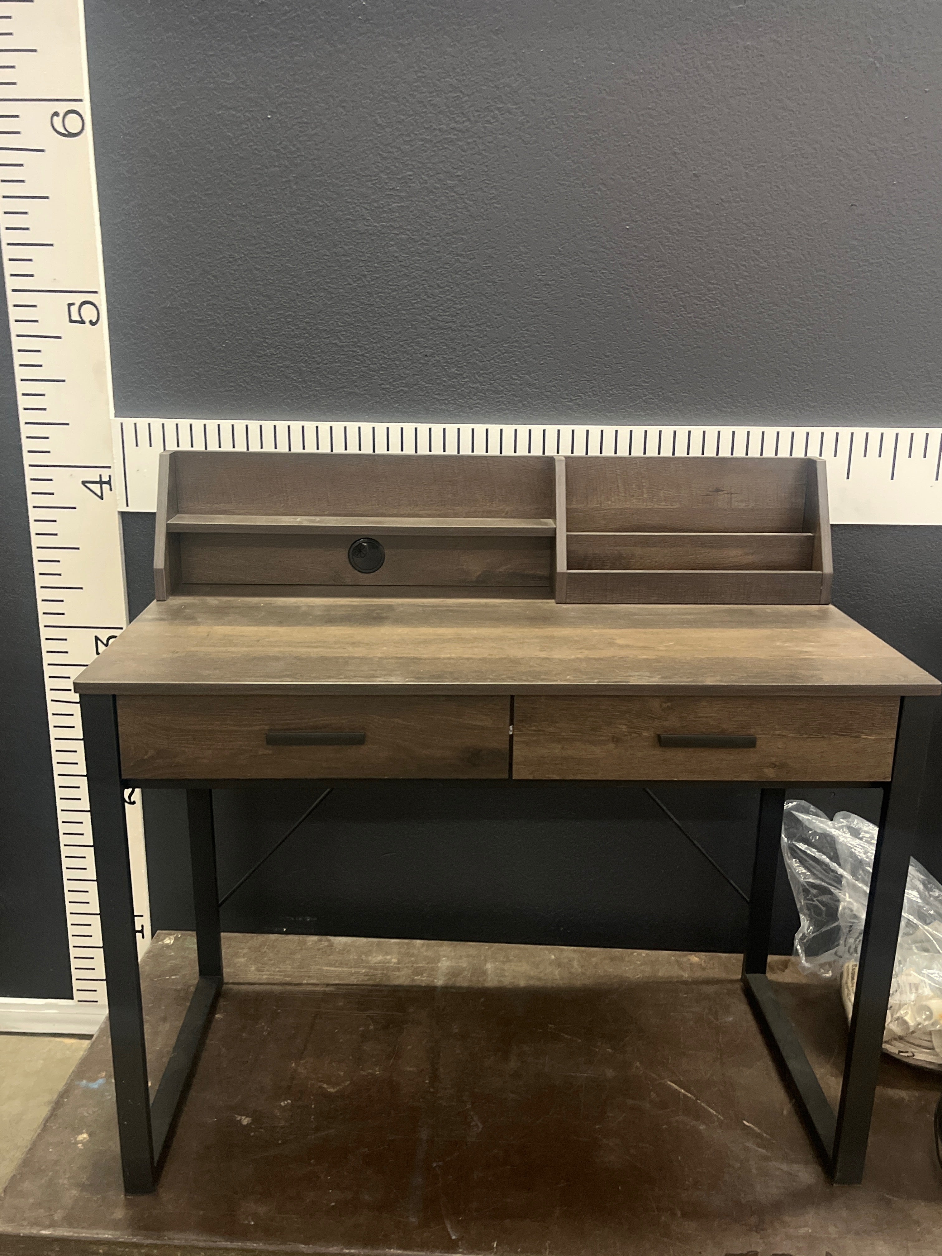 This elegant desk features a rustic brown finish and a sleek design. The desk includes a hutch for extra storage and organization, perfect for any office space. The metal legs provide a modern contrast to the wooden top. Approximate Size: 4 x 3.5 x 2