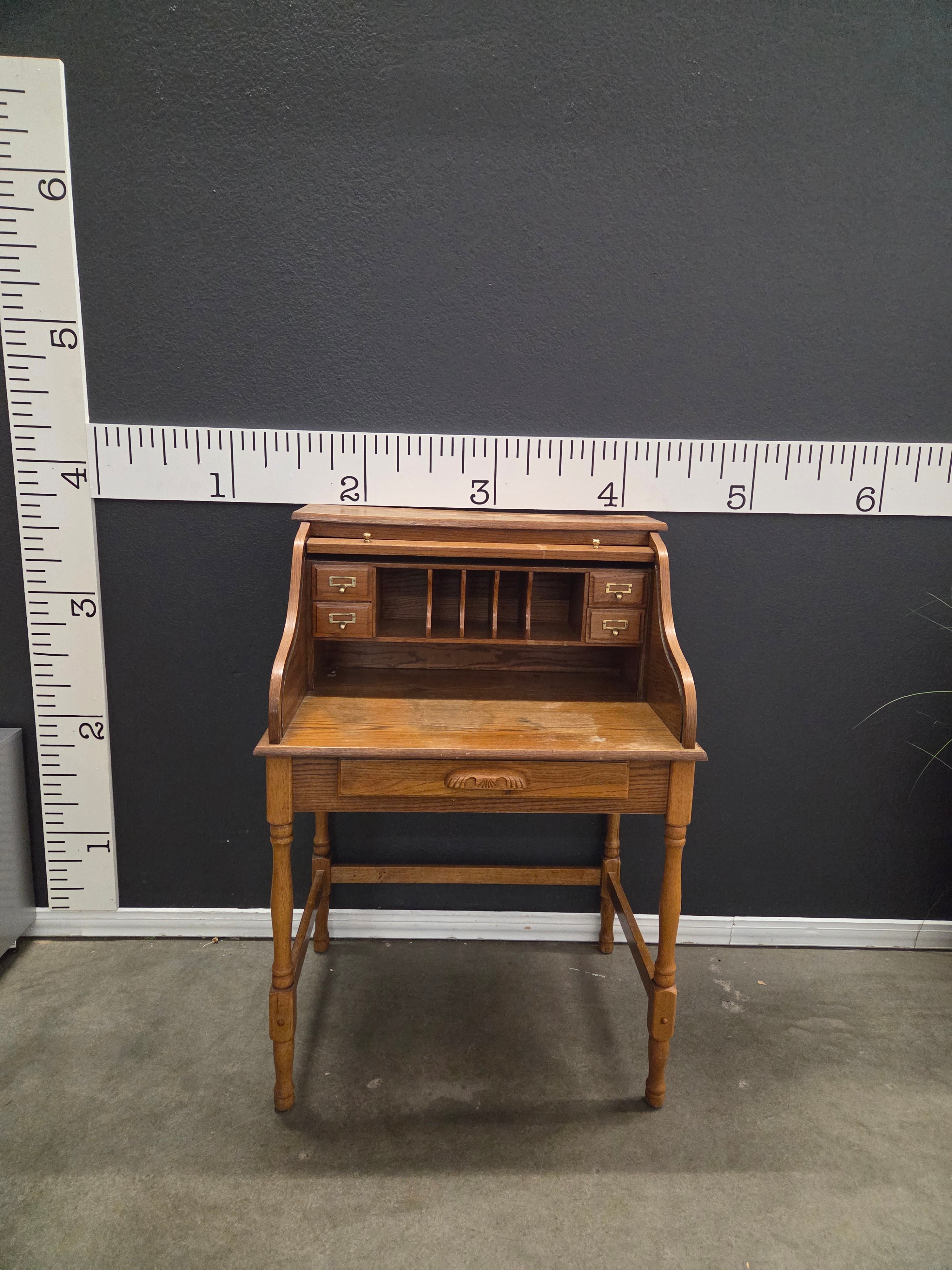 This charming vintage roll-top desk features a classic wooden finish with a warm, natural brown color. Designed with small compartments and drawers for organization, it brings a touch of nostalgia and functionality to any space. Approximate Size: 3 x 2.5 x 1.5