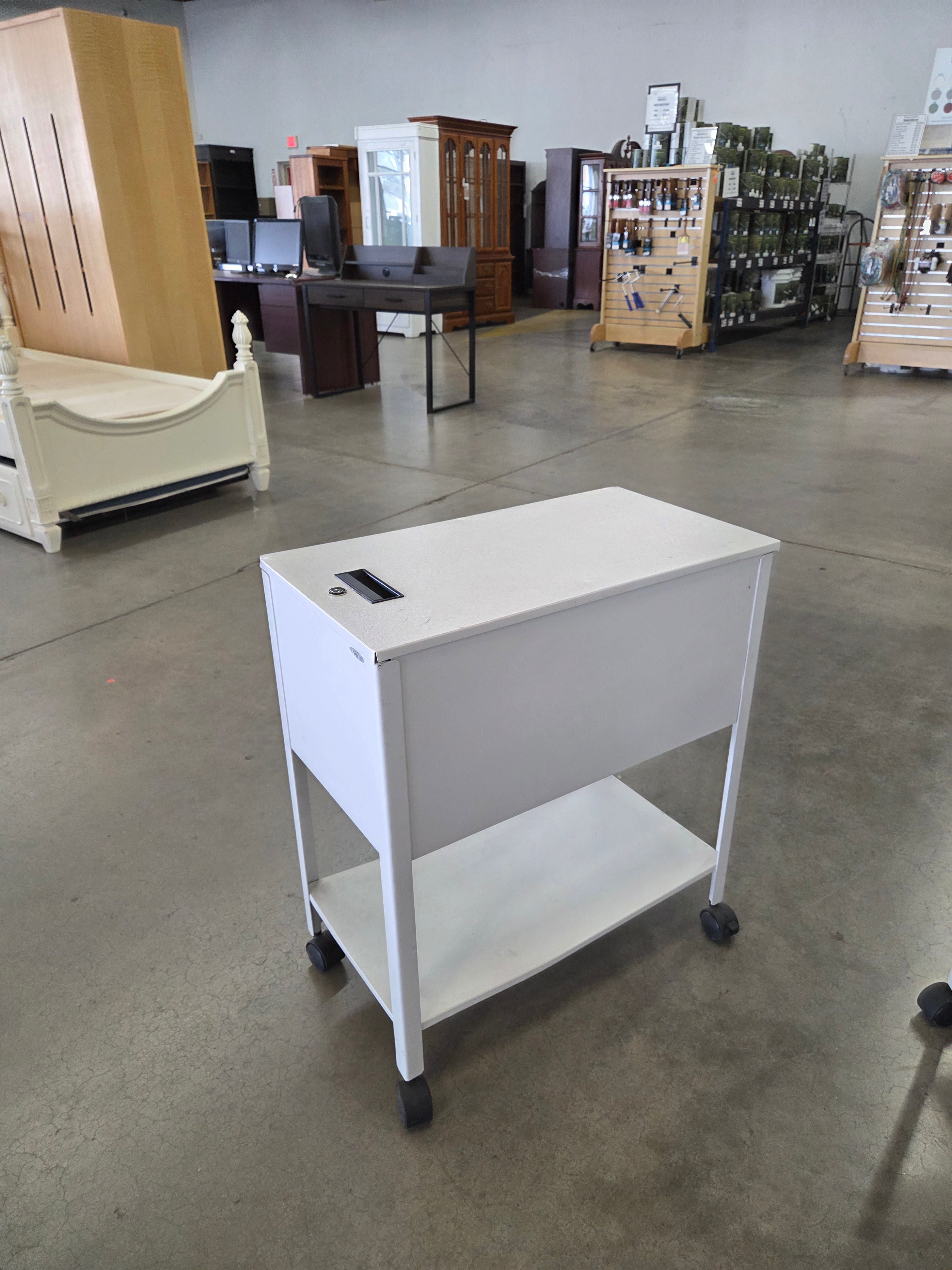 This compact utility cart features a sleek white metal finish, perfect for versatile use around home or office spaces. The cart includes a top storage compartment and a bottom shelf, all mounted on wheels for easy mobility. Approximate Size: 2.5 x 1.5 x 1