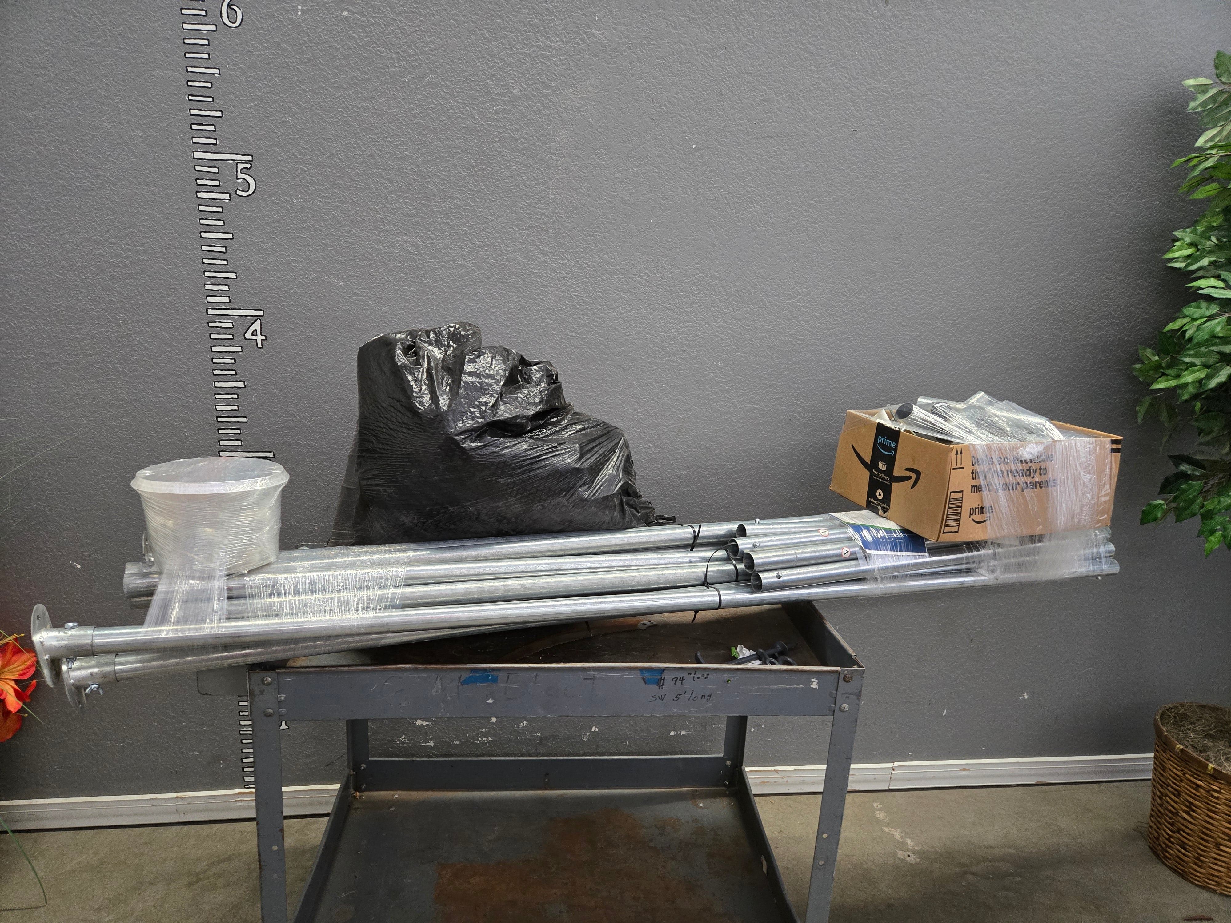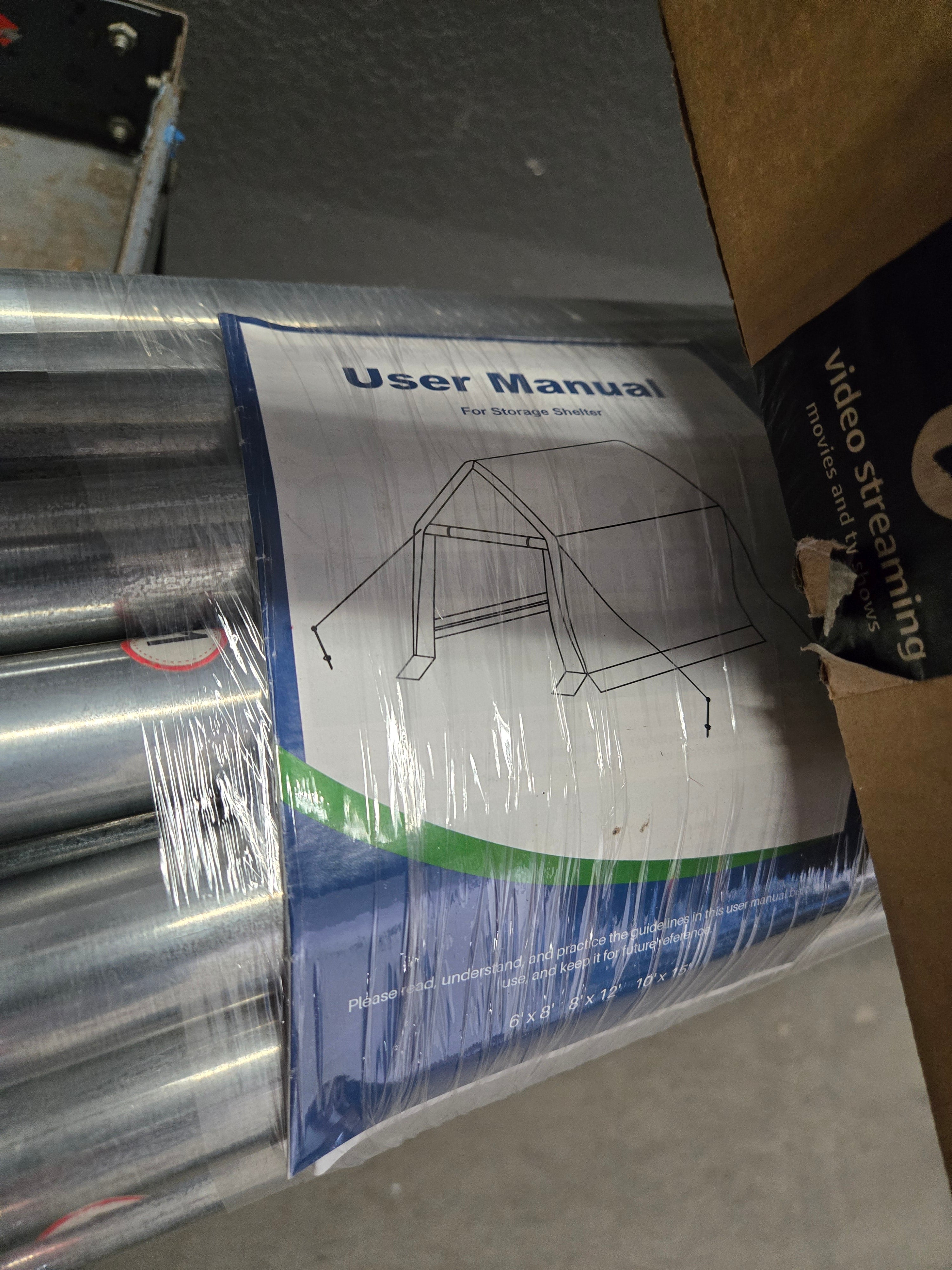 This storage shelter features a sturdy silver metal frame and a protective fabric cover. Ideal for outdoor storage needs, it can be used for storing tools, equipment, or vehicles. The shelter's sleek metallic finish provides a modern look, ensuring durability against weather conditions. Approximate Size: 6 x 8 x 12