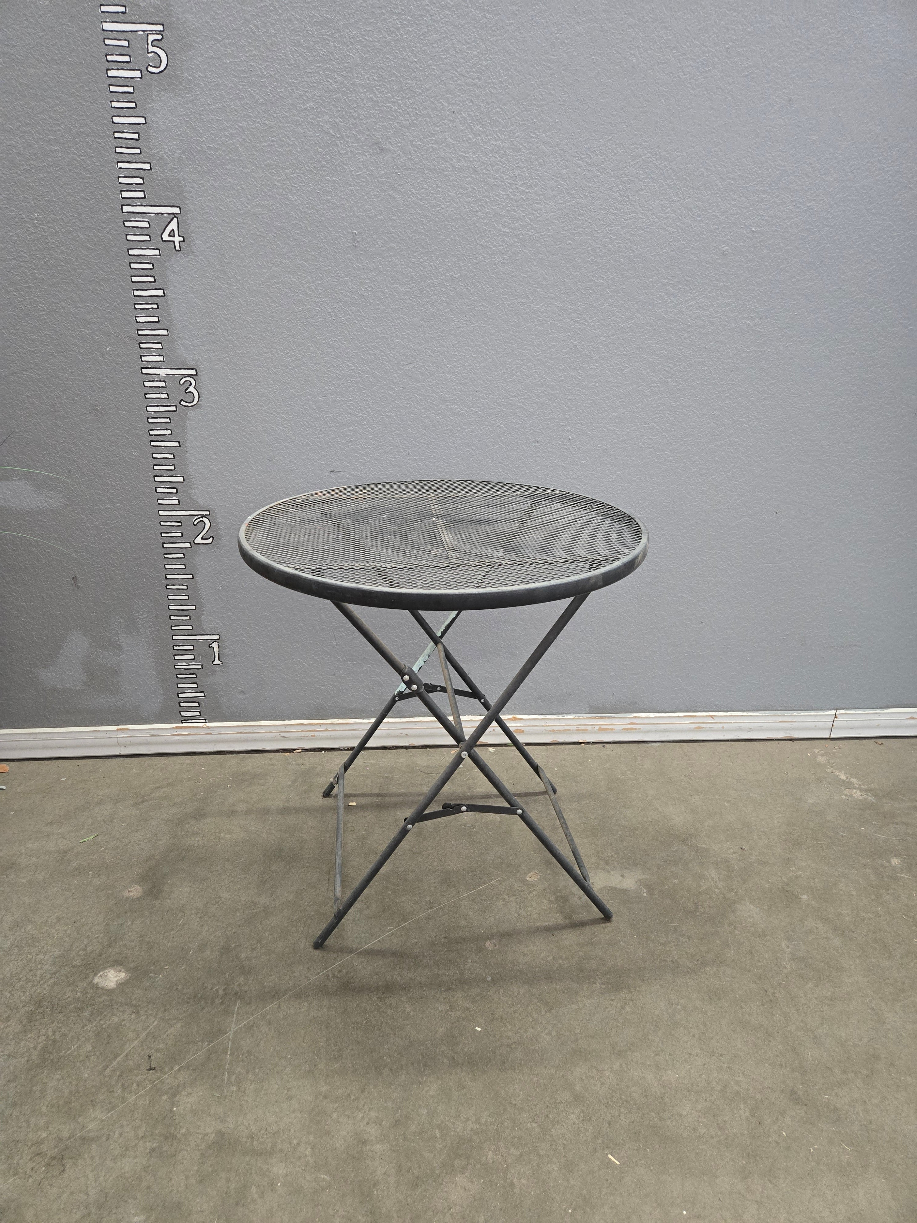 This sleek folding patio table features a round, steel mesh top with a durable gray finish, perfect for outdoor use. Approximate Size: 2.5 x 2 x 2