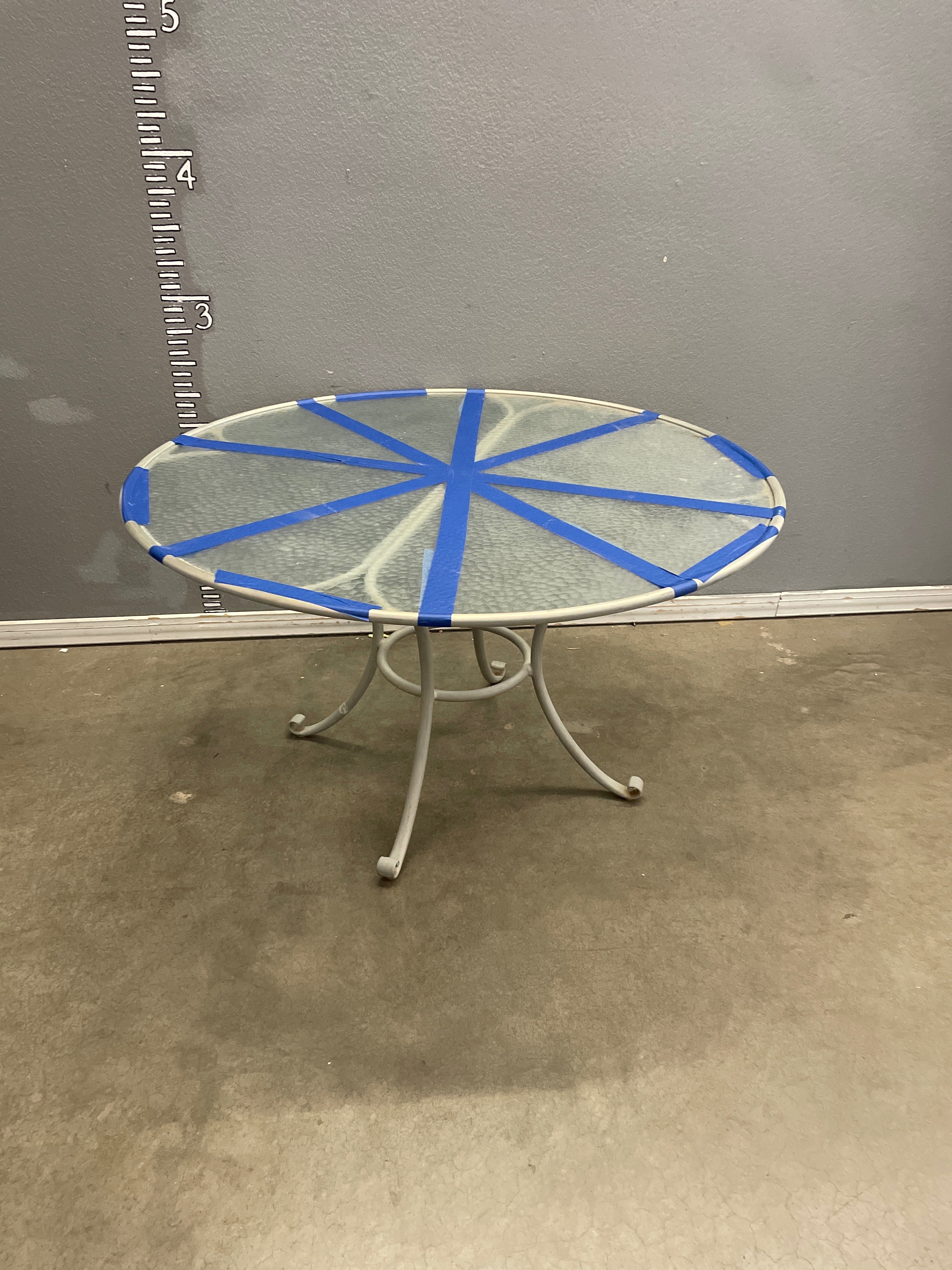 This is a round patio table with a clear glass top and a light gray metal frame. The metal finish is smooth and weather-resistant, making it ideal for outdoor use. Approximate Size: 3 x 3 x 3