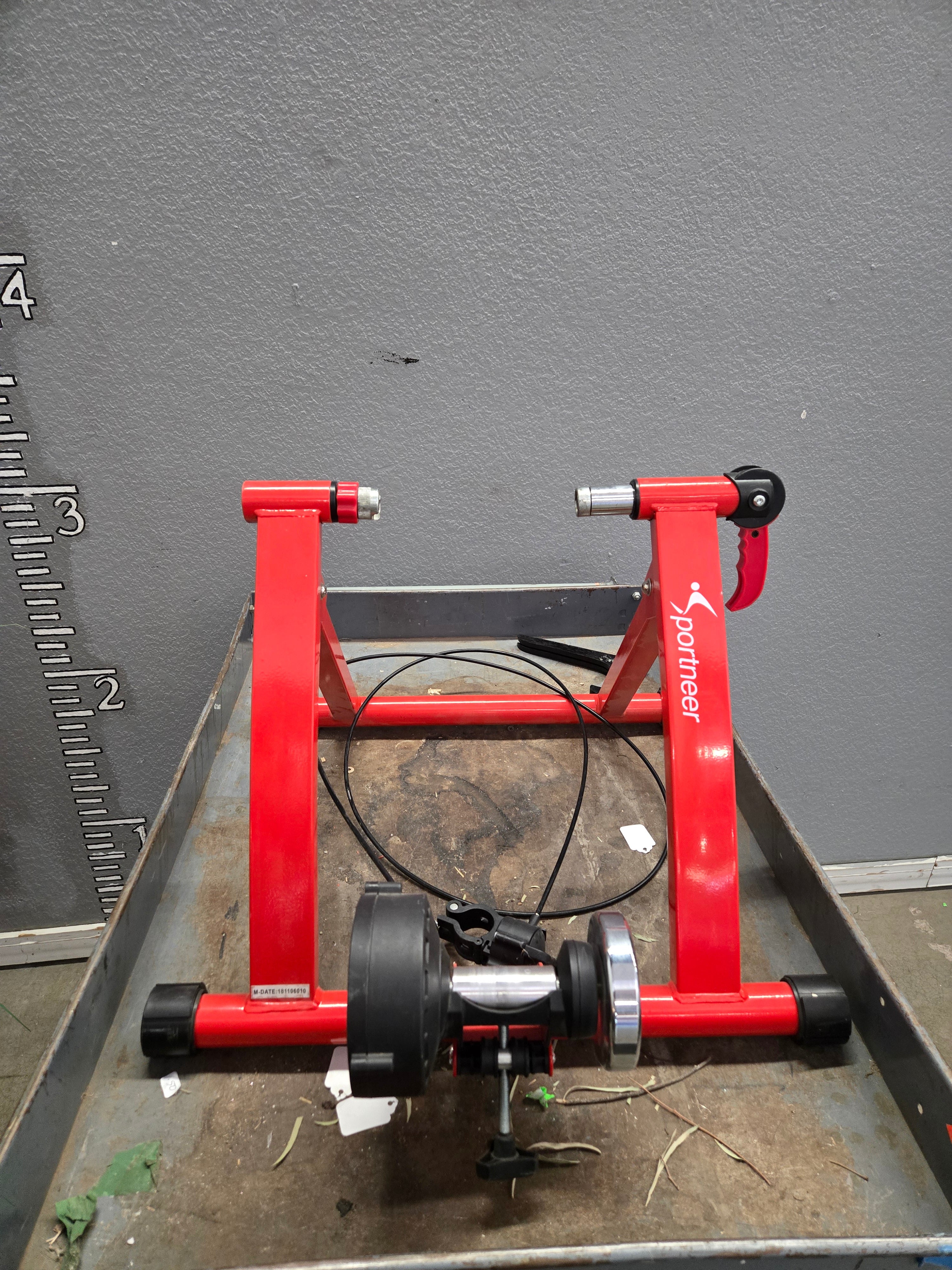 This is a sturdy indoor bicycle trainer stand with a vibrant red finish. It features a robust metal frame that ensures stability during your indoor cycling sessions. Approximate Size: 1.5 x 2 x 1.5