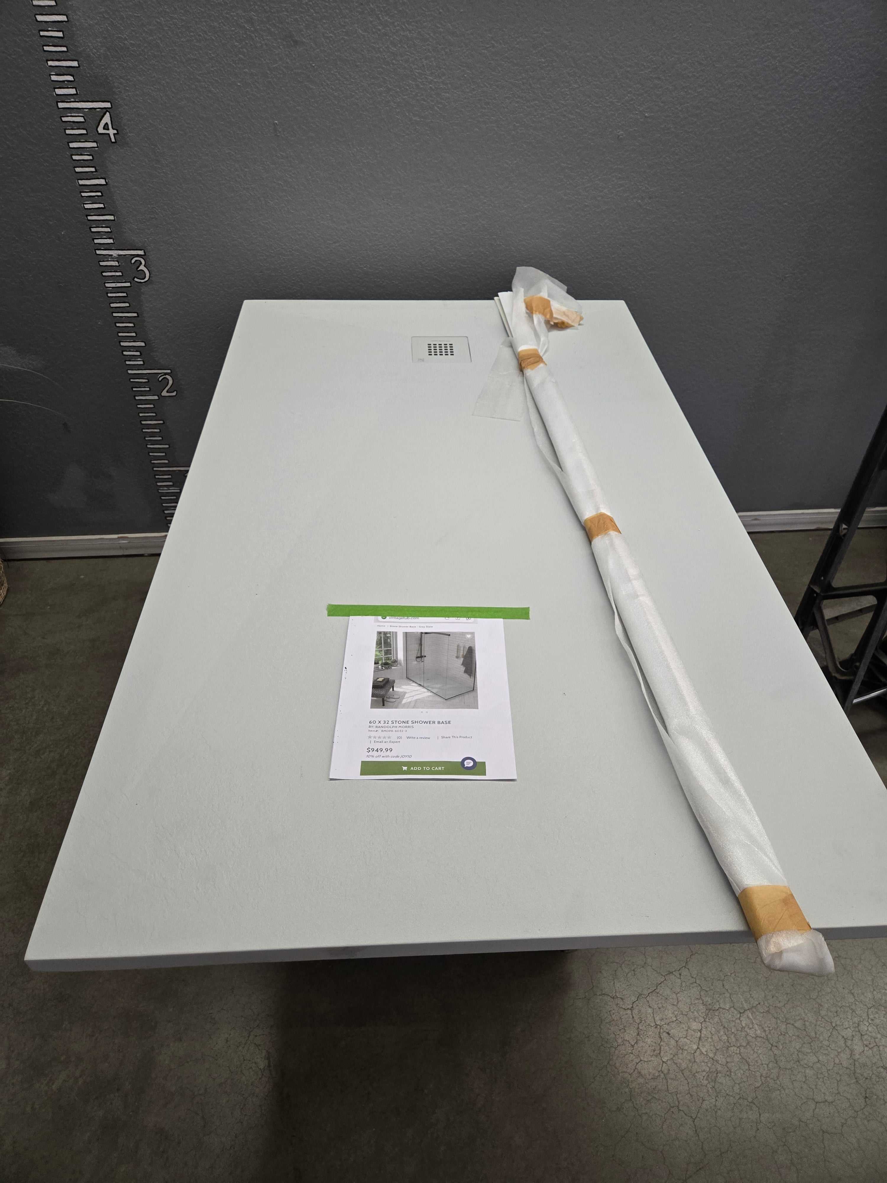This shower base features a sleek white finish, providing a modern aesthetic to any bathroom. Durable and resistant to wear, it ensures long-lasting performance. Approximate Size: 0.5 x 3.3 x 2.7