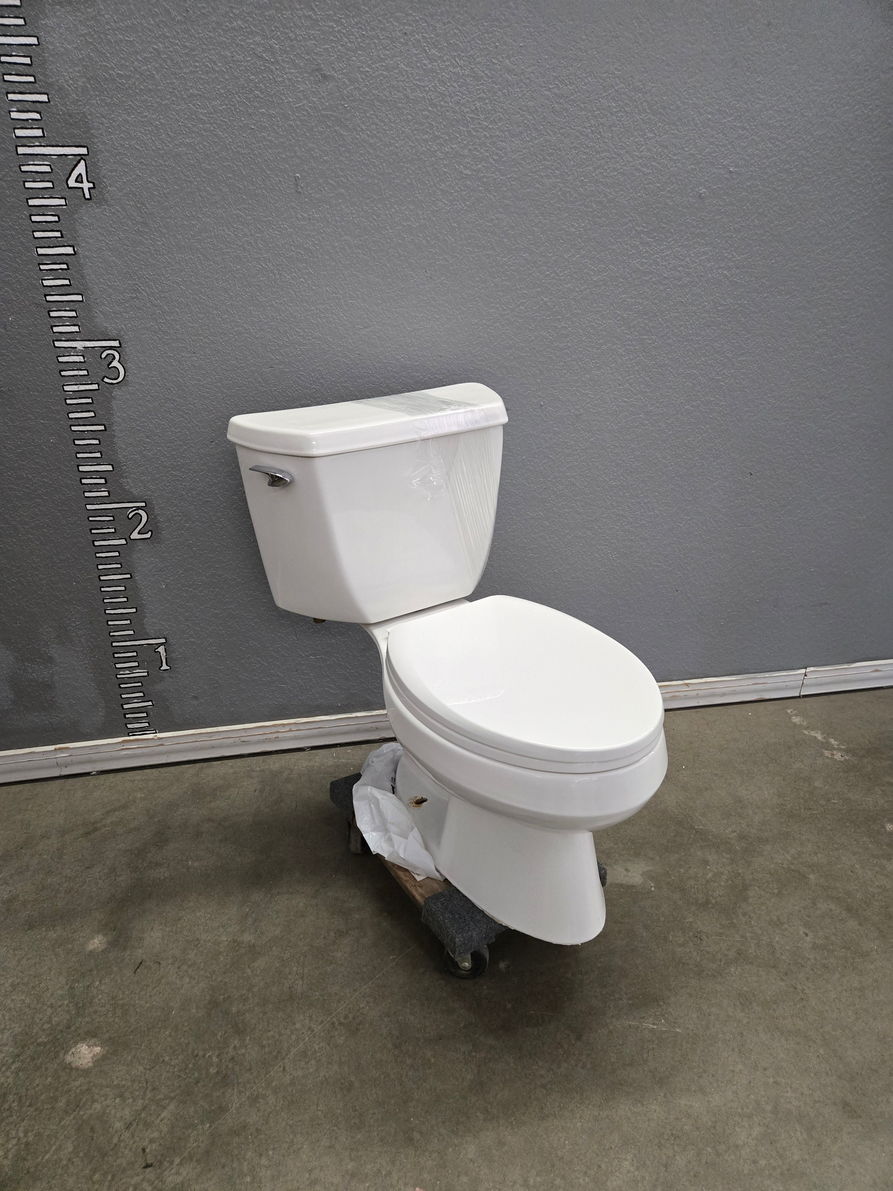 This is a classic white ceramic toilet with a smooth, glossy finish. It features a two-piece design with a standard tank and bowl configuration, perfect for any bathroom setting. Approximate Size: 2.5 x 1.5 x 2.5