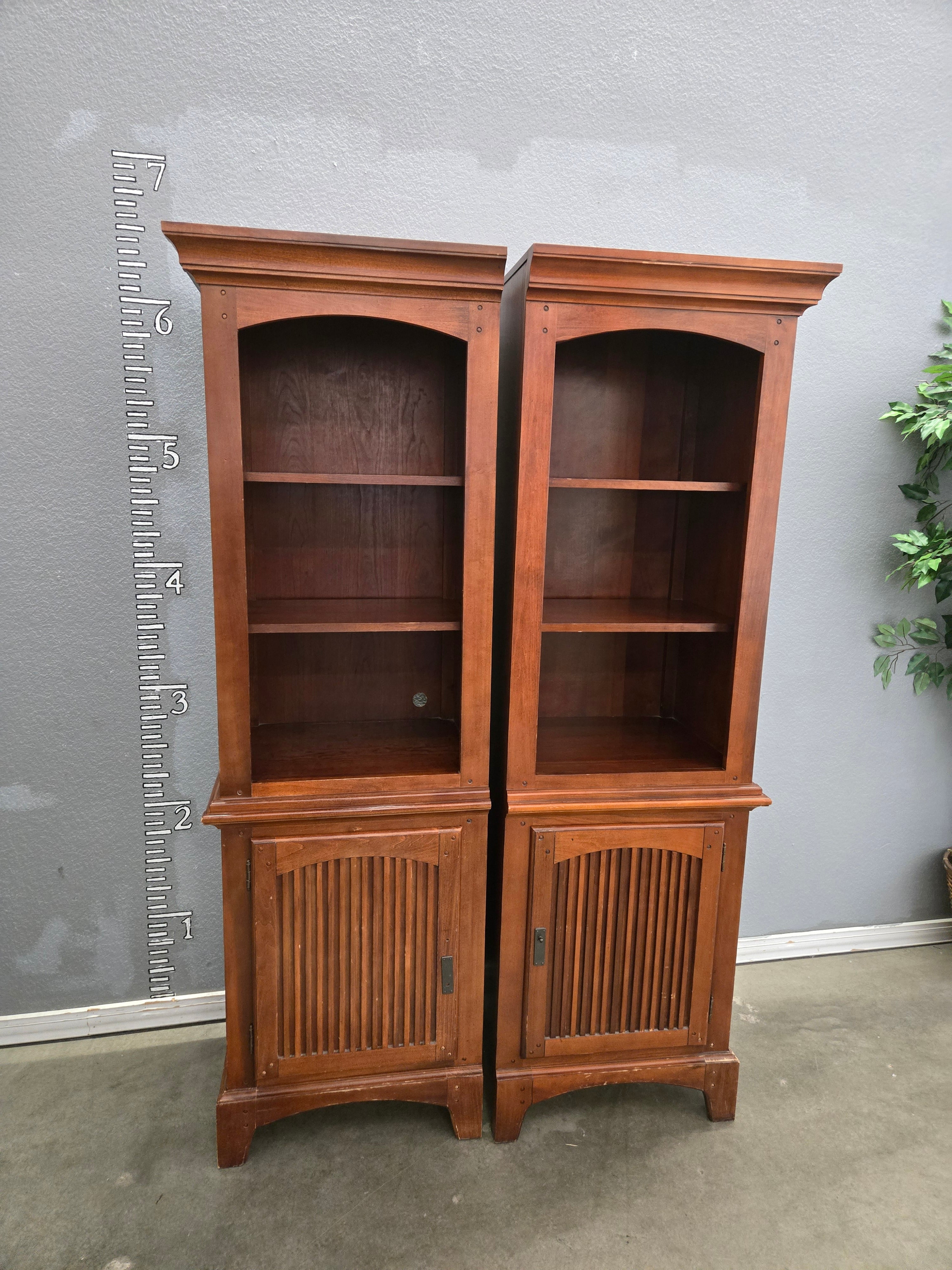 This elegant cabinet set features a rich brown wood finish with a smooth, polished surface. The cabinets have open shelving for display and closed storage with louvered doors. Approximate Size: 7 x 4 x 1.5