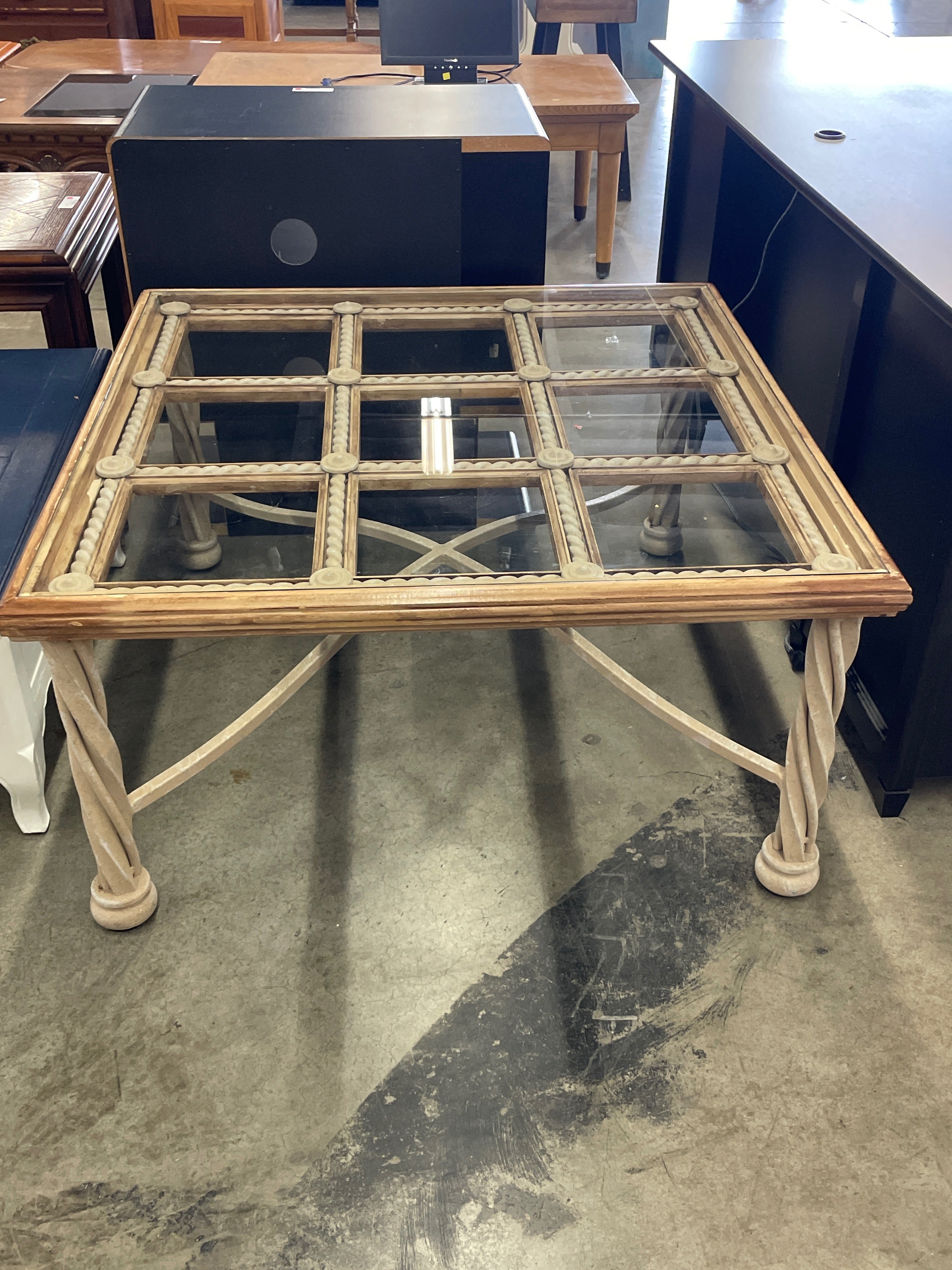 This charming coffee table features a rustic wooden frame with a grid design and a clear glass top, showcasing intricately twisted legs. The light wood finish complements a variety of decor styles, adding a touch of elegance to your living space. Approximate Size: 2.5 x 3 x 3